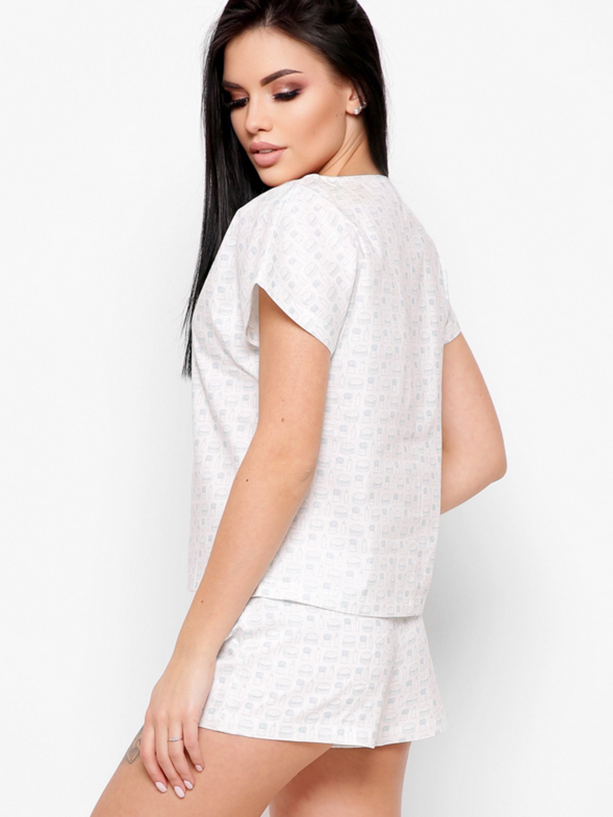 Милый принтованый костюм состоящий из футболки и шорт. Футболка свободного кроя с обьемными рукавами и мини шорты с поясом-резинкой идеально подойдут на тот случай, когда в замешательстве что надеть. За счет стильного принта вещи можно носить как в комплекте, так и по отдельности.