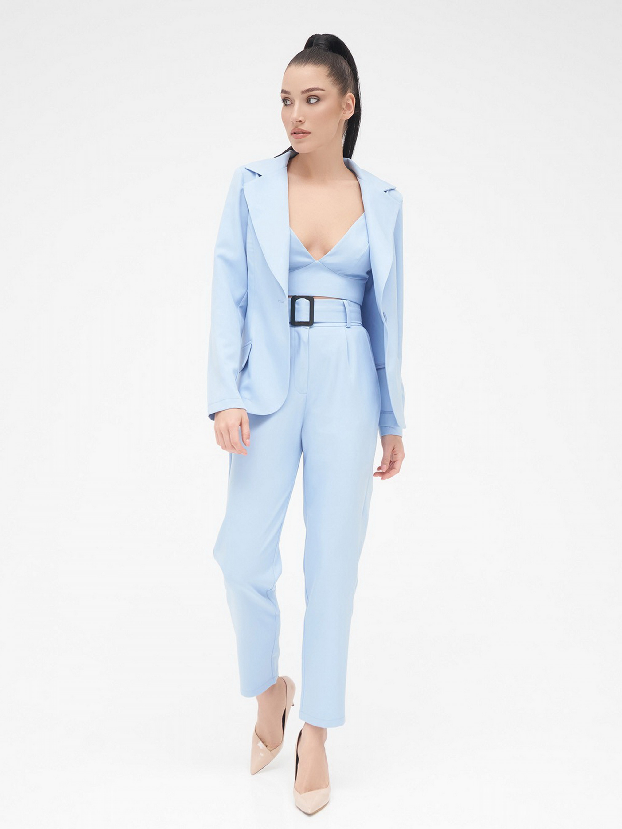 Трендовый костюм тройка выполненный из однотонной костюмной ткани. Пиджак с пуговицей декорирован воротником и клапанами. Модель приталенного кроя с длинными рукавами. Высокие классические брюки с зауженным к низу кроем и съемным поясом. Модель с карманами застегивается на молнию и пуговицы. Топ на бретельках с широким эластичным поясом сзади. Бретельки изделия регулируются по длине. Полуобхват: Пиджак: Грудь: S (44), M (46), L (48), XL (50), Длина изделия - 61, Рукав - 61, Топ: Грудь: S (42), M (44), L (46), XL (48), Длина изделия - 34, Брюки: Талия: S (32), M (34), L (36), XL (38), Бедра: S (50), M (52), L (54), XL (56), Длина - 103, внутренний шов - 72.