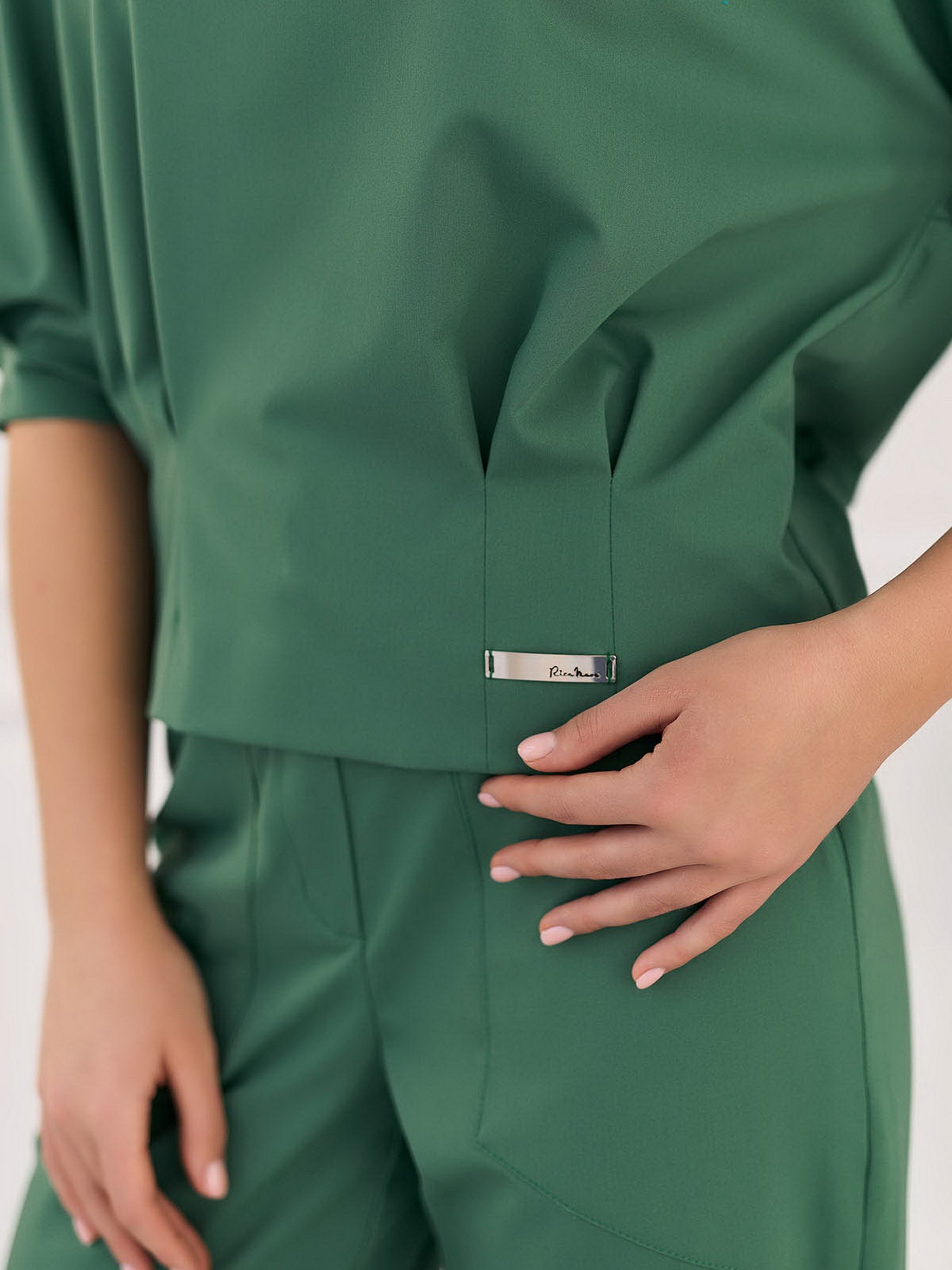 Брюки длиной 7/8 с завышенной линией талии свободного кроя, зауженные книзу, с защипами по краю штанин, с акцентными карманами. Укороченная блуза оверсайз интересного дизайна со спущенной линией плеча и объемными рукавами с акцентным V-образным вырезом. Состав: cotton 50%, viscose 45%, polyester 5%. Параметры размеров: Охват груди: XS - 84; S - 88; М - 92; L - 96; XL - 100. Охват талии: XS - 64; S - 68; М - 72; L - 76; XL - 80. Охват бедер: XS - 92; S - 96; М - 100; L - 104; XL - 108. Размер на модели S.