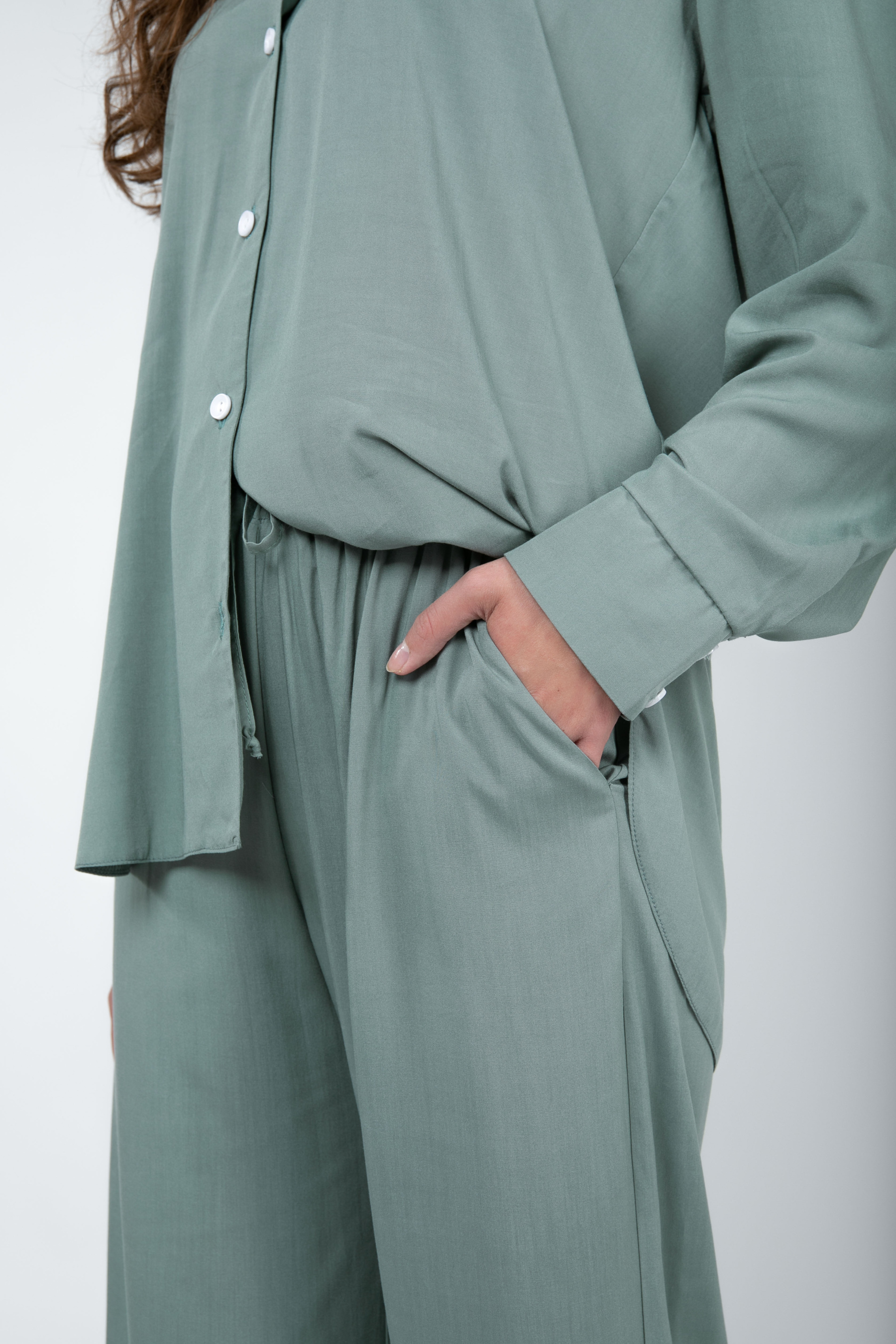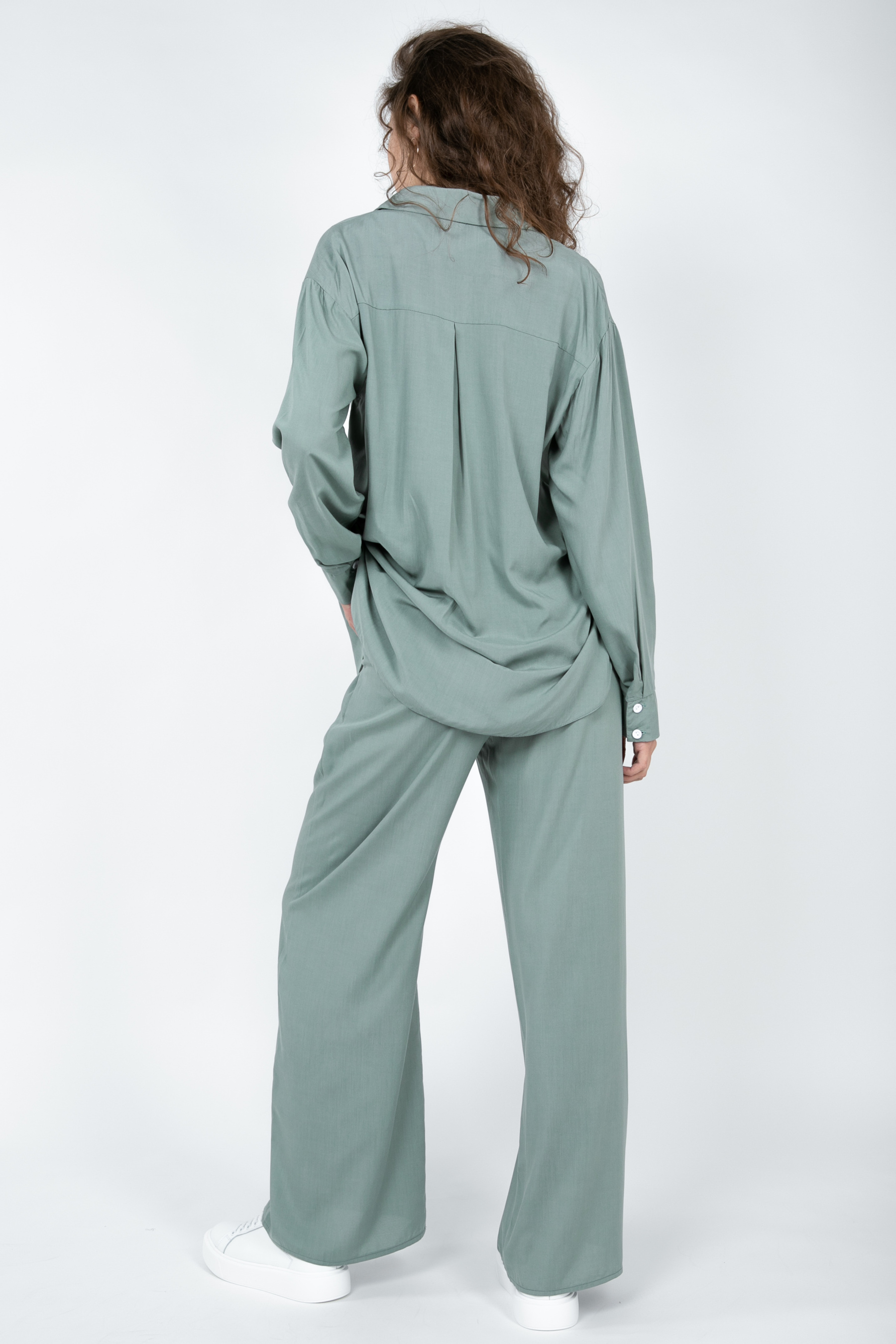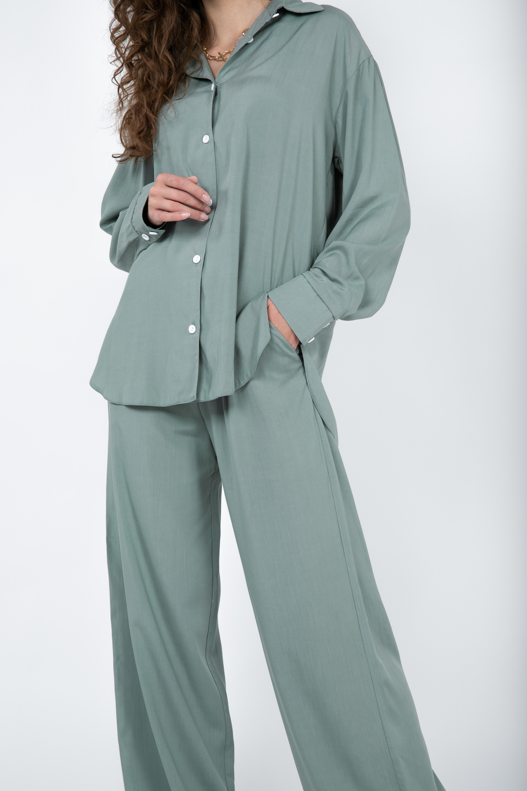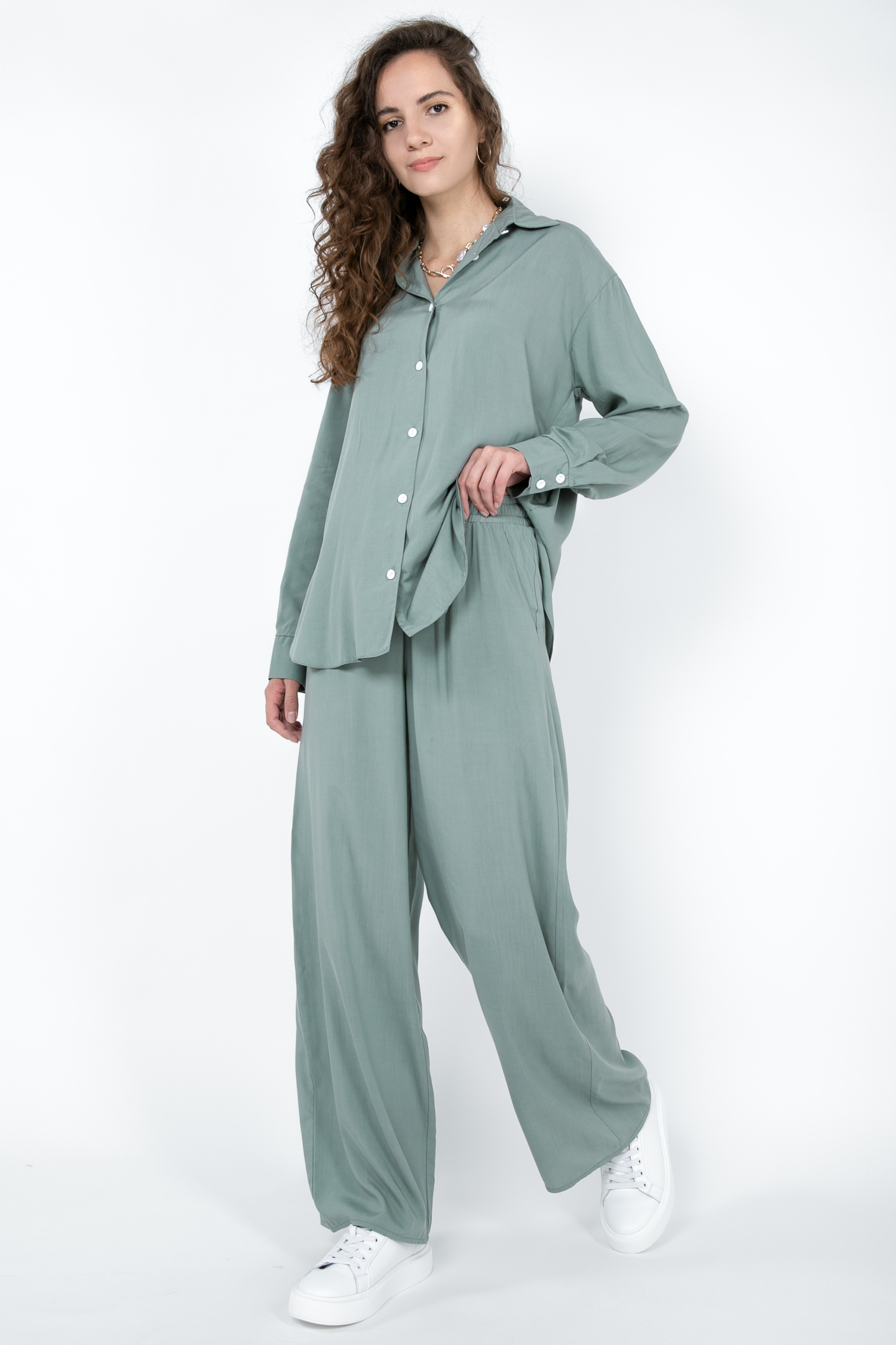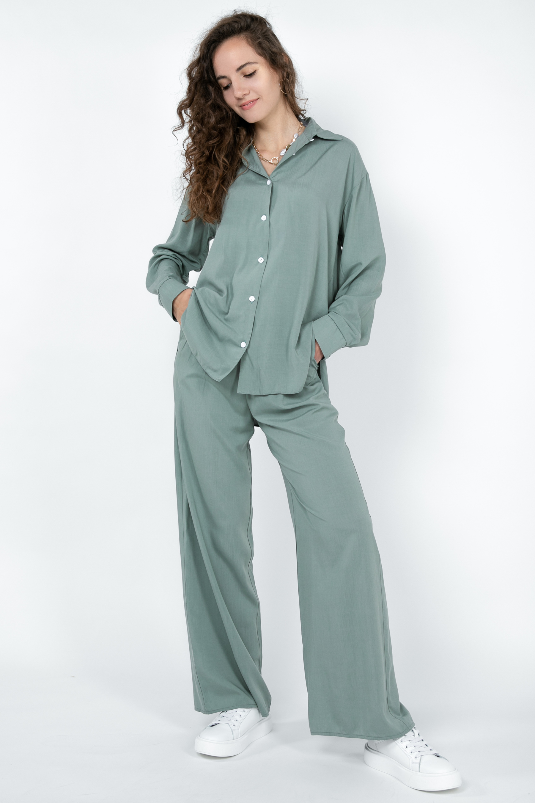 Комплект Тенерифе из новой костюмной ткани. Комплект свободного фасона с рубашки и брюк. Нежная костюмная ткань приятная к телу, имеет незначительную фактуру в виде диагонали. Пуговицы в цвет к основному материалу. В брюках есть карманы, талия на резинке. Рекомендуем носить вместе и по отдельности с другими элементами гардероба. XS|S: Рубашка: длина по спинке 76 см, длина рукава от плеча 57,5 см, полуобхват груди 54,5 см, плечи 48 см. Штаны: длина 106 см, полуобхват талии 40 см, полуобхват бедер 55 см, посадка 32 см. S|M:Рубашка: длина по спинке 76 см, длина рукава от плеча 58,5 см, полуобхват груди 54,5 см, плечи 50 см. Штаны: длина 106 см, полуобхват талии 45 см, полуобхват бедер 58 см, посадка 34 см. M|L:Рубашка: длина по спинке 76 см, длина рукава от плеча 58,5 см, полуобхват груди 60 см, плечи 50 см. Штаны: длина 106 см, полуобхват талии 46 см, полуобхват бедер 58 см, посадка 34 см.