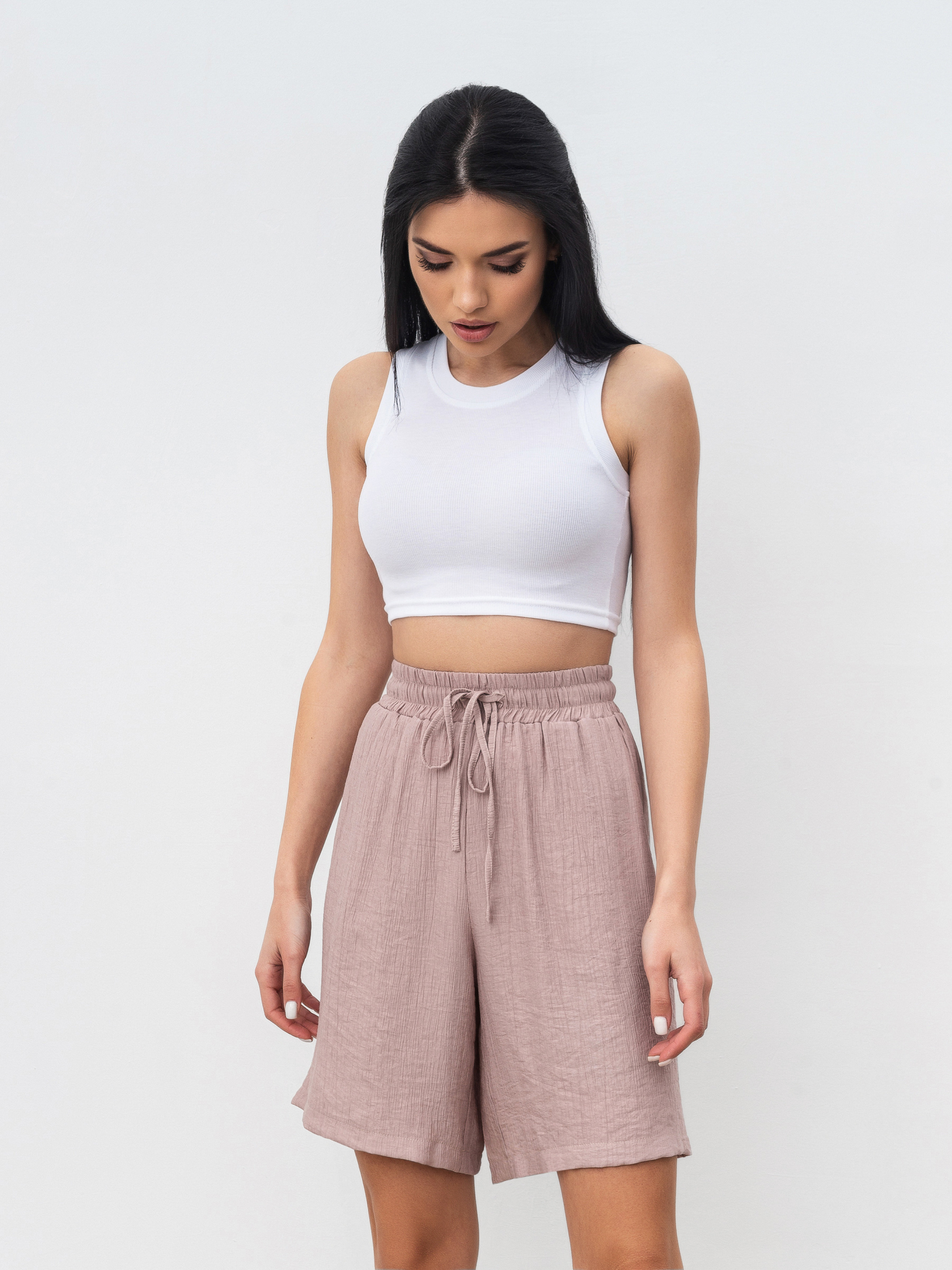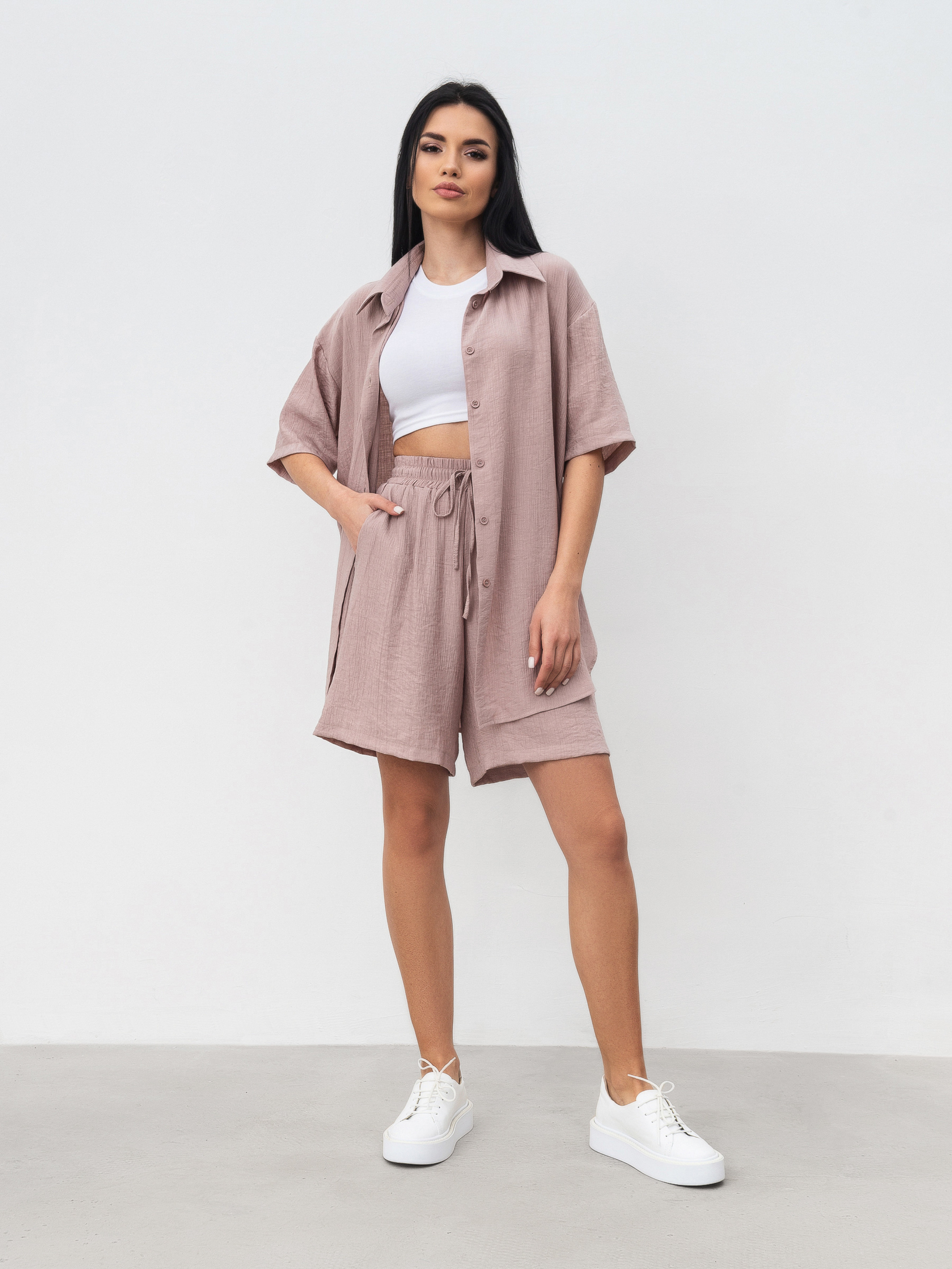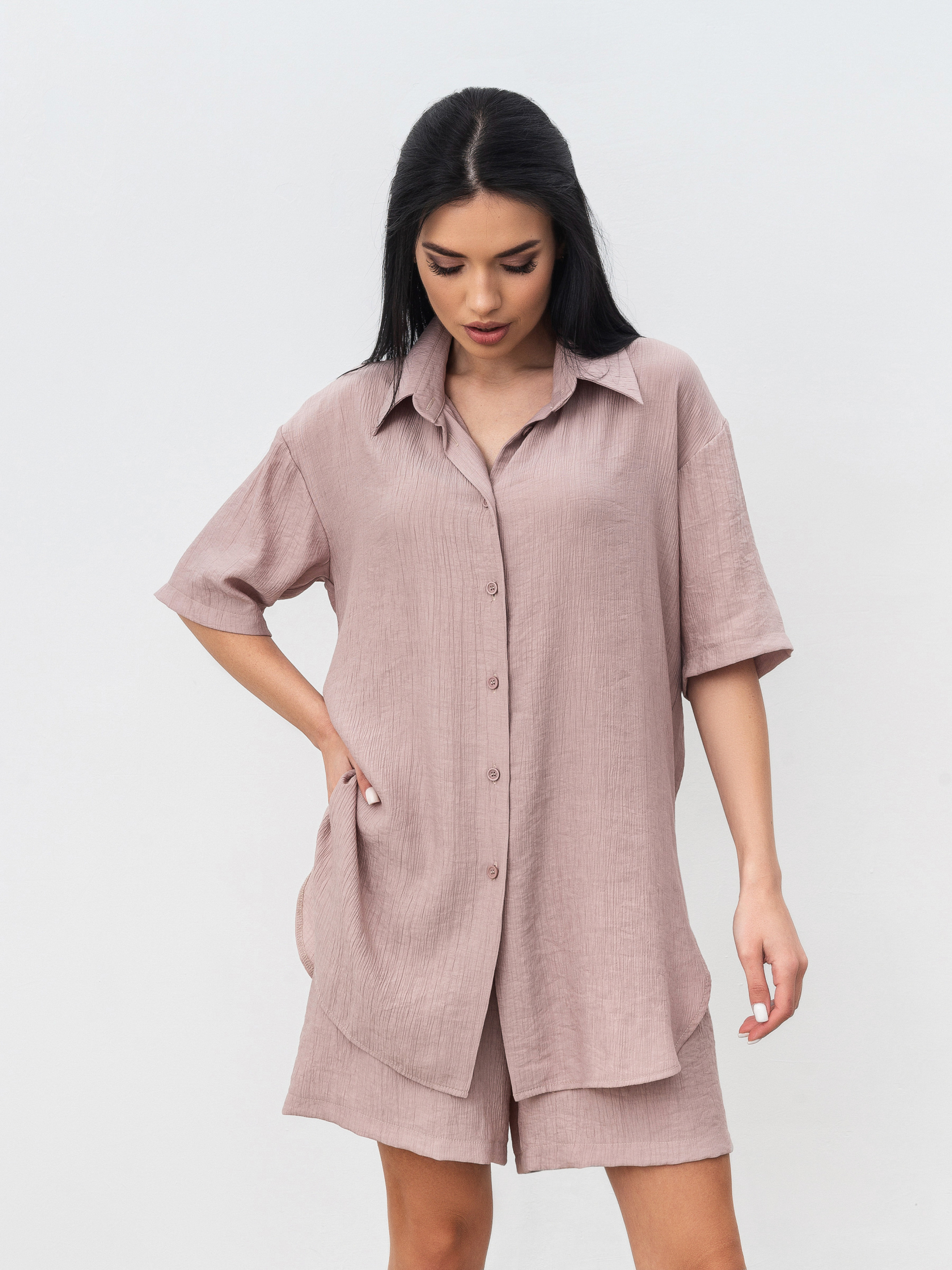 Комплект из рубашки и шорт с завышенной талией. Легкий материал плиссированная вискоза. Шорты с завышенной посадкой, карманами, на резинке и с дополнительными завязками. Рубашка удлиненная свободного фасона. Идеальный легкий комплект на лето. Можно разделять и носить с другими элементами из гардероба. XS-S : Длина по внешнему шву : 49 см Длина по спине : 80 см Длина рукава : 23 см Полуобхват груди: 57 см Полуобхват бедер : 57 см Плечи : 52 см Посадка : 32 см Полуобхват талии : 28 см S-M : Длина по внешнему шву: 49 см Длина по спине: 80 см Длина рукава : 24 см Полуобхват груди: 57 см Полуобхват бедер : 57 см Плечи : 52 см Посадка : 33 см Полуобхват талии : 28 см M-L : Длина по внешнему шву : 50 см Длина по спине: 81 см. Длина рукава : 24 см Полуобхват груди: 60 см Полуобхват бедер : 58 см Плечи : 55 см Посадка : 35 см Полуобхват талии: 30 см
