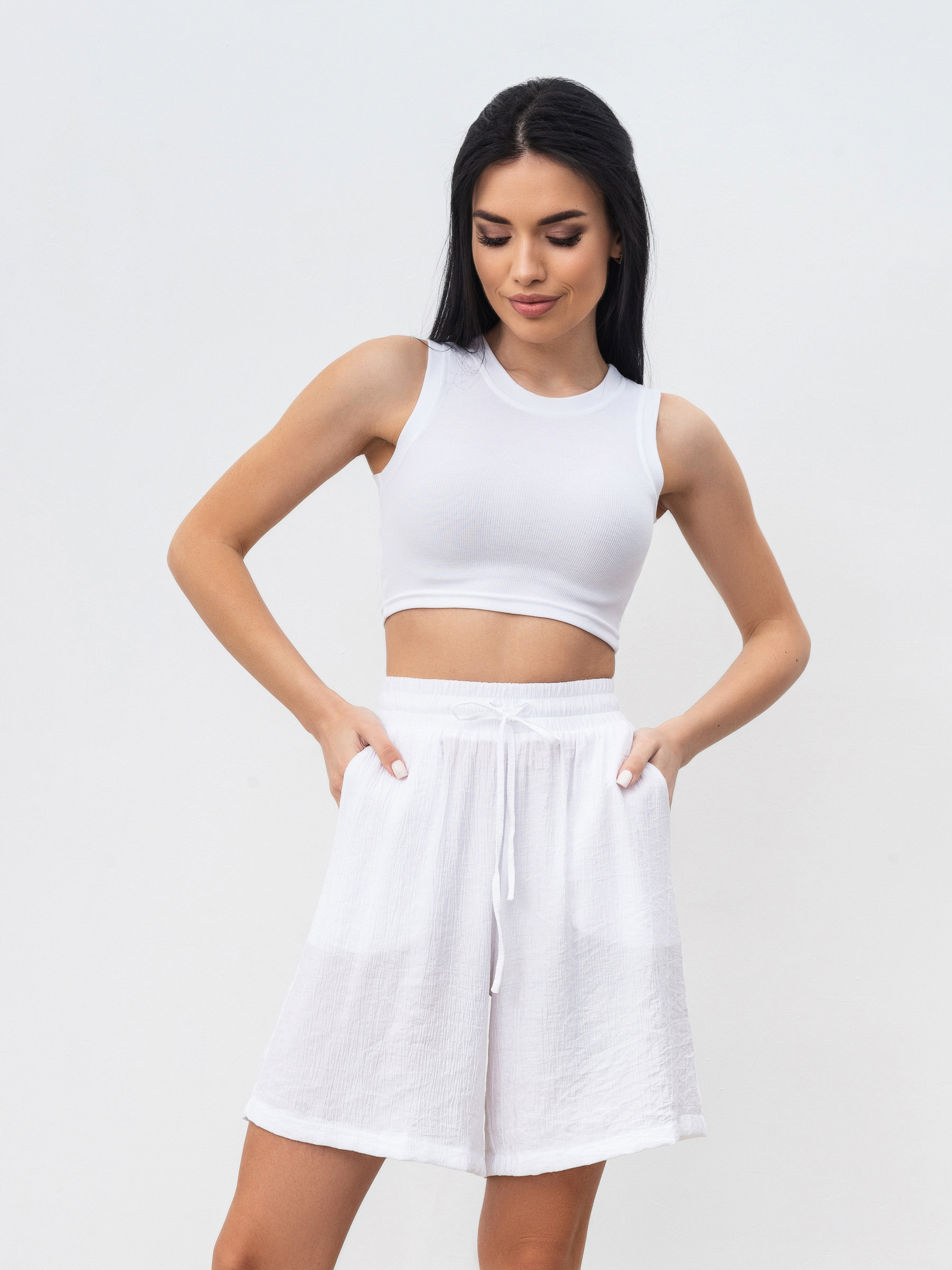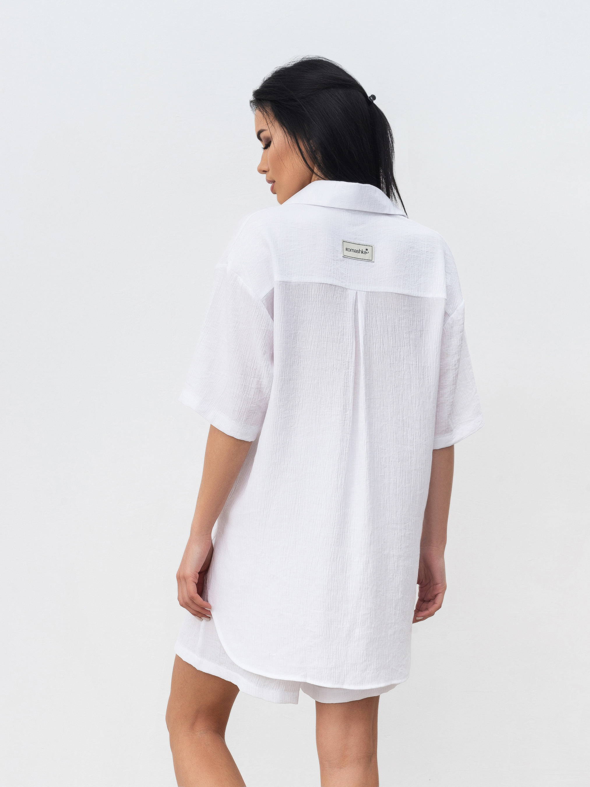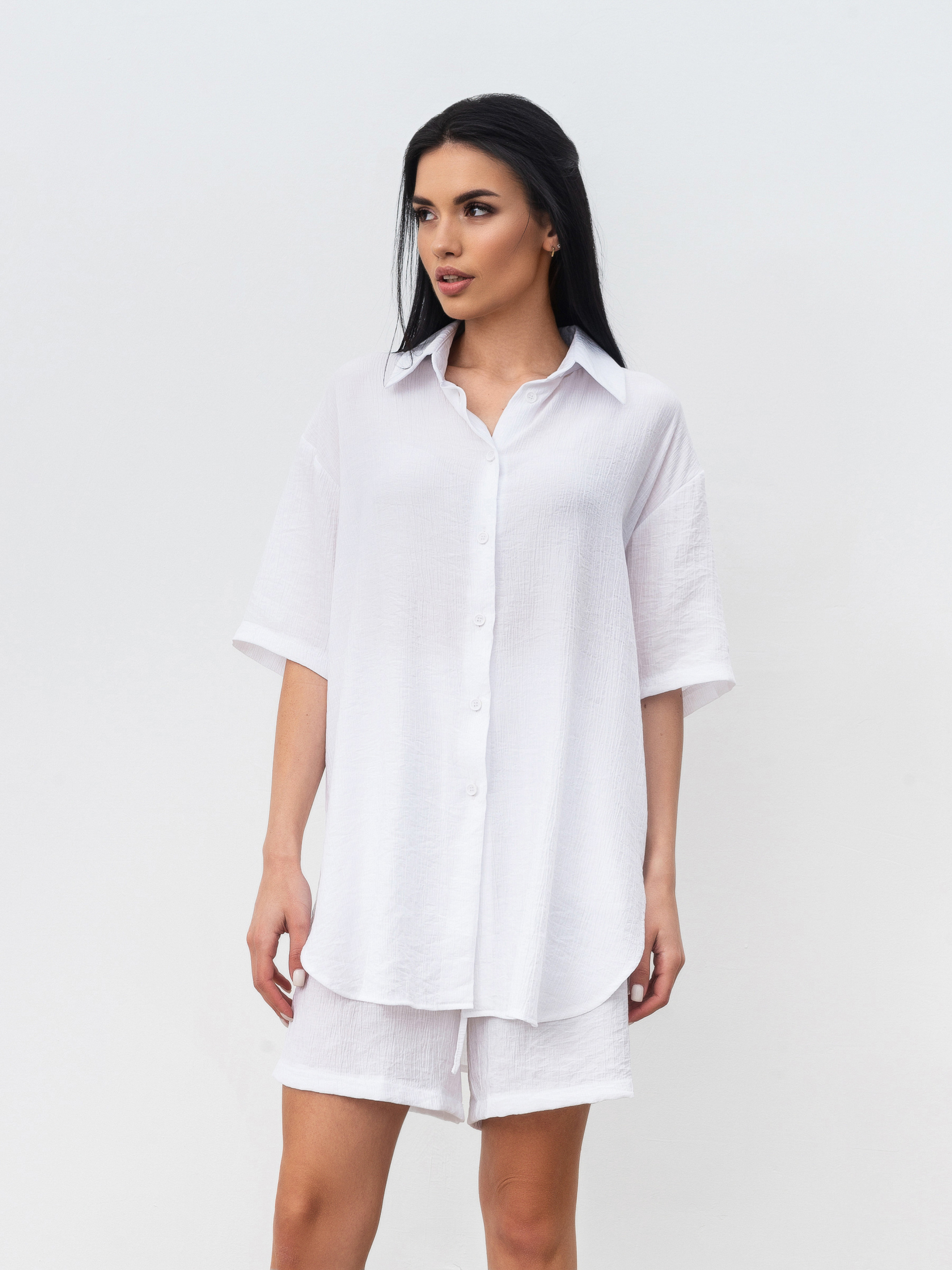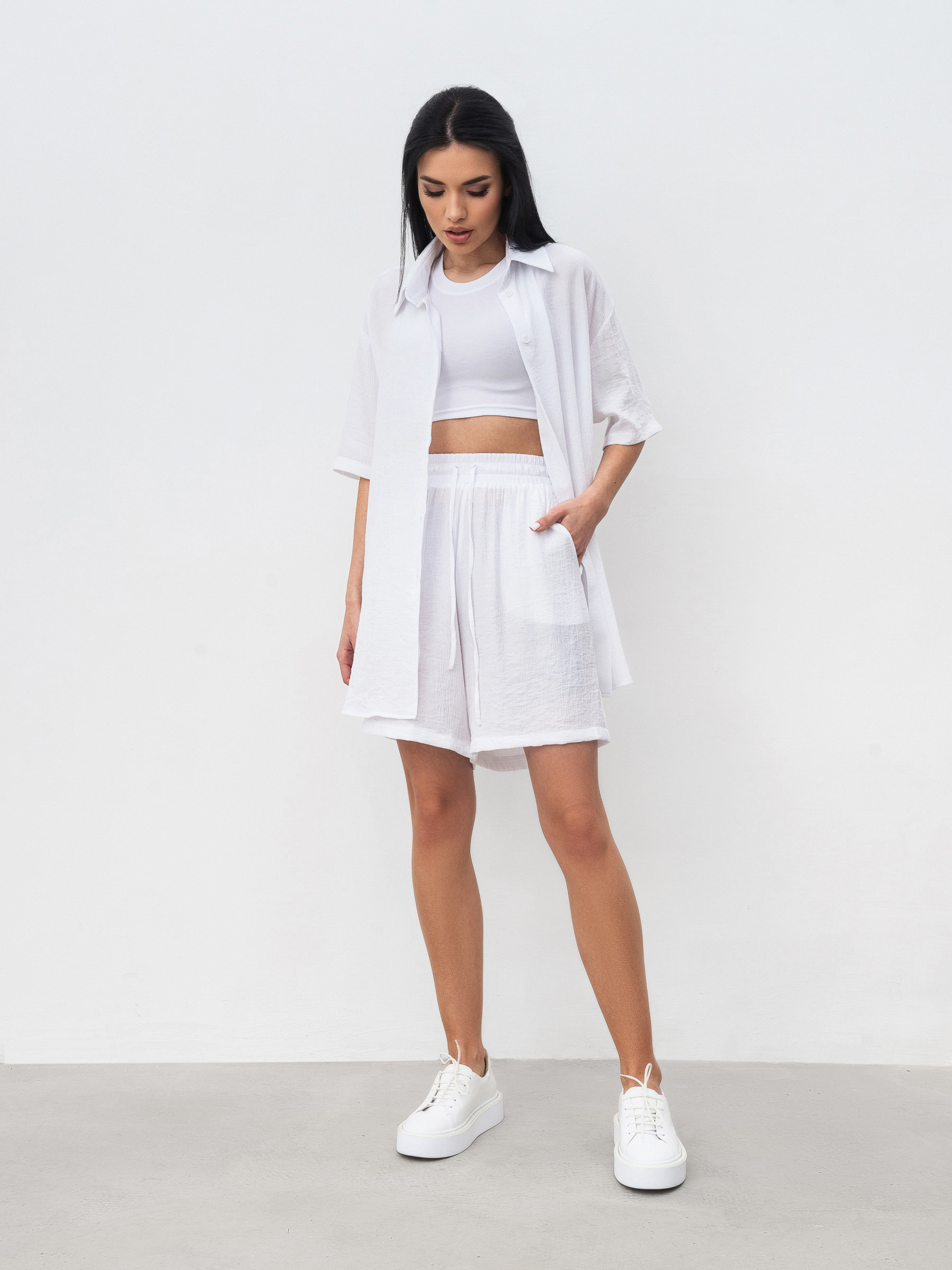 Комплект из рубашки и шорт с завышенной талией. Легкий материал плиссированная вискоза. Шорты с завышенной посадкой, карманами, на резинке и с дополнительными завязками. Рубашка удлиненная свободного фасона. Идеальный легкий комплект на лето. Можно разделять и носить с другими элементами из гардероба. XS-S : Длина по внешнему шву : 49 см Длина по спине : 80 см Длина рукава : 23 см Полуобхват груди: 57 см Полуобхват бедер : 57 см Плечи : 52 см Посадка : 32 см Полуобхват талии : 28 см S-M : Длина по внешнему шву: 49 см Длина по спине: 80 см Длина рукава : 24 см Полуобхват груди: 57 см Полуобхват бедер : 57 см Плечи : 52 см Посадка : 33 см Полуобхват талии : 28 см M-L : Длина по внешнему шву : 50 см Длина по спине: 81 см. Длина рукава : 24 см Полуобхват груди: 60 см Полуобхват бедер : 58 см Плечи : 55 см Посадка : 35 см Полуобхват талии: 30 см
