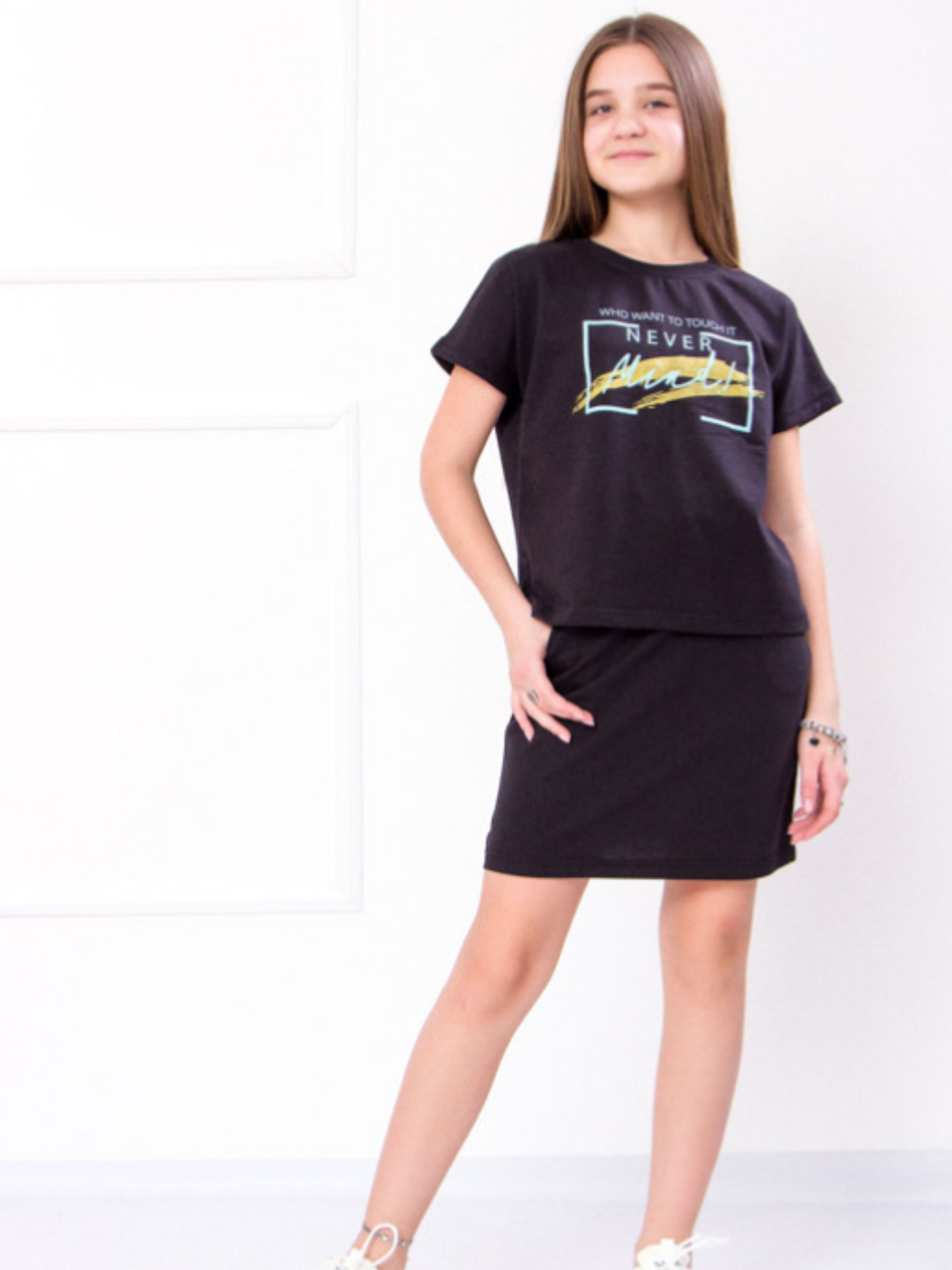 Полотно: двонитка Склад полотна: 80% бавовни 20% поліестру Зріст: 140-152 Чудовий святковий look для сучасної модниці - комплект від відомого українського бренду «Носи Своє". Комплект представлений в модній кольоровій гамі виглядає оригінально і дуже ефектно. Костюм складається з футболки та спідниці. Футболка вільного крою зі спущеним рукавом. Спереду красується текстовий принт. Спідниця не менш ефектна має рівний крій дві бічні кишені. Костюм дуже зручний він не обмежує рухів дозволяючи грати і танцювати так активно як хочеться. Для пошиття костюма використано змішане полотно - двунитка в складі якого містяться волокна синтетичного еластану. Така тканина найбільше підходить для створення дитячих речей оскільки володіє важливими характеристиками: повітропроникністю гігроскопічністю міцністю еластичністю і зносостійкістю. Догляд: прання в теплій воді до 40 ° з нейтральними миючими засобами; прасування з вивороту злегка нагрітою праскою (не вище 100 °). При пранні не використовуйте засоби що містять відбілювач.