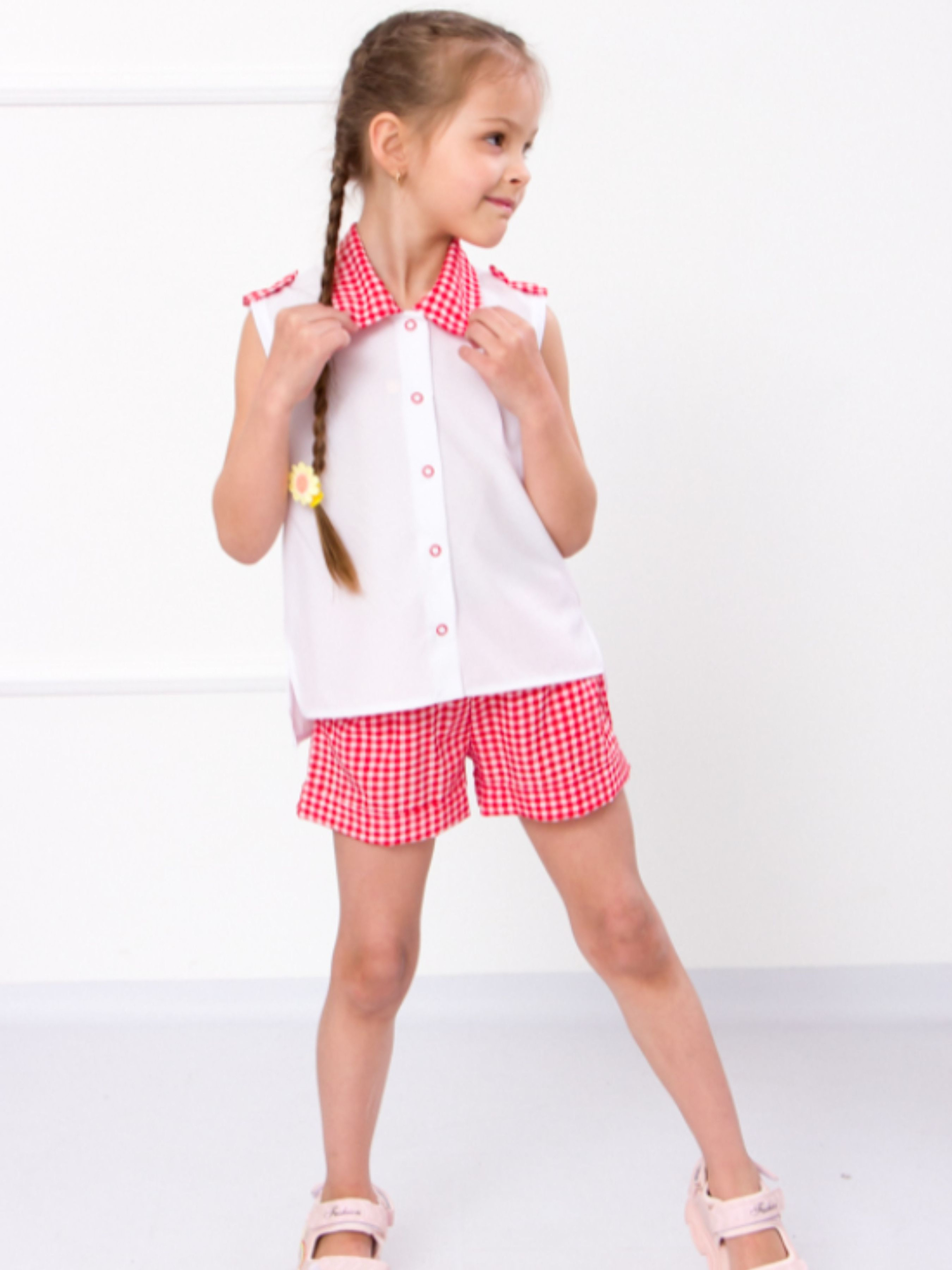 Полотно: софт набивний Склад полотна: 20% бавовни 80% поліестр Зріст: 98 Для маленьких модниць пропонується цікава модель - "двоєчка". Тонка стрейчева тканина додасть комфортність при носінні. Комплект складається з кофтинки на застібці з кнопками виконаний з однотонної тканини. Обробкою є закруглений комір із злегка поглибленим вирізом і нагону з кнопкою. Тут тканина кольорова строката як і на шортах. Низ кофтинки не рівний перед коротше від спинки на 5-7 см. в бічному шві маленькі розрізи. Шорти з такої ж кольорової тканини як обробка на кофті. Вони вільного крою короткі з кишенями по бічному шву. Низ шорт закінчується манжетом пояс притачний на резинці. Шорти і кофточка чудово гармонують в поєднанні.