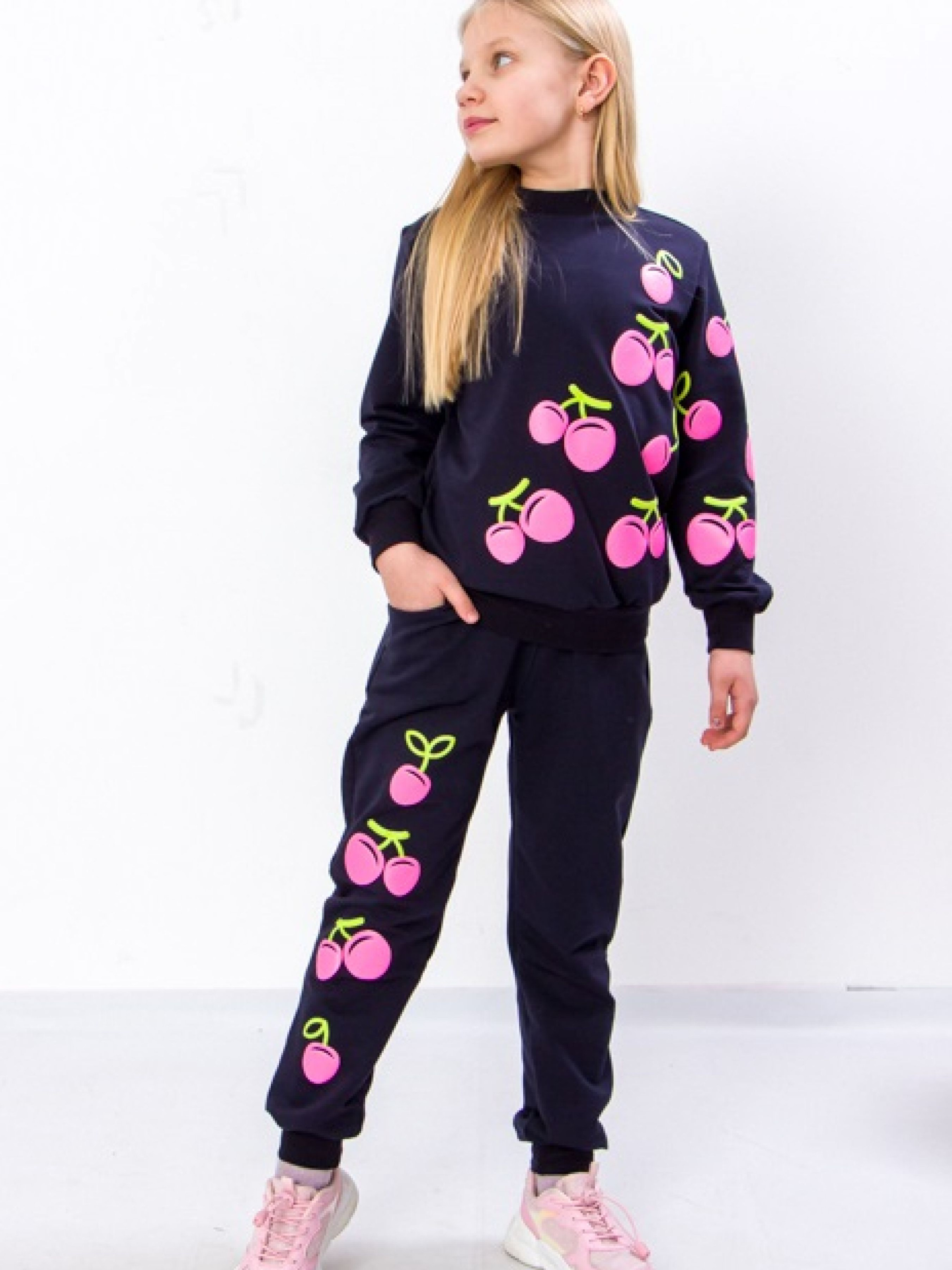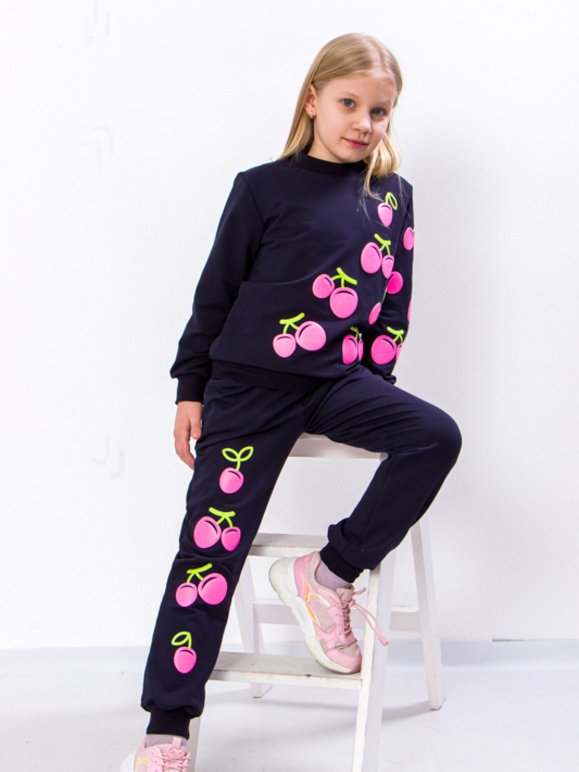 Полотно: двонитка однотонна Склад полотна: 80% бавовна 20% поліестер Зріст: 98-128 Гарний темно-синій спортивний костюм для дівчинки від компанії Носи Своє складається з високоякісної бавовни і 10% еластану тому володіє відмінною ізносостійкістью довговічністю і приємною тактильністю. Така комбінована тканина відмінно зберігає тепло зігріваючи ніжну дитячу шкіру і пропускає повітря. Кофта доповнена стрейчевими манжетами на рукавах горловині і по низу виробу особлива принадність - мерехтливий принт на рукавах і по переду виробу. Низ штанів оснащений еластичними вставками а пояс - гумкою яка забезпечує хорошу фіксацію але не тисне. Оригінальний стильний дизайн і зручний крій костюма допоможе дівчинці відчувати себе модною привабливою і впевненою в собі. Догляд: дбайливе прання при t не більше 30С; прасувати при t не більше 110С з вивороту трохи вологим; сушка без віджиму на горизонтальній площині; хімічне чищення заборонене.