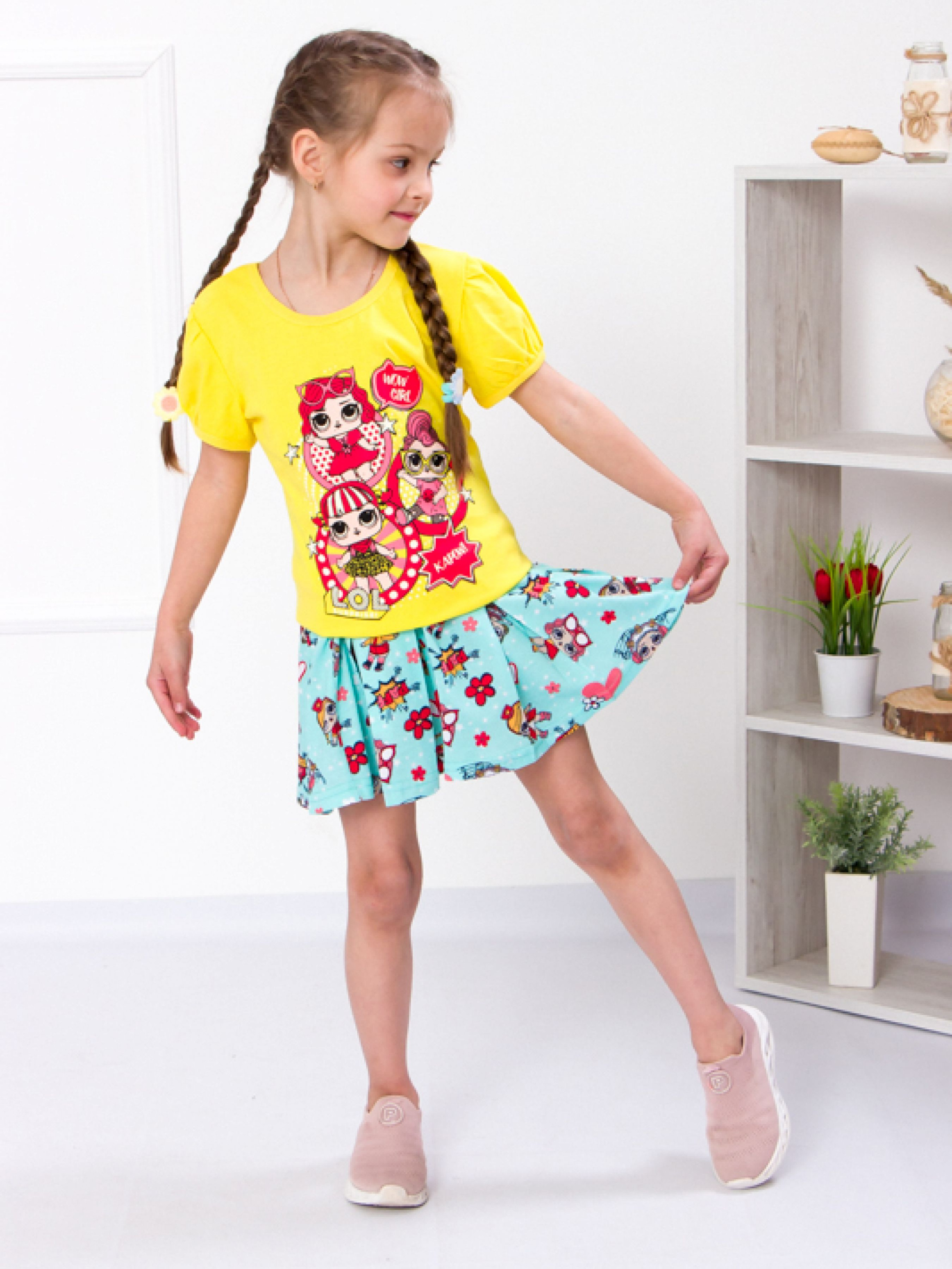 Полотно: кулір однотонний кулір набивний Склад полотна: 100% бавовна Зріст: 98-134 Чудовий комплект для дівчинки (спідниця + футболка) підійде і для урочистих заходів і для щоденних прогулянок. Модель виконана в комбінації набивного і однотонного куліру. Кулір вважається найтоншим трикотажним полотном. Одяг з нього виходить легким. Футболка з рукавами-ліхтариками прикрашена барвистим накатом. Спідничка фіксується на талії еластичною резинкою. Така універсальна річ ніколи не стане зайвою в дитячому гардеробі.