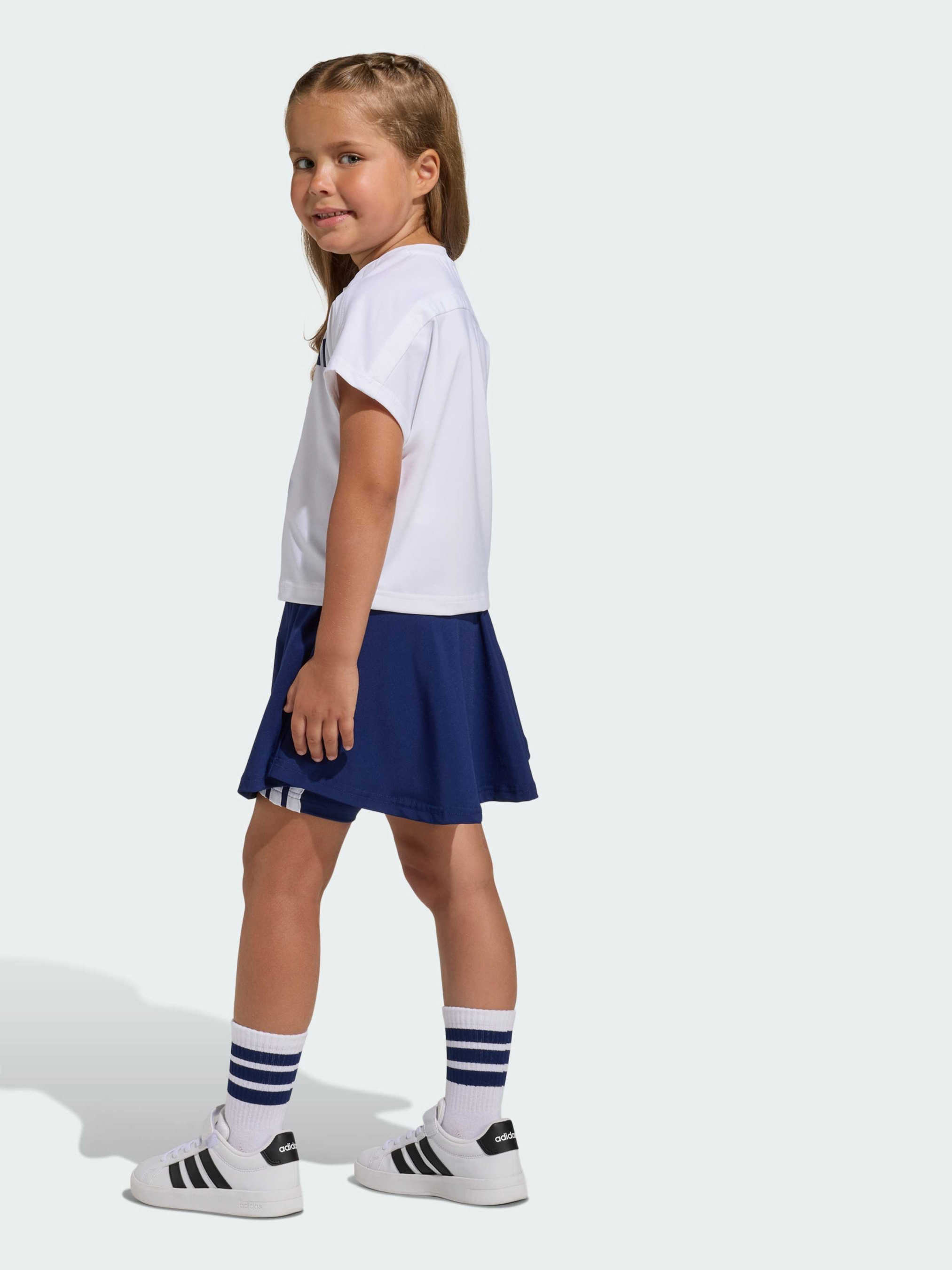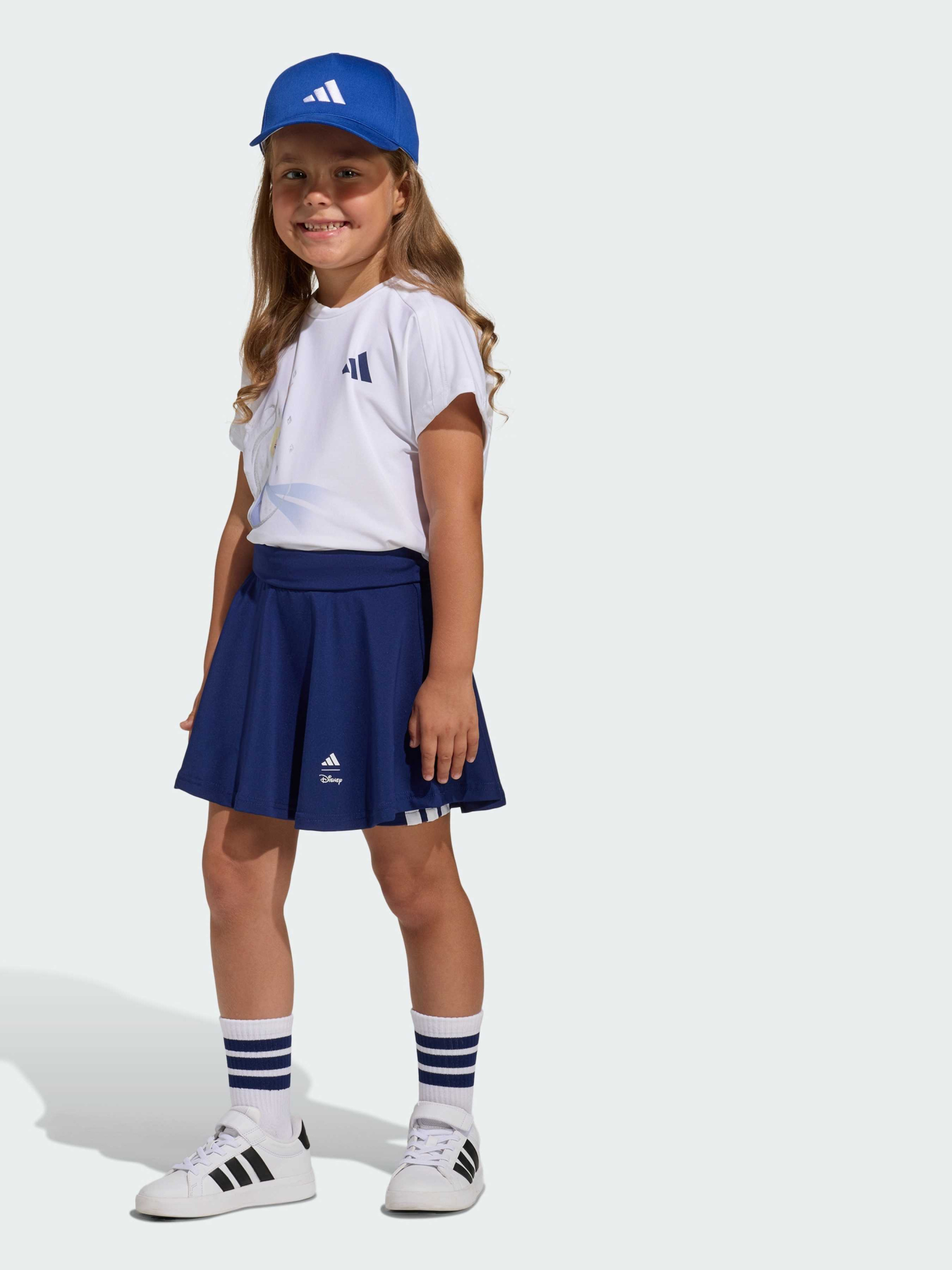 Характеристики 80% переработанный полиэстер, 20% эластан Верх: прямой крой; низ: облегающий крой. Технология CLIMACOOL Тонкий трикотаж Укороченный фасон Круглый вырез горловины Средняя посадка Прорезиненный блестящий принт Эльзы Описание Будь готова к любым приключениям с комплектом adidas Disney Frozen. Футболка стандартного кроя и и юбка-шорты обеспечивают полную свободу движений, а мягкий трикотаж приятно ощущается на теле. Технология Climacool отводит влагу и помогает оставаться свежей даже в самые активные дни. Яркий дизайн с героями Эльзы и Анны сделает каждый твой день веселым и стильным. Надень комплект и сияй на тренировке.