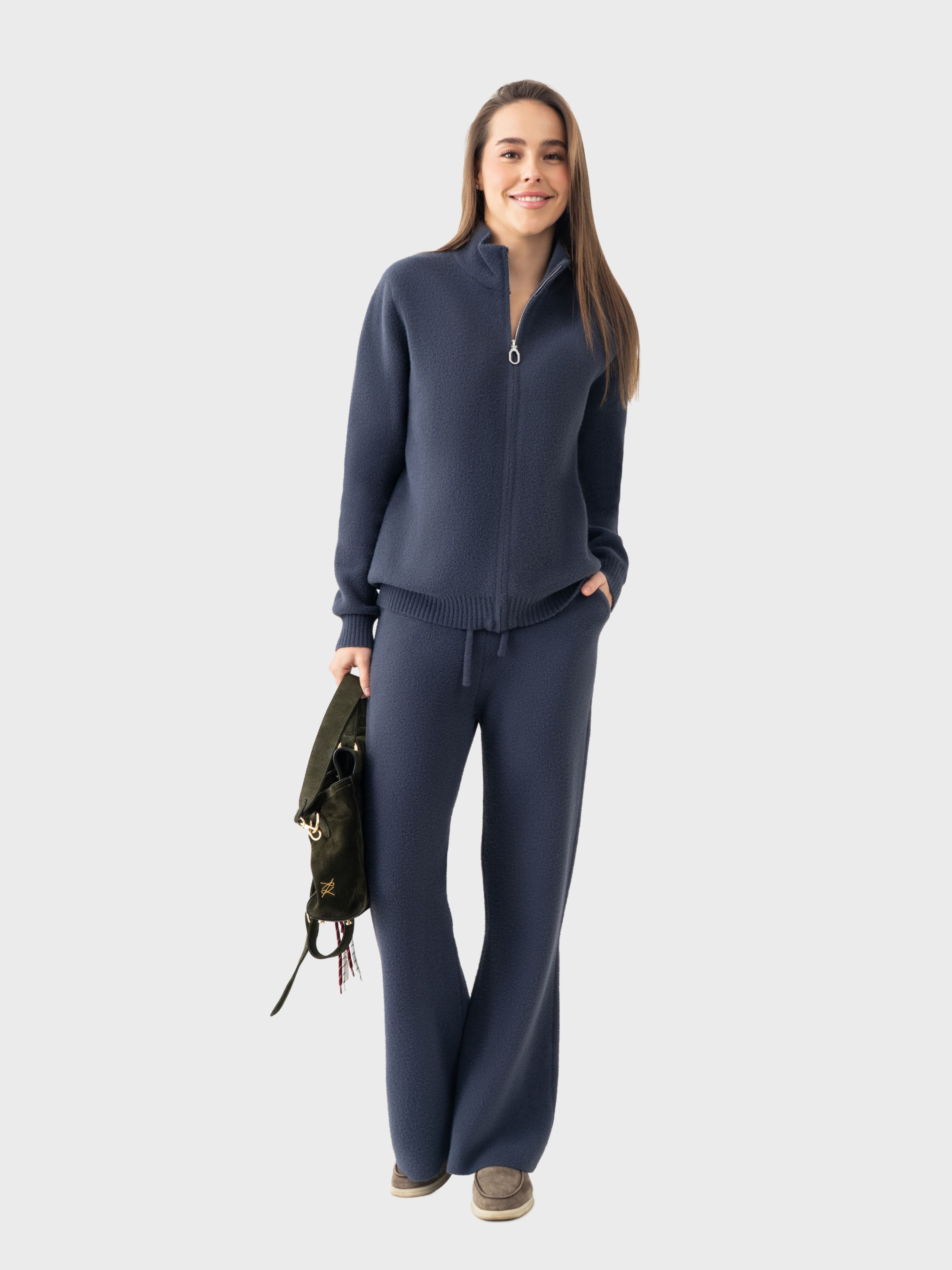Женский костюм AVECS из мериносовой шерсти создан для комфорта в холодный сезон и активного образа жизни. Сочетание мериносовой шерсти, вискозы и полиэстера формирует мягкий, тёплый и износостойкий материал, который приятно прилегает к телу и сохраняет форму после носки. Мериносовая шерсть обеспечивает естественную терморегуляцию: согревает на холоде, но не вызывает перегрева в помещении, поддерживая стабильный микроклимат в течение дня. Материал остаётся воздухопроницаемым, эластичным и гипоаллергенным, что делает костюм удобным для ежедневного использования. Кофта на молнии имеет комфортную посадку и обеспечивает дополнительную защиту от прохлады, а брюки с клёш-манжетами формируют аккуратный, вытянутый силуэт и дарят свободу движений. Мягкая текстура и продуманный крой делают костюм комфортным для прогулок, путешествий и активного ритма. Серый костюм AVECS легко сочетается с верхней одеждой и обувью в спортивно-городском стиле. Это тёплая и функциональная модель, которая сочетает технологичность, комфорт и современную эстетику. Для сохранения свойств ткани рекомендуется стирать костюм в деликатном режиме при температуре до 30 °C, без отжима в стиральной машине, используя жидкое моющее средство. Состав: шерсть мериноса 45%, вискоза 35%, полиэстер 20%.