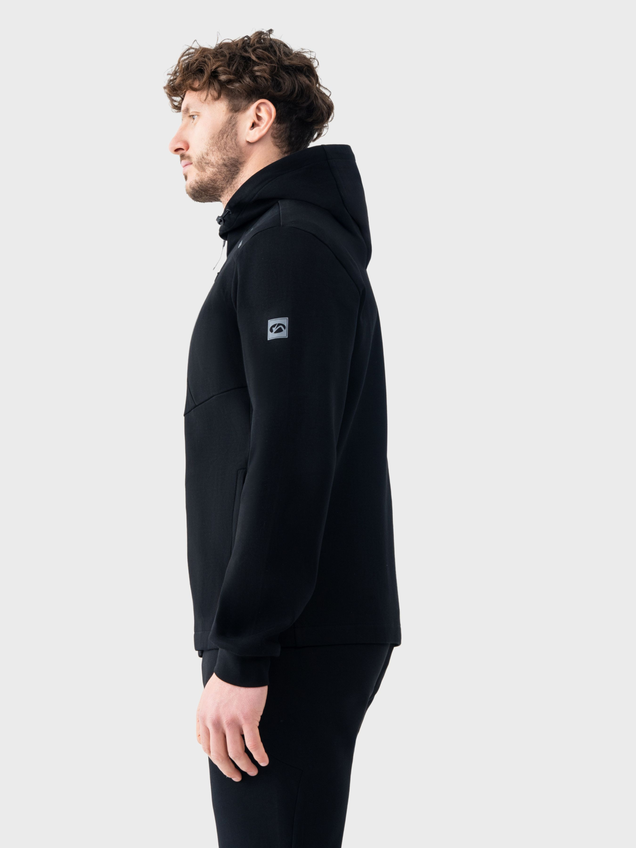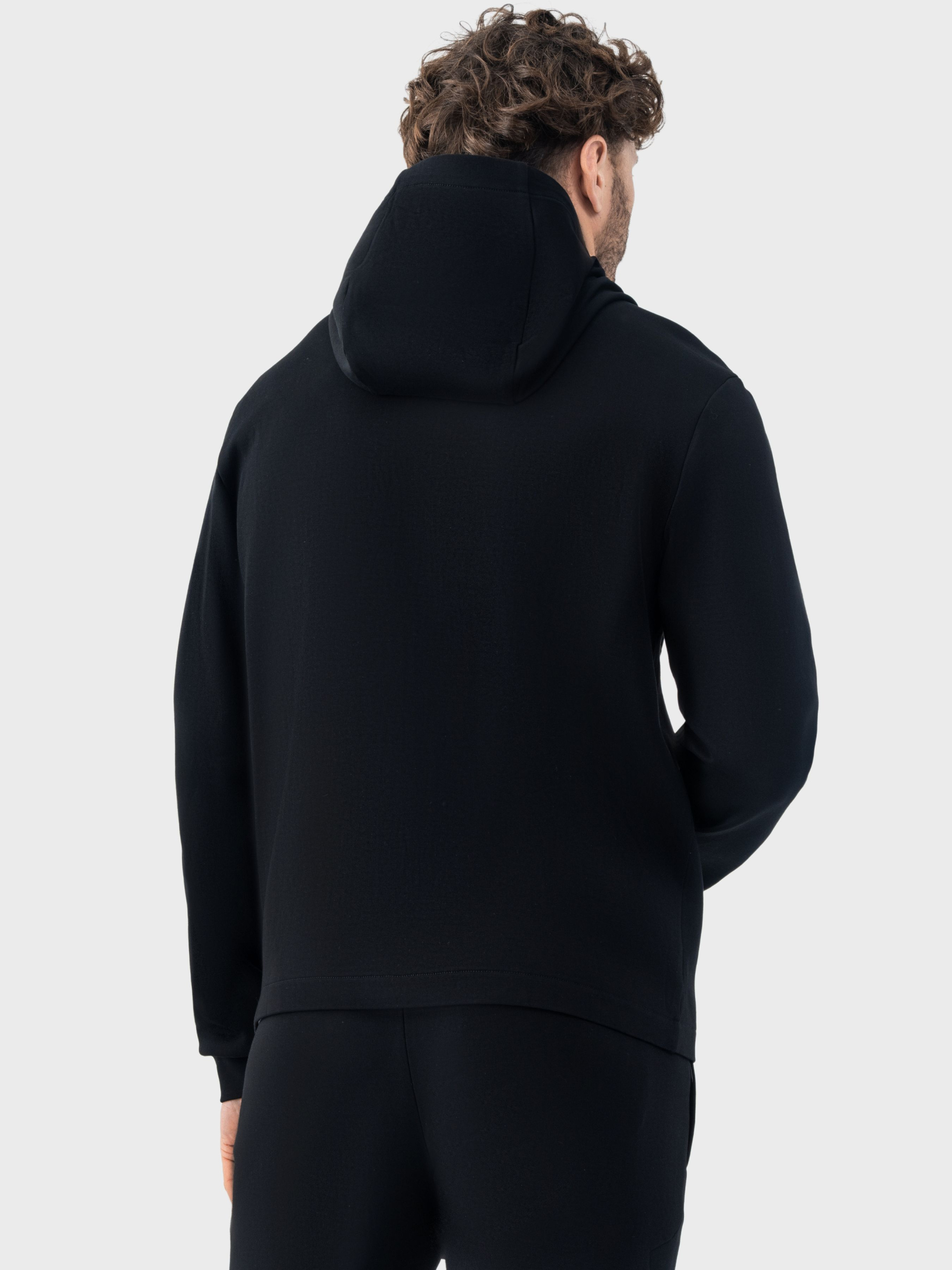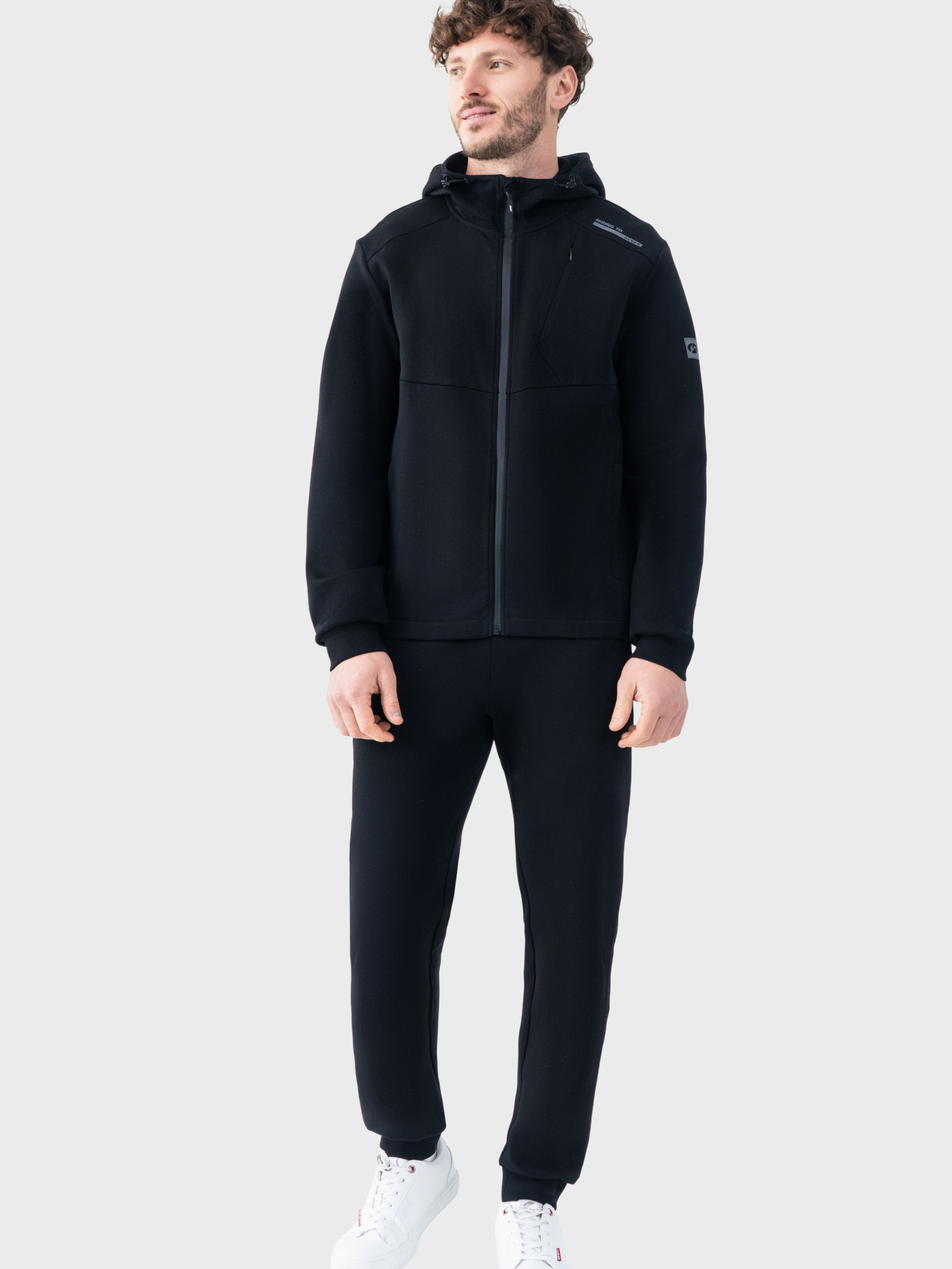 Черный костюм AVECS предназначен для тех, кто ценит комфорт, премиальные материалы и идеальный минималистичный дизайн. Модель изготовлена из трикотажа Double Face – это современная двухслойная ткань, сочетающая мягкость внутреннего слоя и аккуратный, структурный внешний вид. Материал сочетания 78% хлопка, 16% полиэстера и 6% эластана обеспечивает естественную воздухопроницаемость, эластичность и износостойкость. Благодаря плотности 350 г/м², костюм идеально держит форму, дарит комфорт и ощущение "объятий" на теле. Трикотаж Double Face создает максимально приятные тактильные ощущения, не раздражает кожу и обеспечивает аккуратный вид в течение дня. Современный крой подчеркивает силуэт, делая костюм универсальным выбором как для ежедневной носки, так и для путешествий или динамичного городского стиля. Особенности: -Трикотаж Double Face -плотность материала 350 г/м² -Высокое содержание хлопка и эластичности -Мягкий, приятный к телу материал -Современный силуэтный крой -Универсальный и стильный дизайн -Несъемный капюшон -Система регулировки капюшона -манжеты на рукавах -Два фронтальных кармана на водонепроницаемых молниях -Задний карман на молнии Состав: хлопок 78%, полиэстер 16%, эластан 6%.
