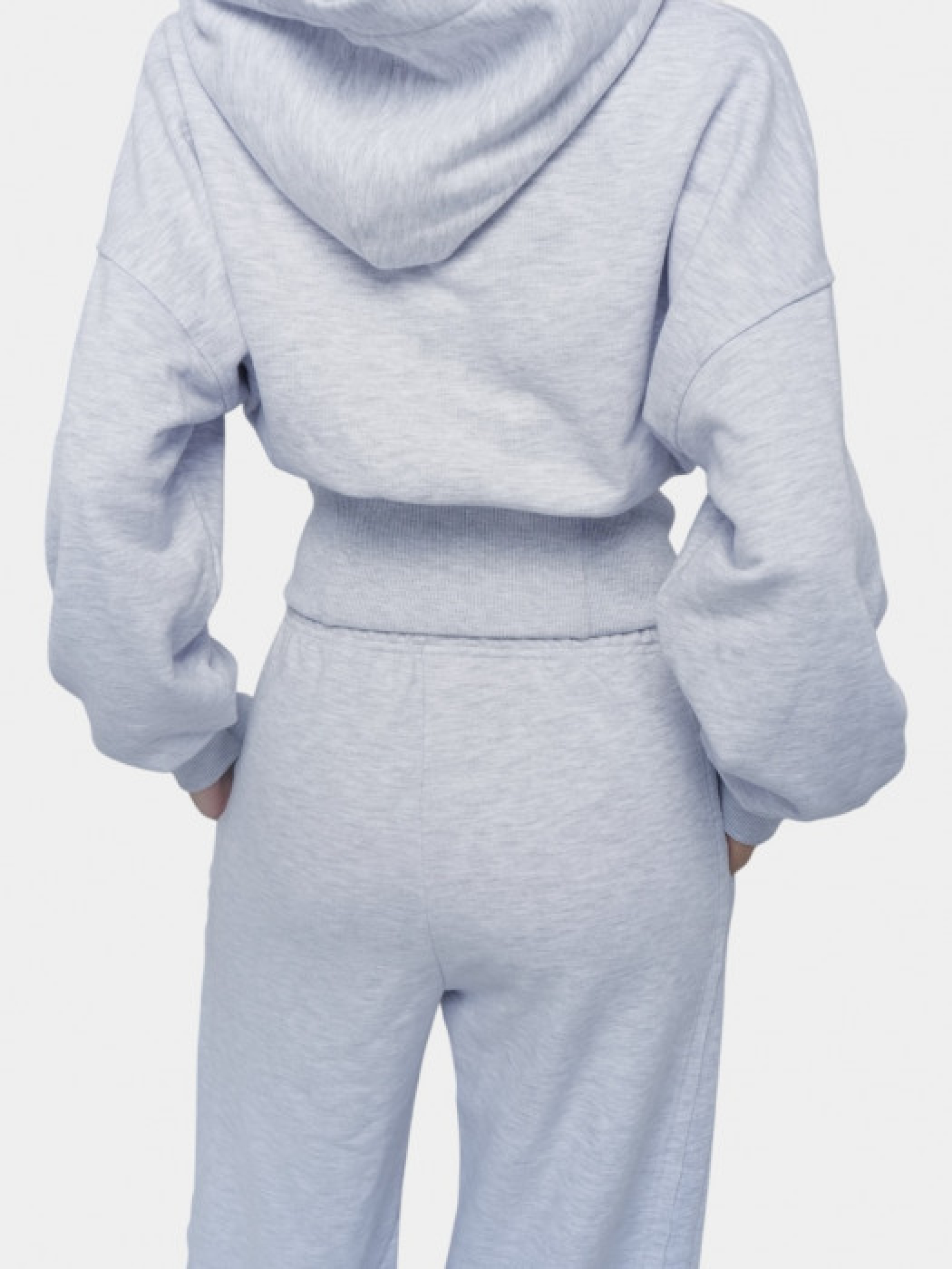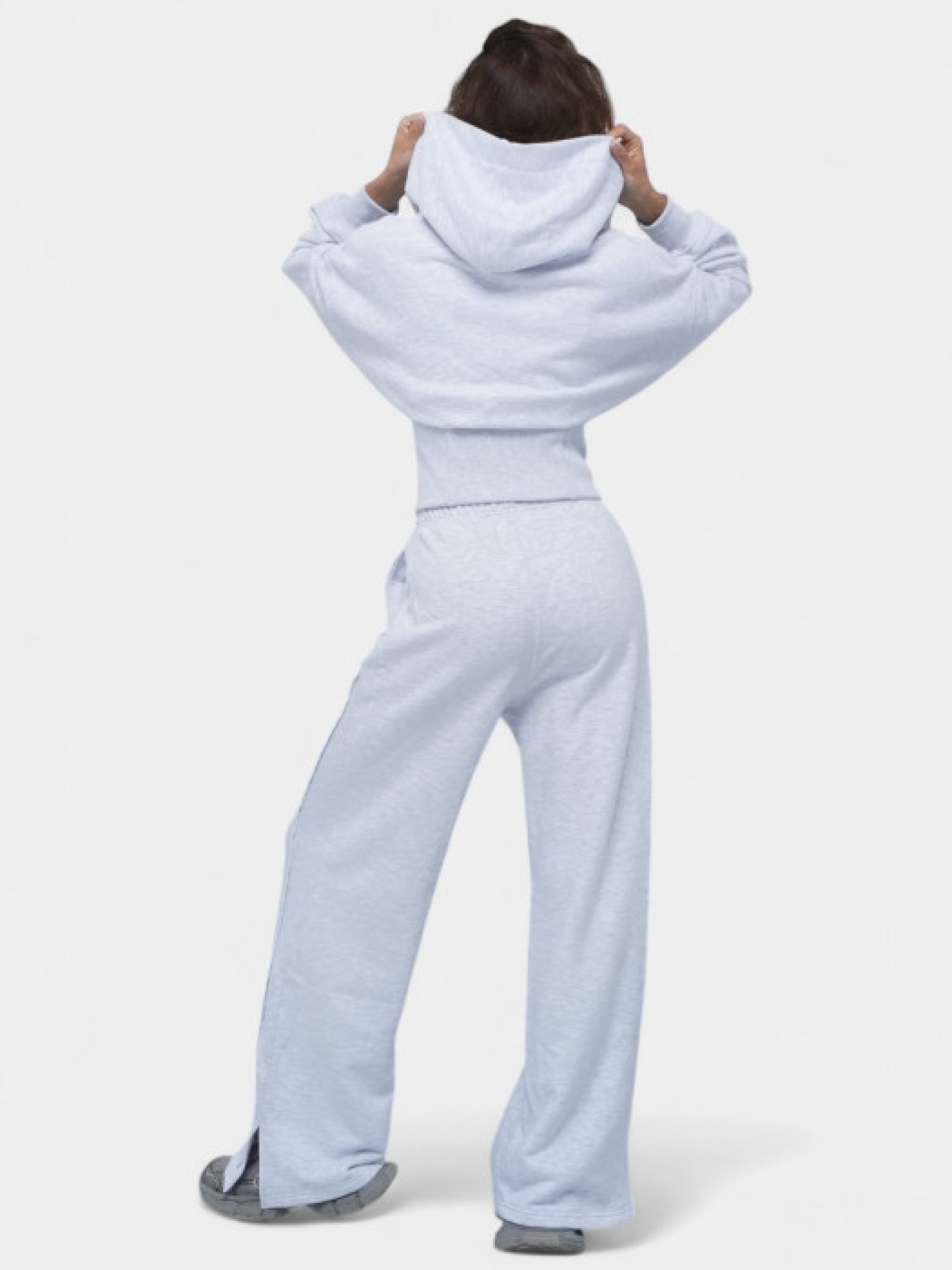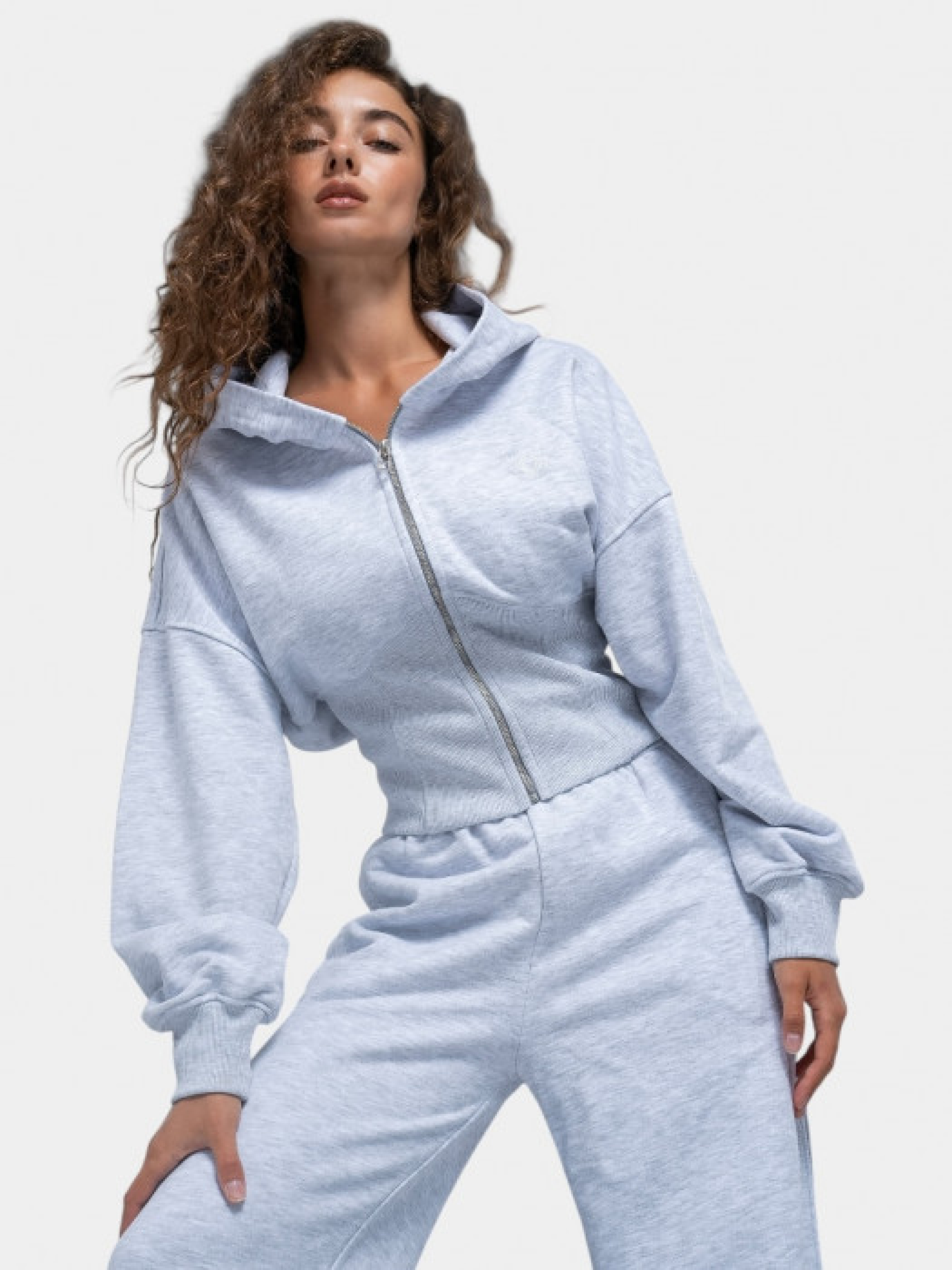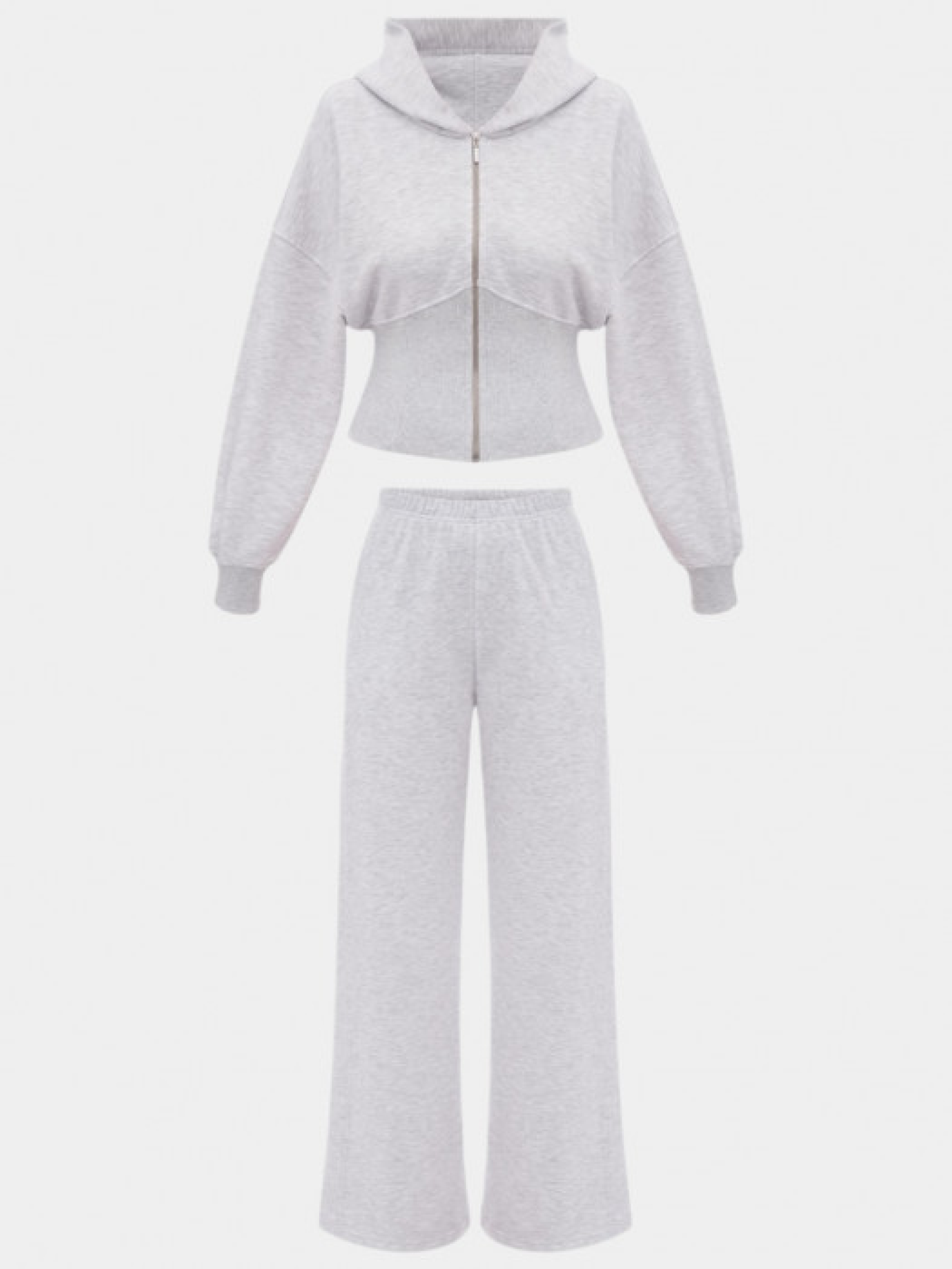 Серый спортивный костюм из меланжевого трикотажа, состоящий из худи и широких брюк. Худи имеет капюшон, застежку-молнию спереди и приталенный крой с рыбчатыми манжетами и поясом. Брюки с высокой талией, эластичным поясом и прямым широким кроем. Изготовлен из мягкого хлопкового трикотажа с добавкой полиэстера. Материал приятный на ощупь, дышащий и сохраняющий тепло. Манжеты на рукавах и штанинах обеспечивают комфортную посадку.