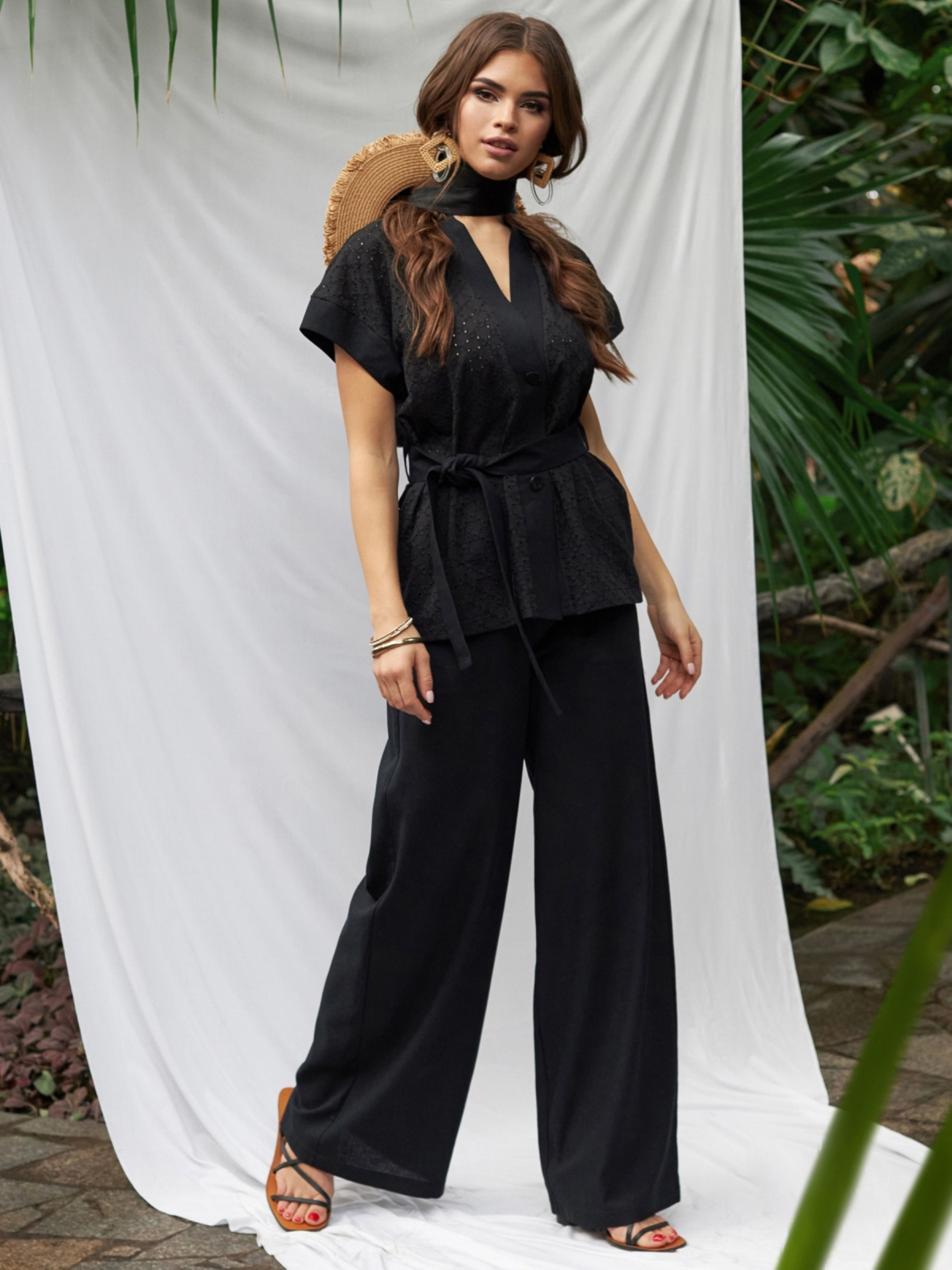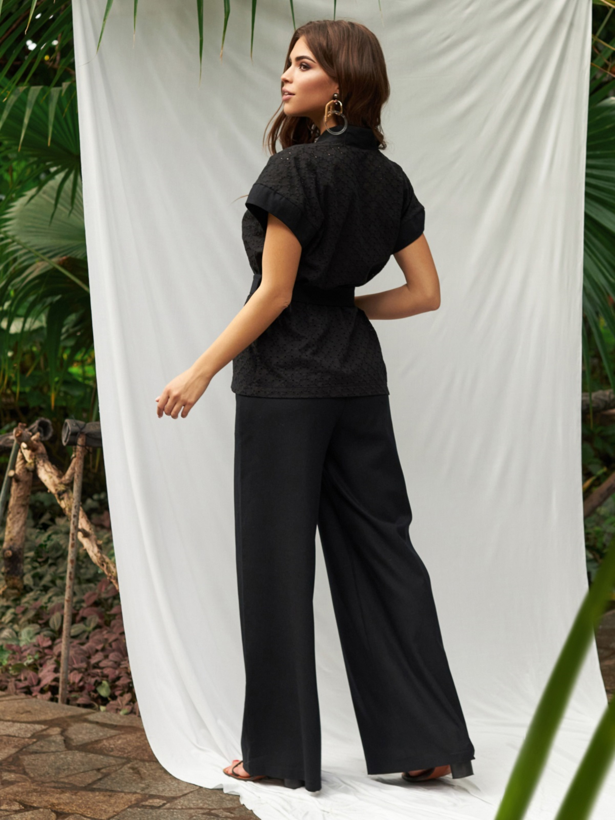 Оригинальный костюм-двойка. Блузка из прошвы с коротким цельнокроеным рукавом, застегивается на две пуговицы. Широкие льняные брюки с карманами в боковых швах, по талии эластичная деталь. Комплектуется поясом из основного материала. Важно! Перед тем как надеть, изделие необходимо замочить с закрепителем цвета.