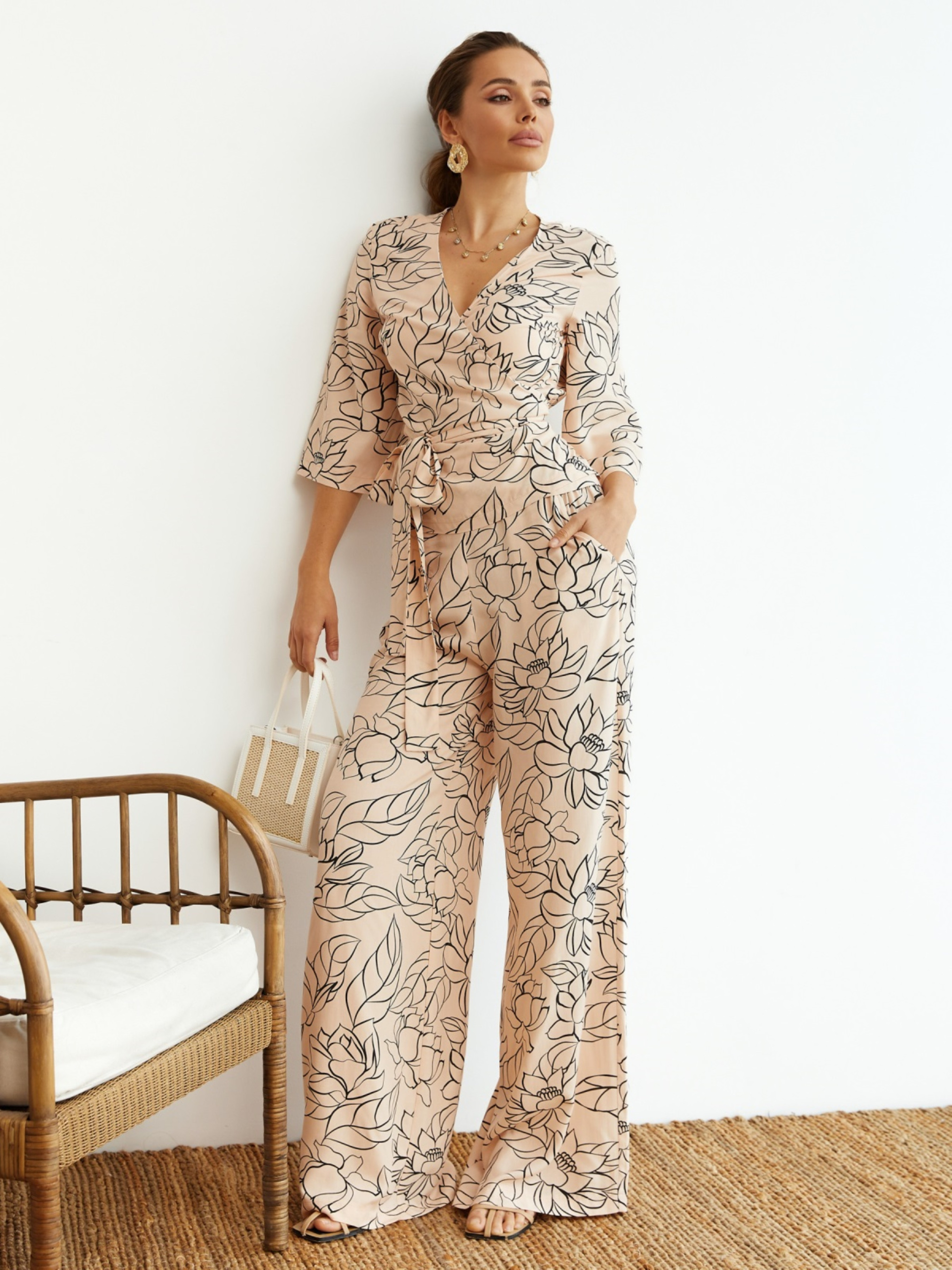 Костюм для тех, кто ценит функциональность в повседневной одежде. Блузка на запах без застёжек позволяет самостоятельно регулировать посадку. Штапель обеспечивает лёгкость в носке, а рукав ¾ — удобство. Брюки с мягкой резинкой сбоку не создают давления в области талии, адаптируются к движениям. Дополнены карманами — для удобства. Принт создаёт акцент в образе, не требуя дополнительных деталей. Модель легко стилизуется с кедами, босоножками или лодочками для офисного формата.