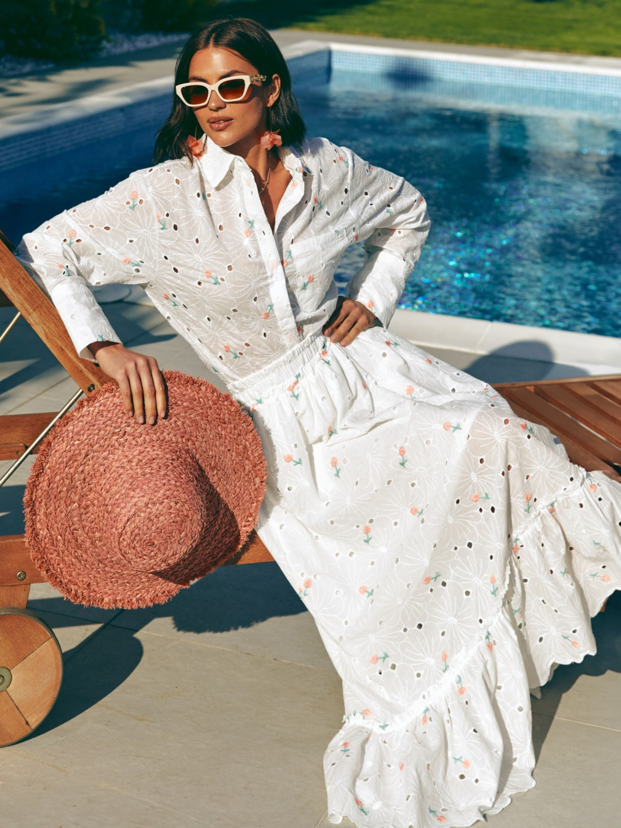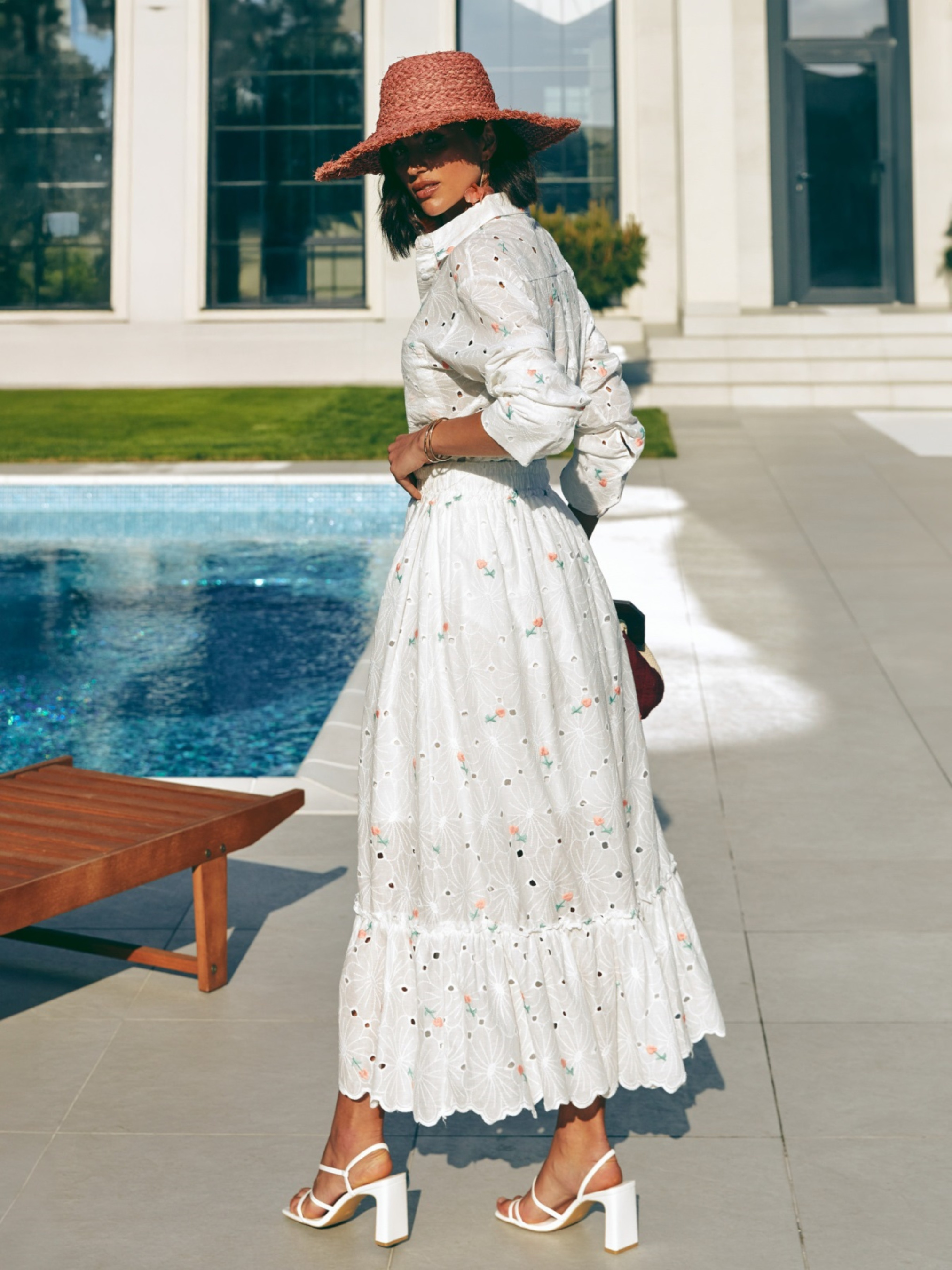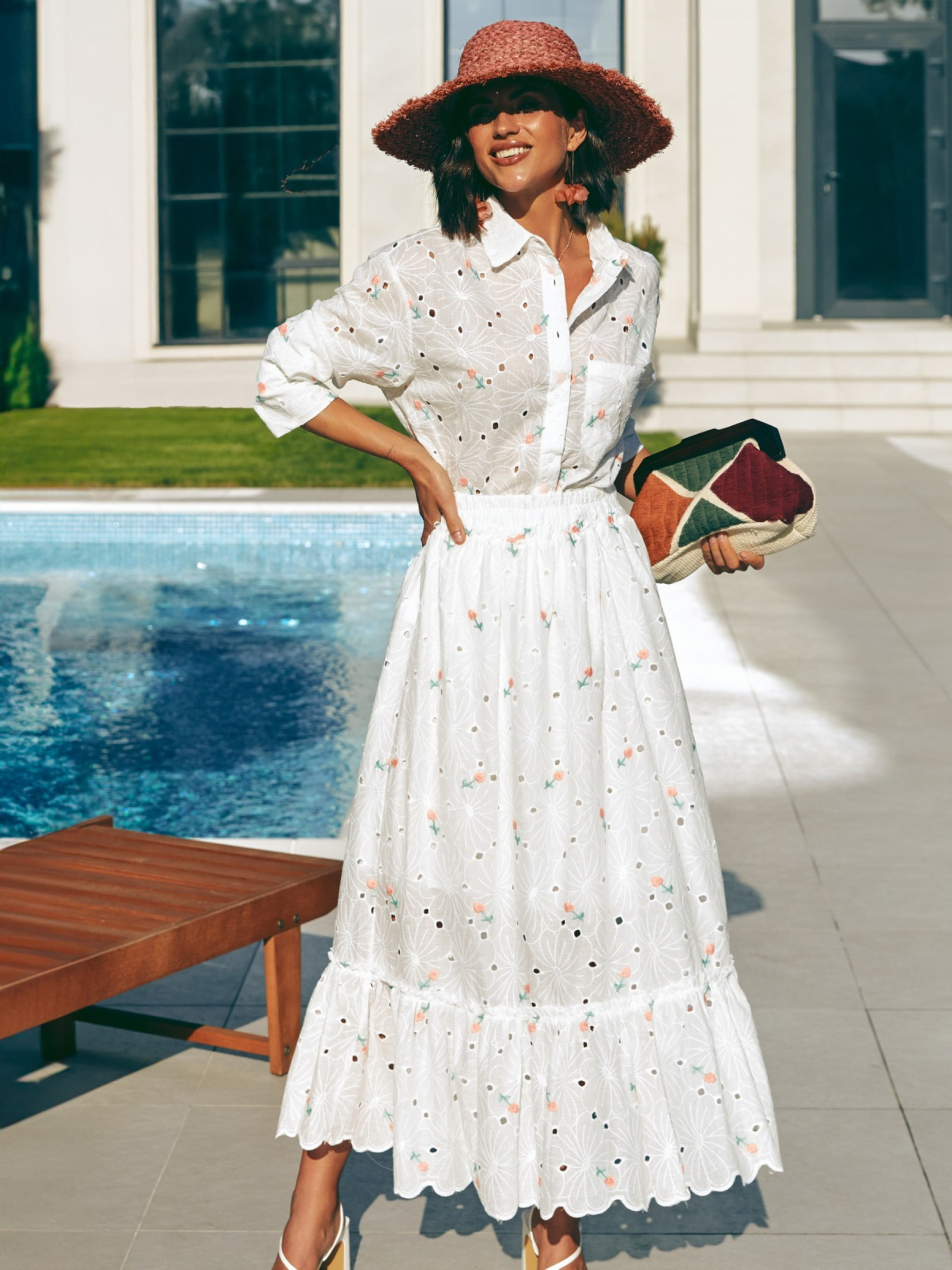 Костюм из высококачественной турецкой прошвы. Изделие декорировано цветочной вышивкой. Рубашка свободного кроя, с отложным воротником и длинными рукавами. Полочка дополнена карманом. Застёгивается на пуговицы по всей длине. Юбка-миди с эластичной резинкой на талии для максимального комфорта. Подкладка до середины изделия обеспечивает плотность и скрывает прозрачность. Подол декорирован воланом.