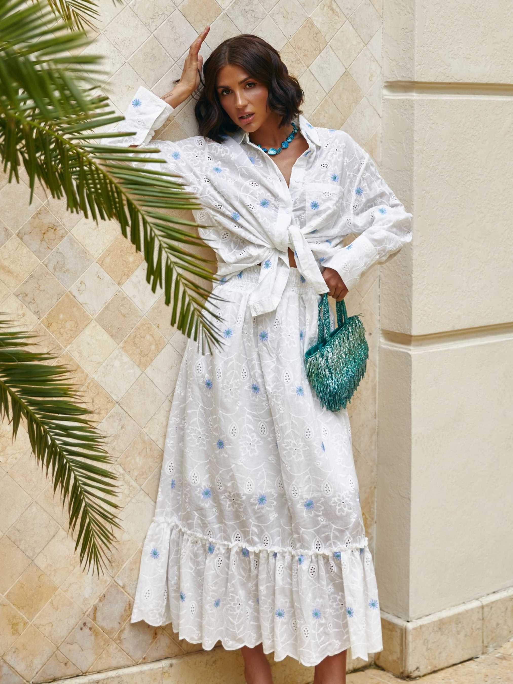 Костюм из высококачественной турецкой прошвы. Изделие декорировано цветочной вышивкой. Рубашка свободного кроя, с отложным воротником и длинными рукавами. Полочка дополнена карманом. Застёгивается на пуговицы по всей длине. Юбка-миди с эластичной резинкой на талии для максимального комфорта. Подкладка до середины изделия обеспечивает плотность и скрывает прозрачность. Подол декорирован воланом.