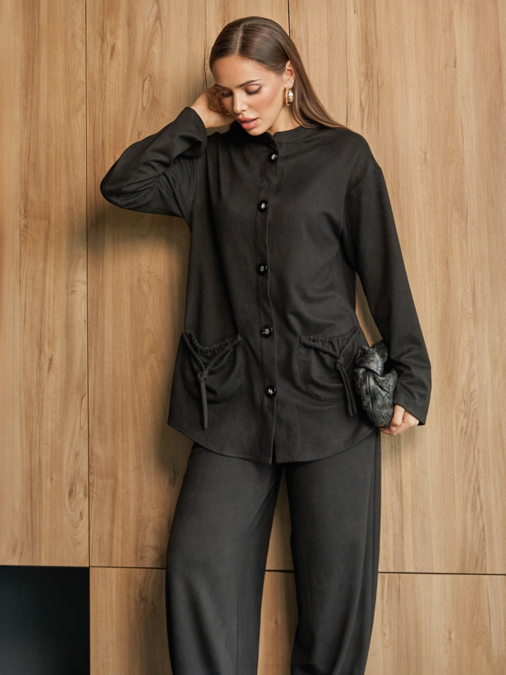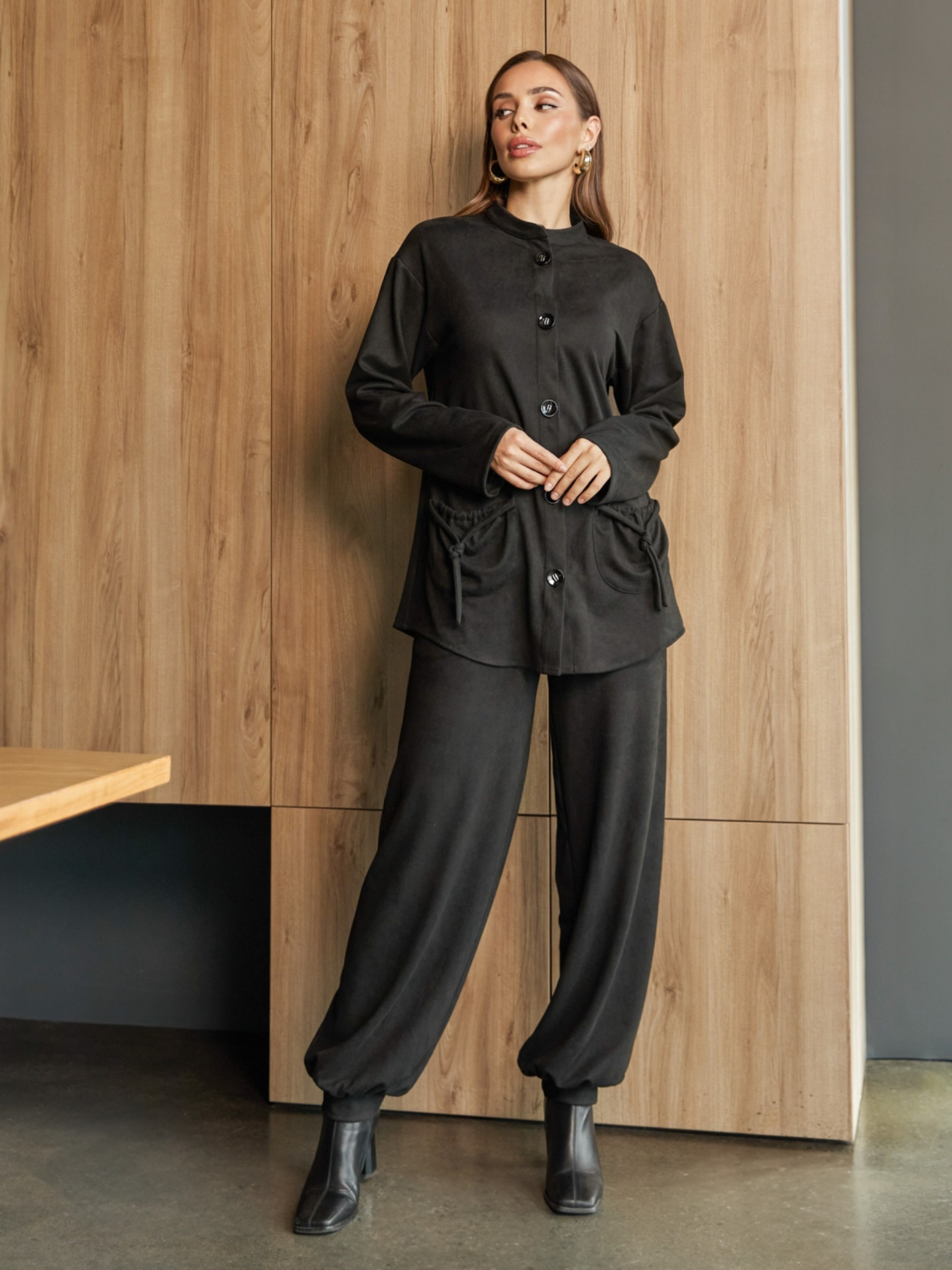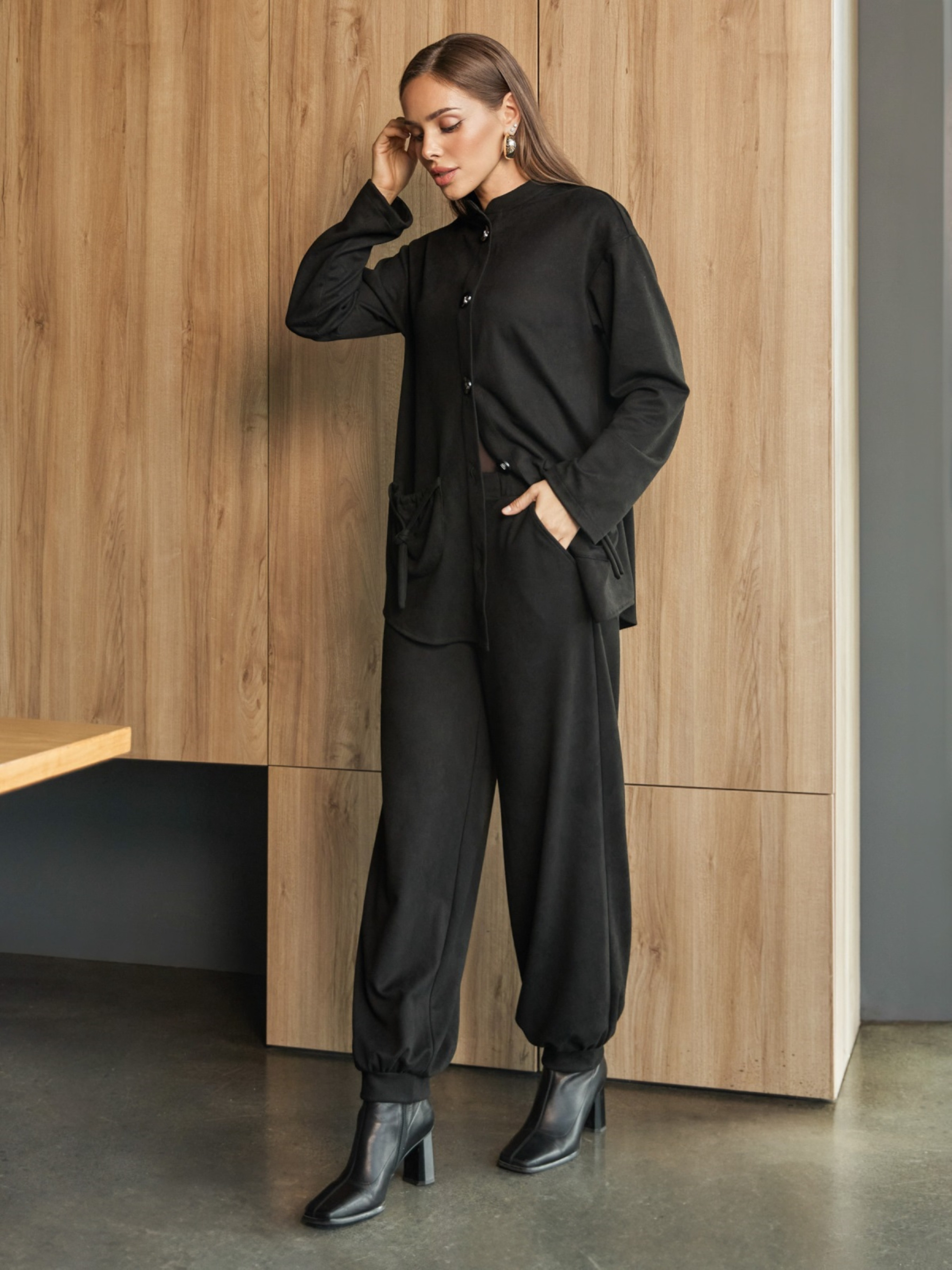 Костюм-двойка из замши-диагональ. Жакет прямого, слегка расширенного к низу кроя. С воротником стойка, спущенной линией плечевого шва и длинными рукавами. Накладные карманы по бокам, собранные на декоративные завязки. Застёгивается на пуговицы. Брюки-балоны с манжетами. Эластичный пояс обеспечивает комфортную посадку. Предусмотрены боковые карманы.