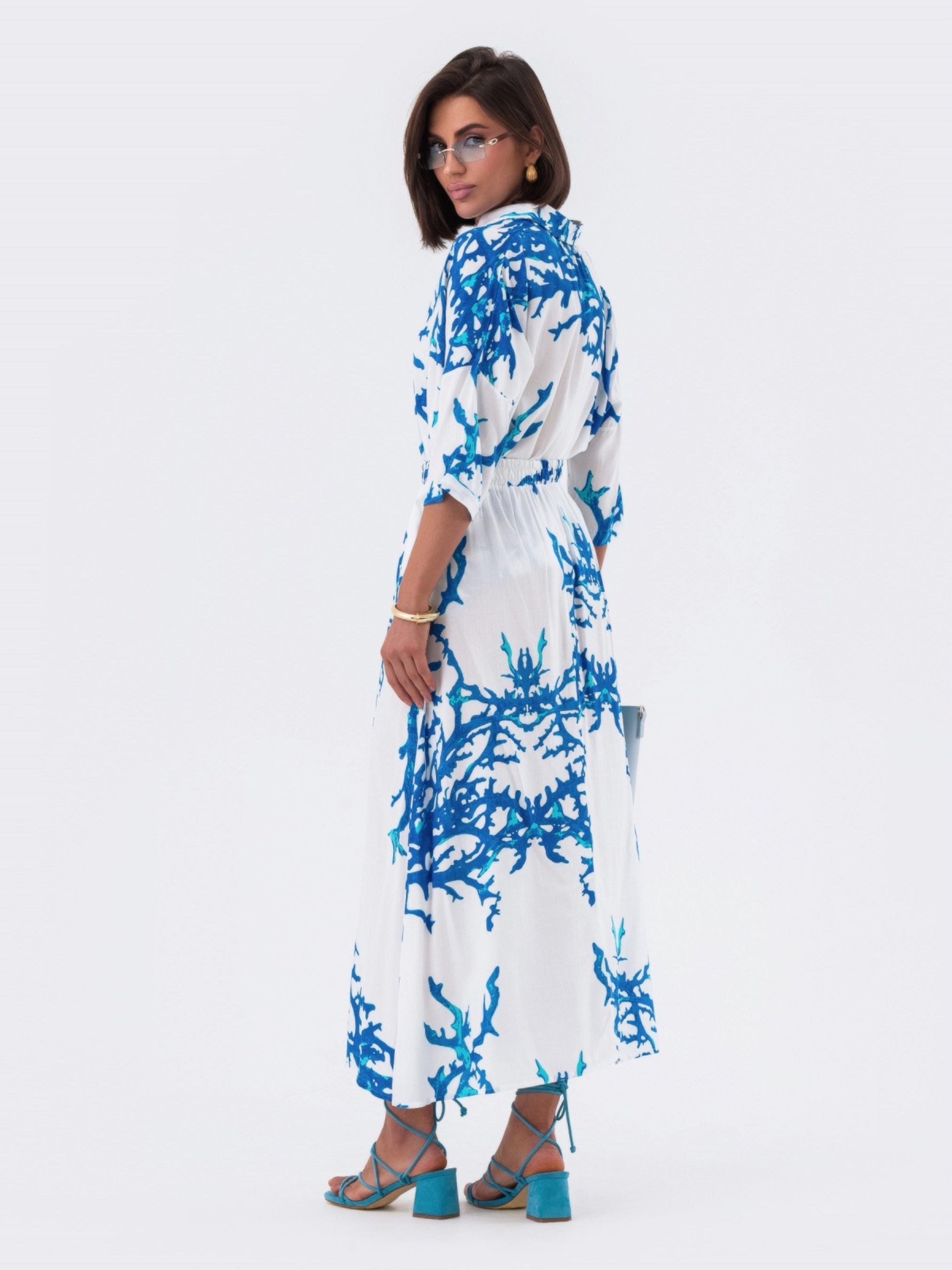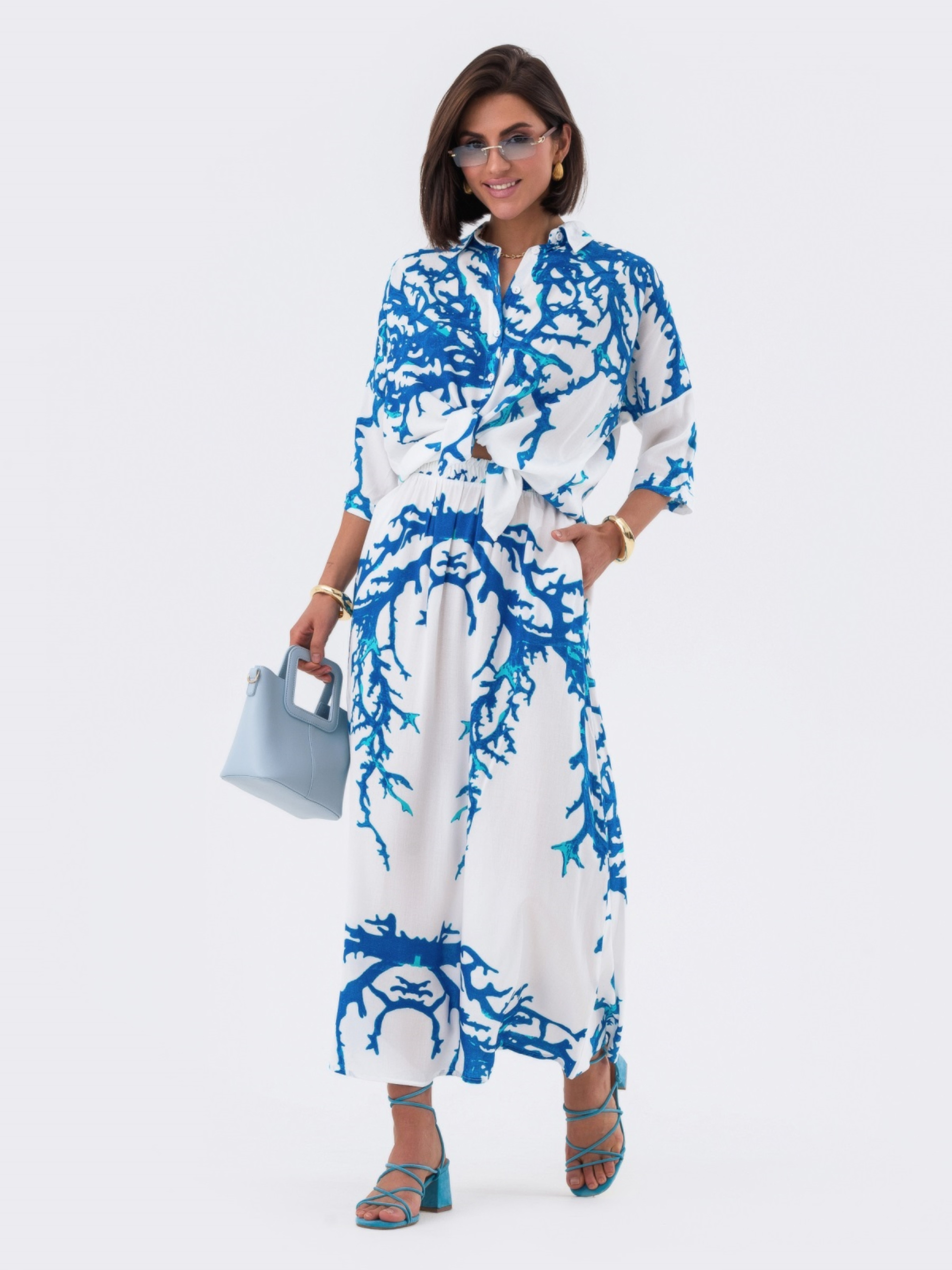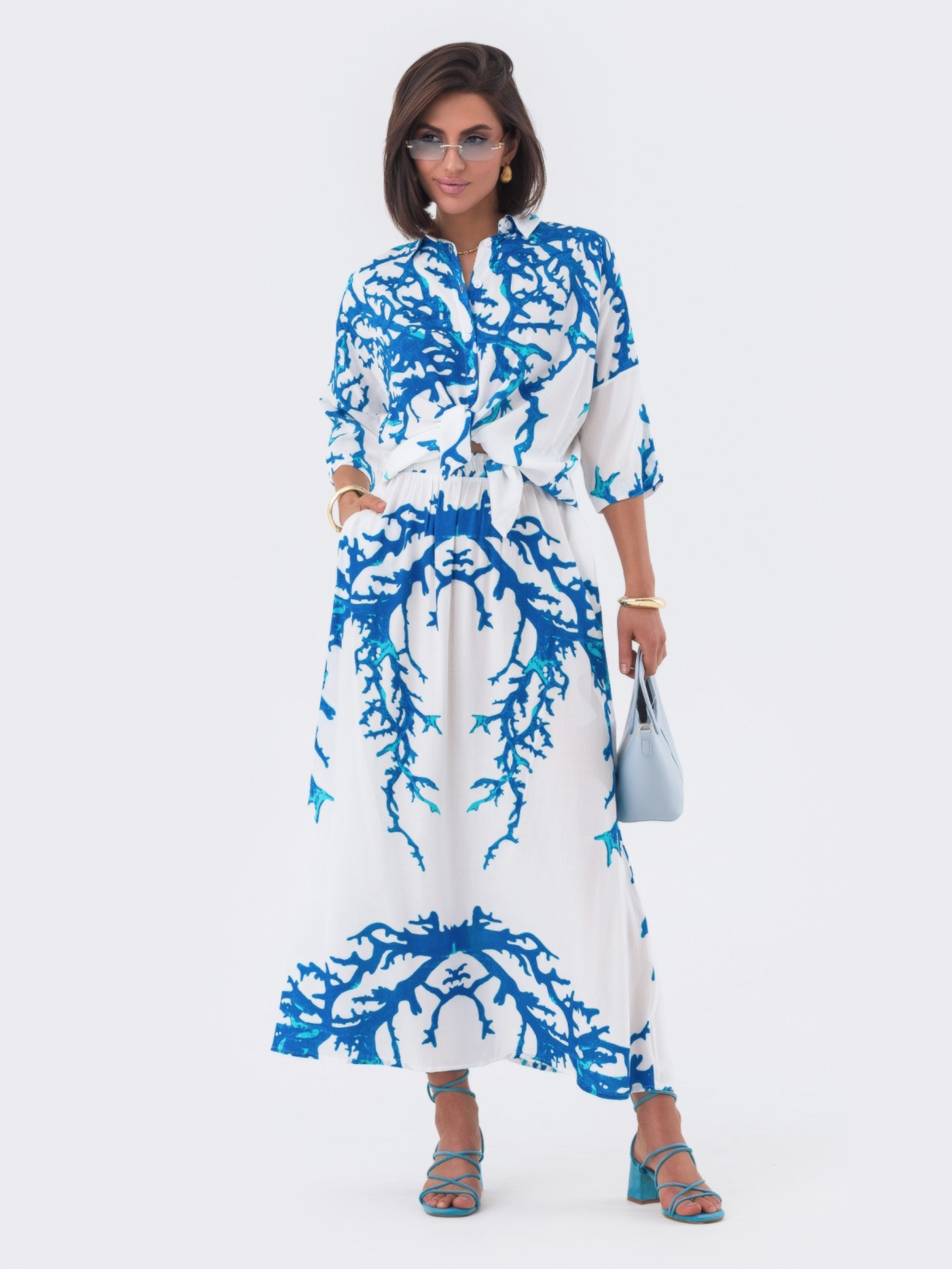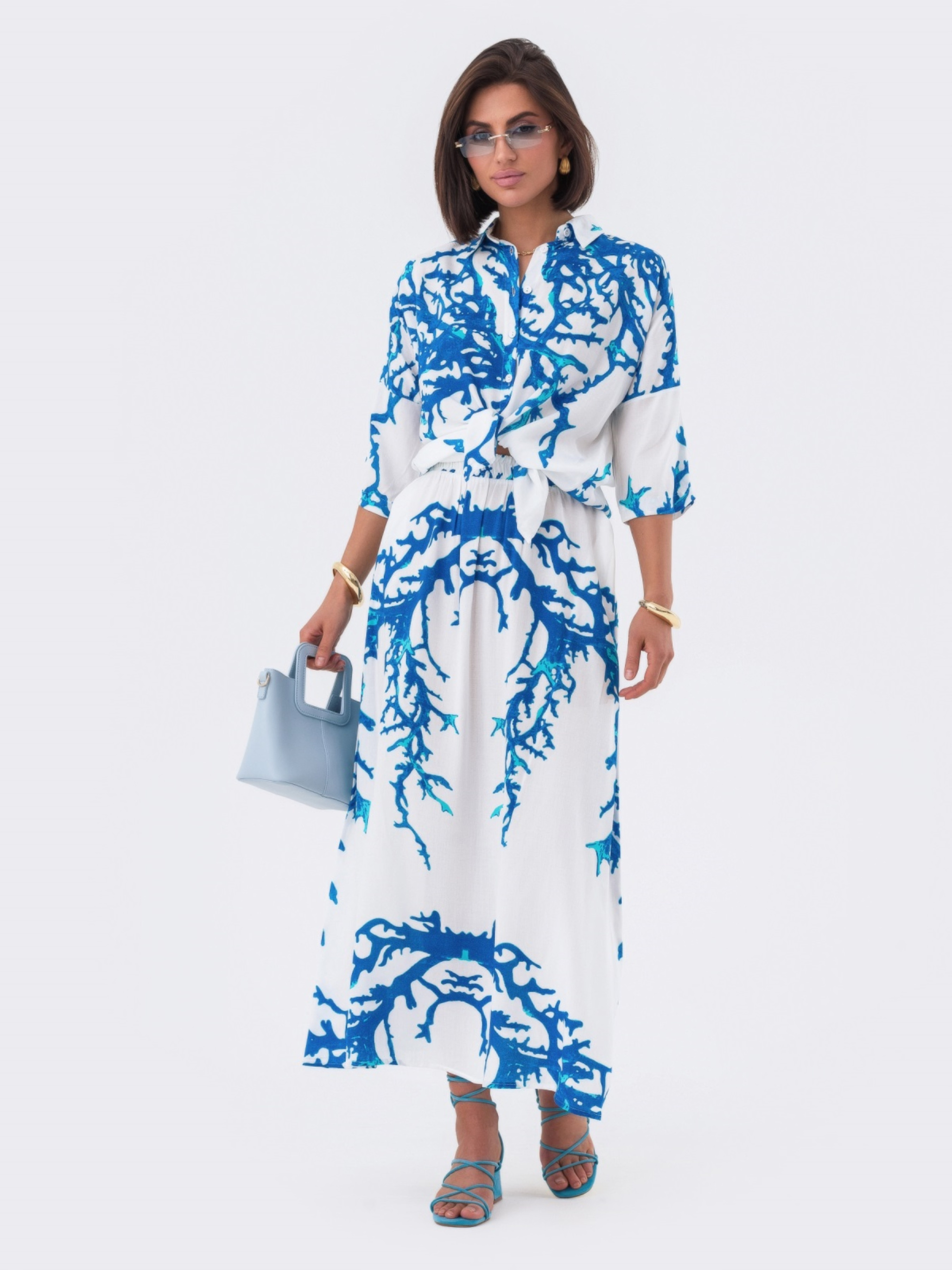 Принтованный костюм из высококачественного турецкого материала. Верх с отложным воротником, длинные рукава со спущенным плечом и манжетами. Застёгивается на пуговицы по планке. Прямая юбка с резинкой на талии.