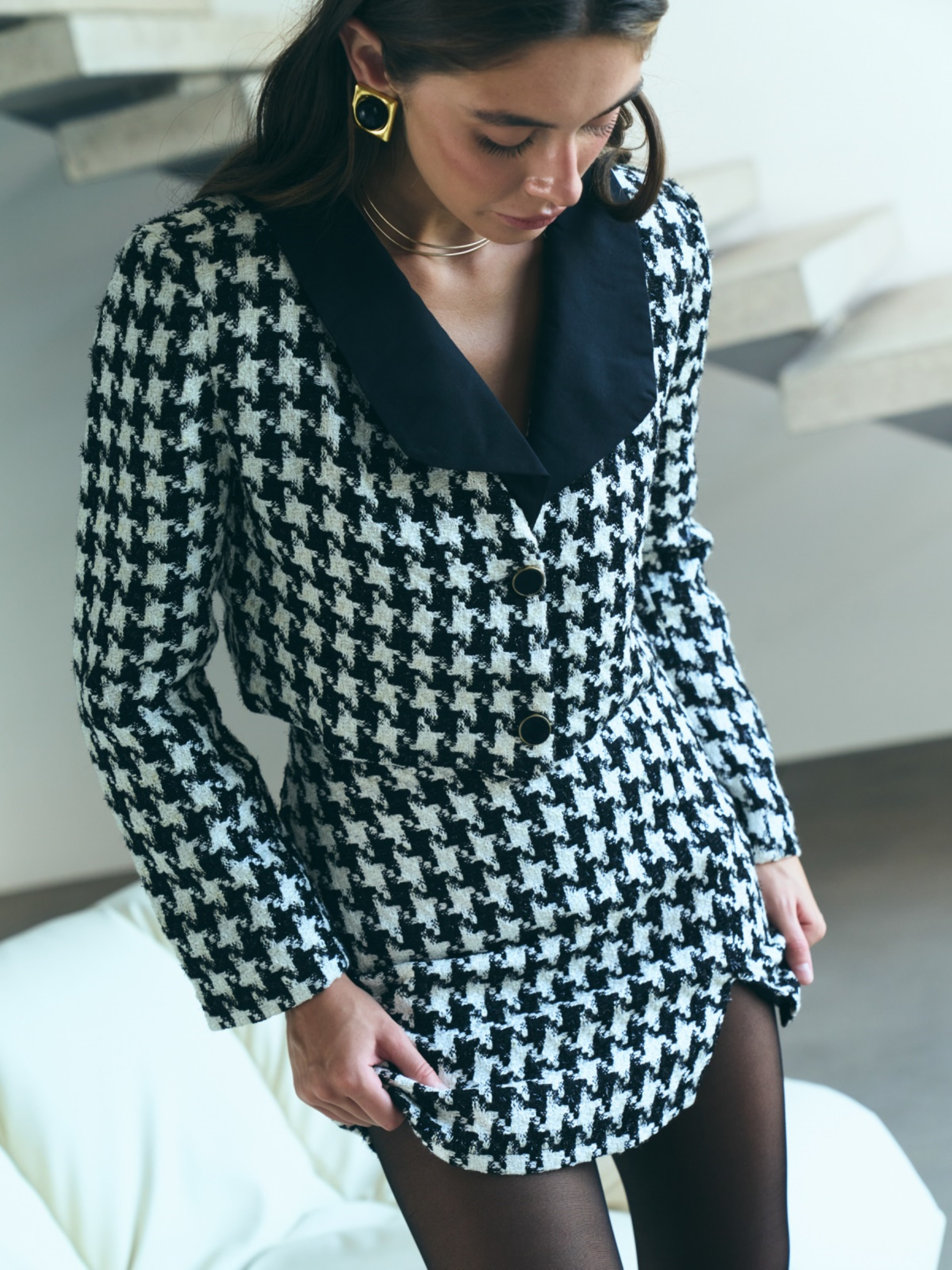 Элегантный костюм из высококачественного турецкого материала. Жакет с отложным воротником. Длинные рукава декорированы пуговицами. Дополнен подкладкой. Застёгивается на две пуговицы. Короткая юбка с разрезом сбоку. Застёгивается сзади на скрытую молнию. Без подкладки.