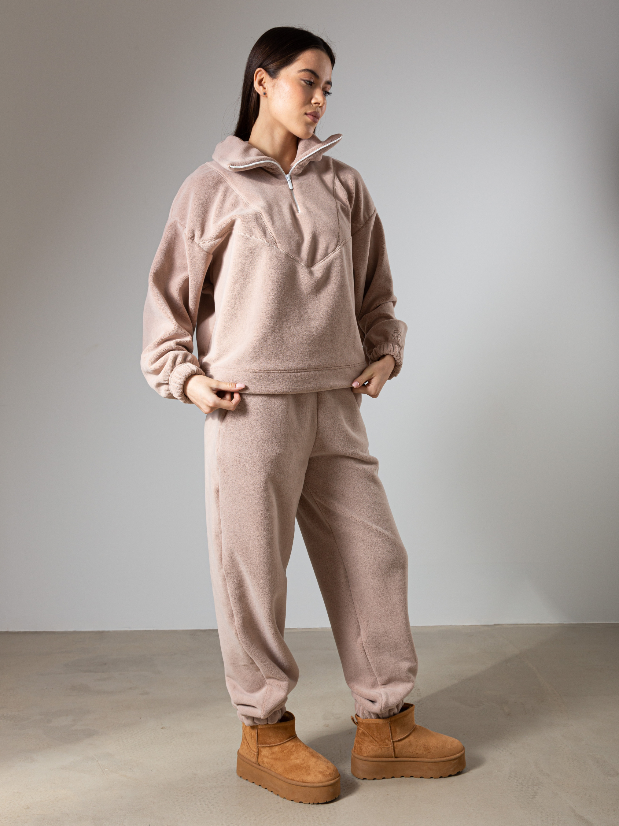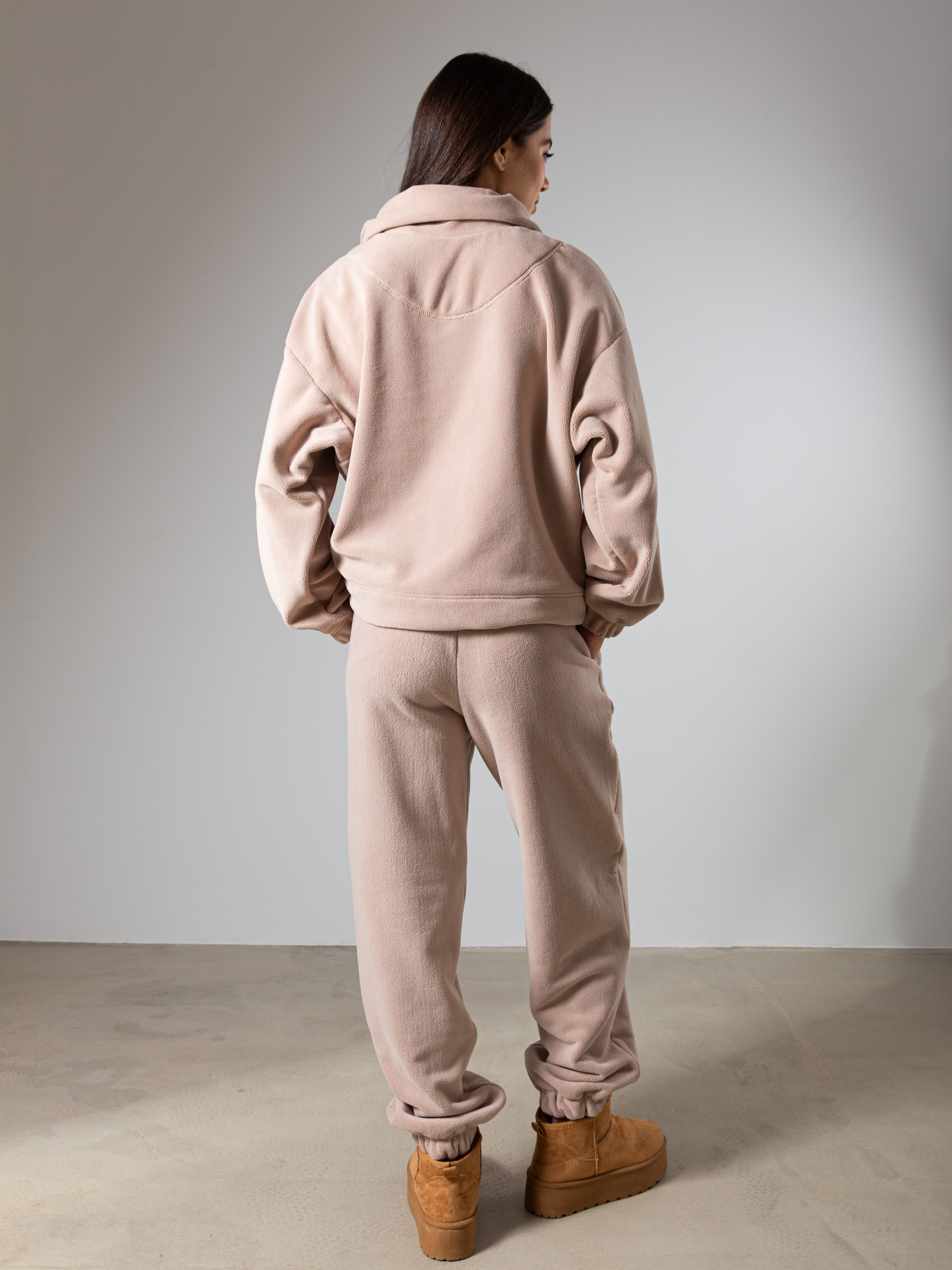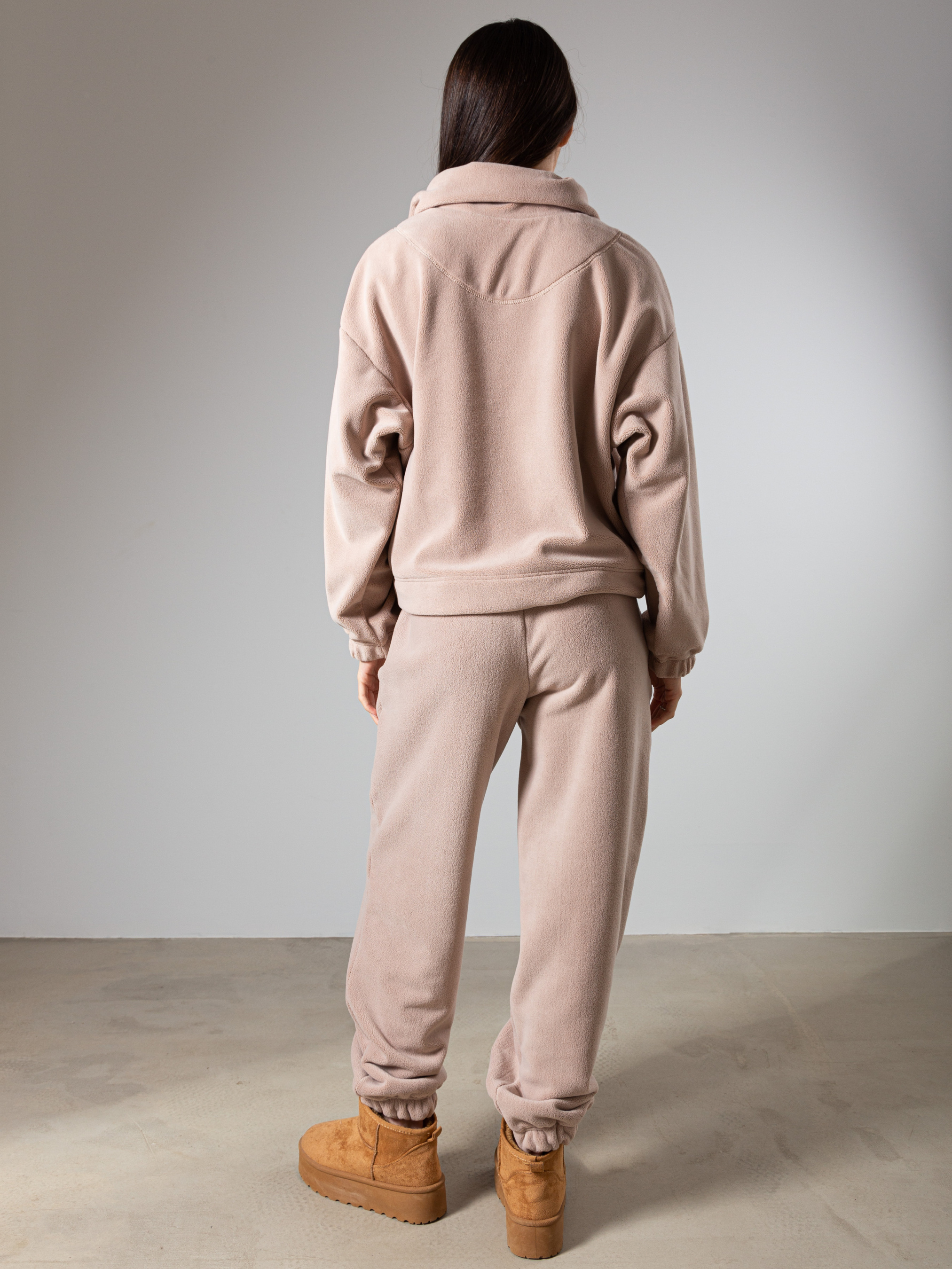 Трикотажний утеплений костюм власного виробництва FAMO, виготовлений зі 100% поліестеру. Цей матеріал забезпечує відмінну теплоізоляцію, швидко сохне і не вимагає особливого догляду. Костюм складається з двох елементів: світшот вільного крою з замочком зверху та джогери. Кольорова гама. Костюм представлений у нейтральних, теплих відтінках: молочний, коричневий, темно-бежевий, бежевий. Ці кольори легко поєднуються між собою і з іншими елементами гардеробу. Сезон: Костюм ідеально підходить для осінньо-зимового періоду. Він зігріє в холодну погоду і не обмежує рухів. Рекомендації по догляду Прання: Рекомендується делікатне прання в теплій воді з використанням спеціальних засобів для синтетичних тканин. Сушіння: Сушити костюм слід в розправленому вигляді, уникаючи прямих сонячних променів. Прасування: Прасувати костюм слід при мінімальній температурі або зовсім відмовитися від прасування. Зберігання: Зберігати костюм слід в шафі, захищеному від прямих сонячних променів і вологи. Як створити стильні образи з трикотажним костюмом від FAMO Повсякденний образ: Сполучіть костюм з масивними кросівками або чоботами, доповніть образ пуховиком або теплою курткою. Спортивний стиль: Ідеальний варіант для занять спортом або прогулянок на свіжому повітрі. Вуличний стиль: Додайте до костюму бейсболку, рюкзак і масивні кросівки. Трикотажний утеплений костюм від FAMO - це відмінний вибір для холодного сезону. Він забезпечить вам тепло, комфорт і стильний зовнішній вигляд.