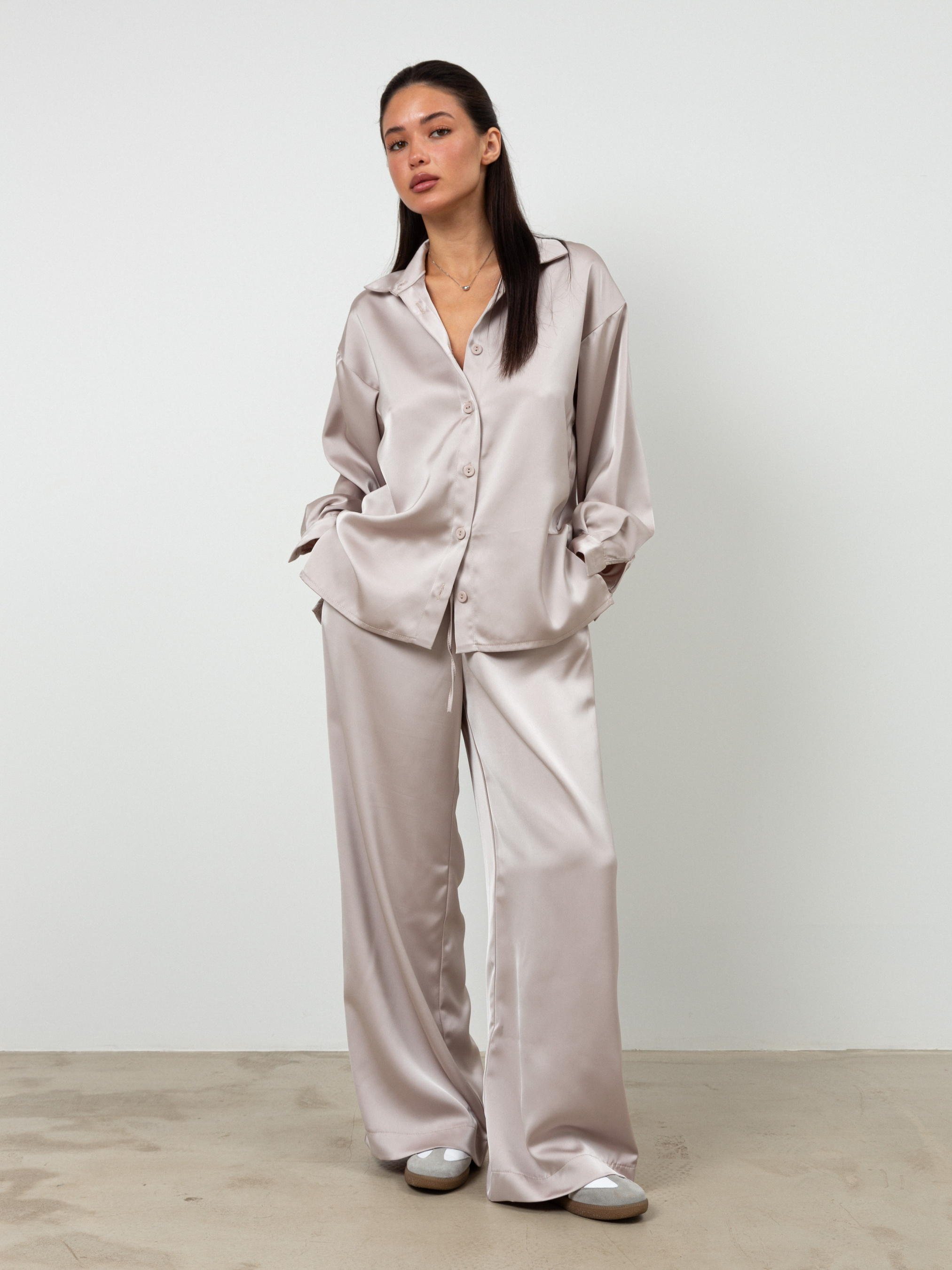 Цей атласний костюм - втілення елегантності та сучасного стилю, створений для впевнених у собі жінок.Складається із сорочки та штанів, він стане ідеальним вибором для весняно-літнього сезону. Атласна тканина не тільки виглядає розкішно, але й приємна на дотик, що робить носіння цього костюма неймовірно комфортним. Атласна сорочка з класичним кроєм має витончений блиск і легку текстуру.Вона вільно сідає по фігурі, підкреслюючи жіночність та стиль. Може мати різні варіації коміра, що дозволяє адаптувати її до будь-якого випадку — від ділових зустрічей до вечірніх виходів. Атласні штани в класичному стилі доповнюють образ, маючи елегантний крій, що підкреслює силует. Еластичний пояс забезпечує зручну посадку, а також свободу рухів, що робить їх ідеальними для динамічних днів. Основні переваги: Стиль і елегантність: Атласний блиск і класичний крій надають костюму вишуканості, що робить його чудовим вибором для особливих випадків.Комфорт: Натуральні волокна забезпечують хорошу повітропроникність і м'якість, що важливо в теплу погоду. Універсальність: Костюм легко комбінується з різними аксесуарами, дозволяючи створювати як повсякденні, так і святкові образи. Цей атласний костюм стане вашим незамінним союзником у створенні стильних образів, даруючи вам відчуття впевненості та елегантності в будь-якій ситуації.
