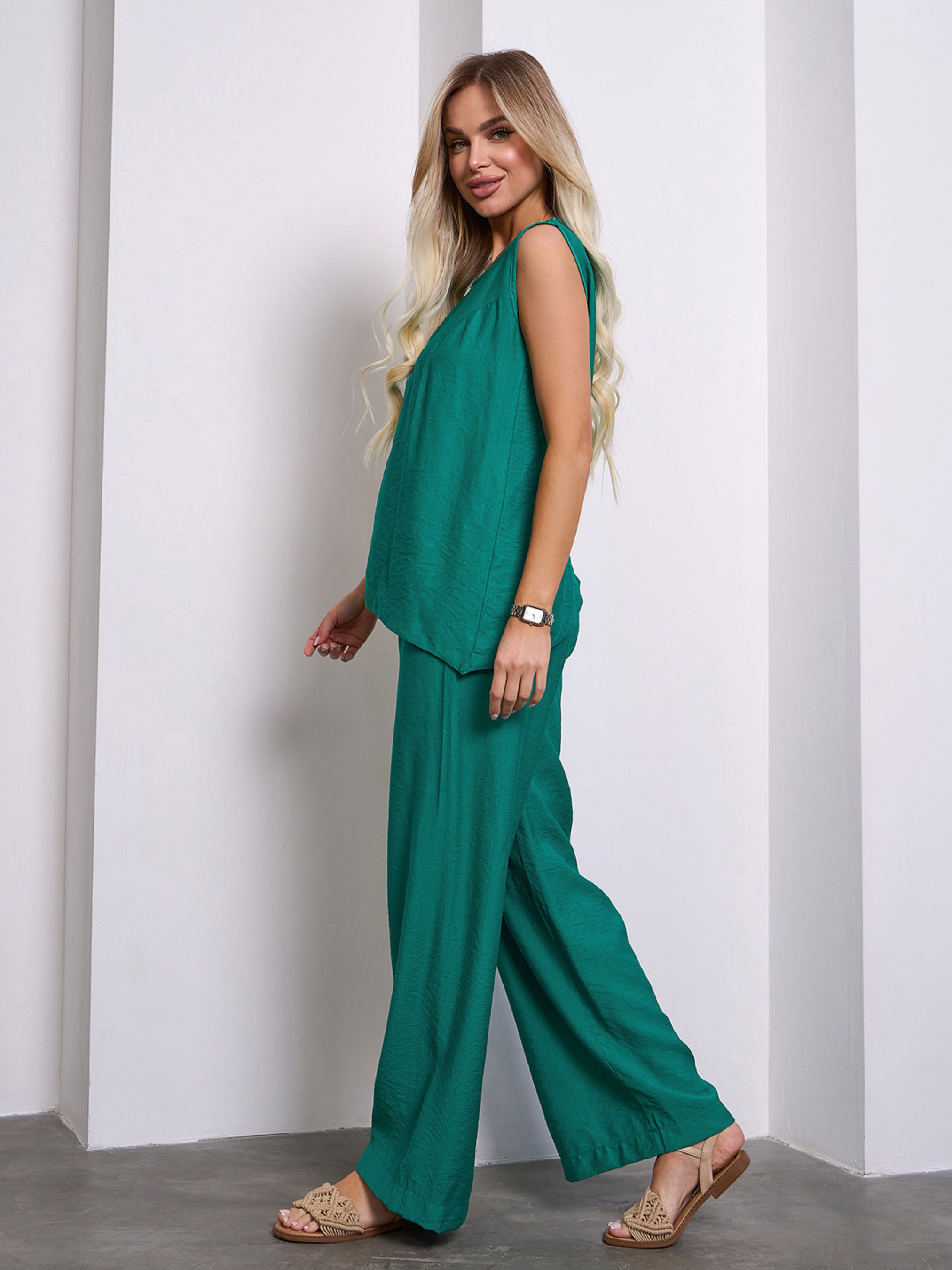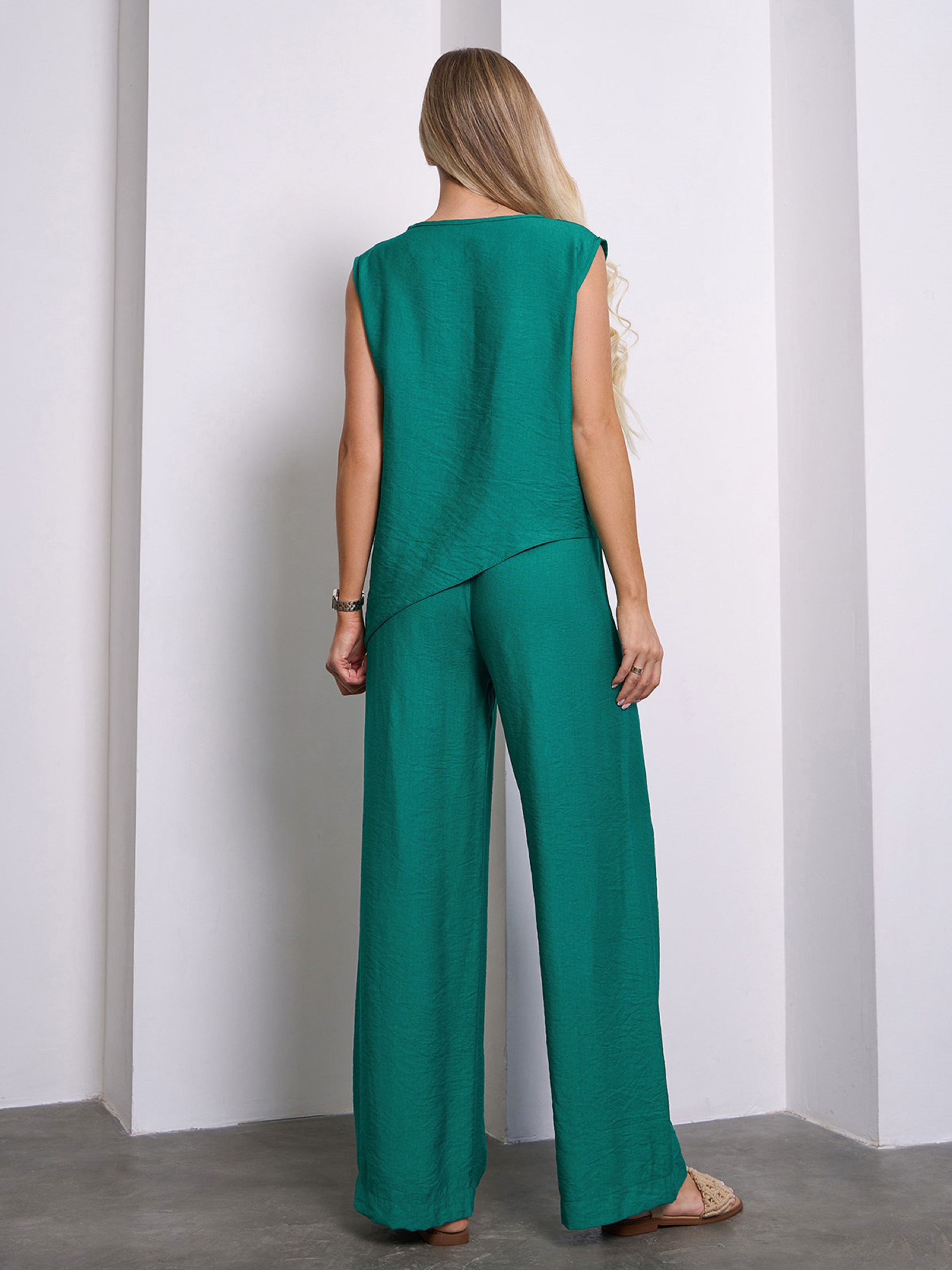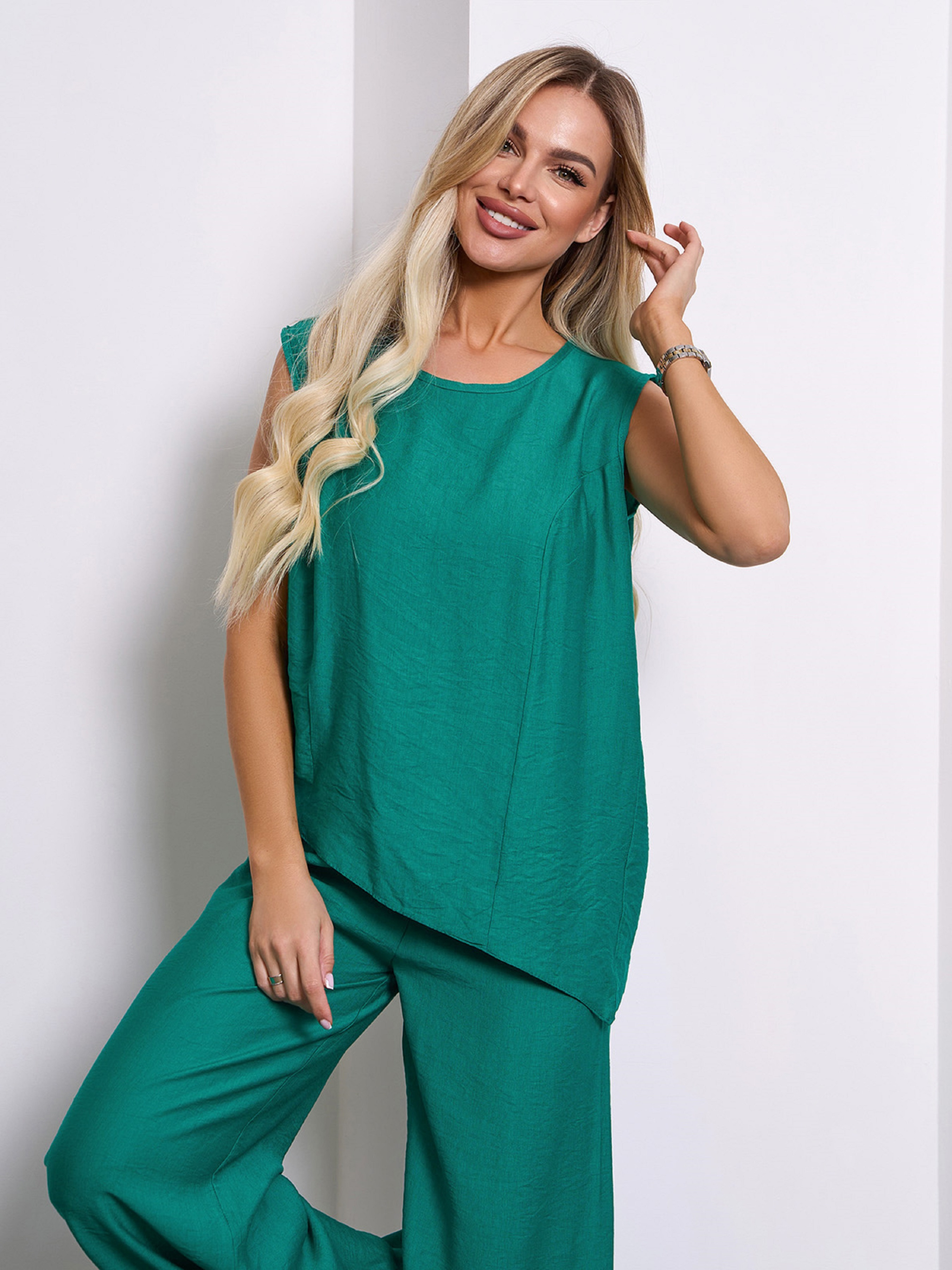 Повседневный брючный костюм из зеленого текстурированного льна. Асимметричный топ без рукавов с прямым кроем и полукруглой проймой горловины. Легкие брюки на резинке с широким свободным кроем и высокой посадкой на талии. Полуобхват: Топ: Грудь: S (50), M (52), L (54), XL (56), Длина изделия - 52/66, Брюки: Талия: S (30-40), M (32-42), L (34-44), XL (36-46), Бедра: S (54), M (56), L (58), XL (60), Длина изделия - 103, Длина по внутреннему шву - 72, Ткань: Низкой эластичности. Состав: 65% лен, 20% хлопок, 15% полиэстер