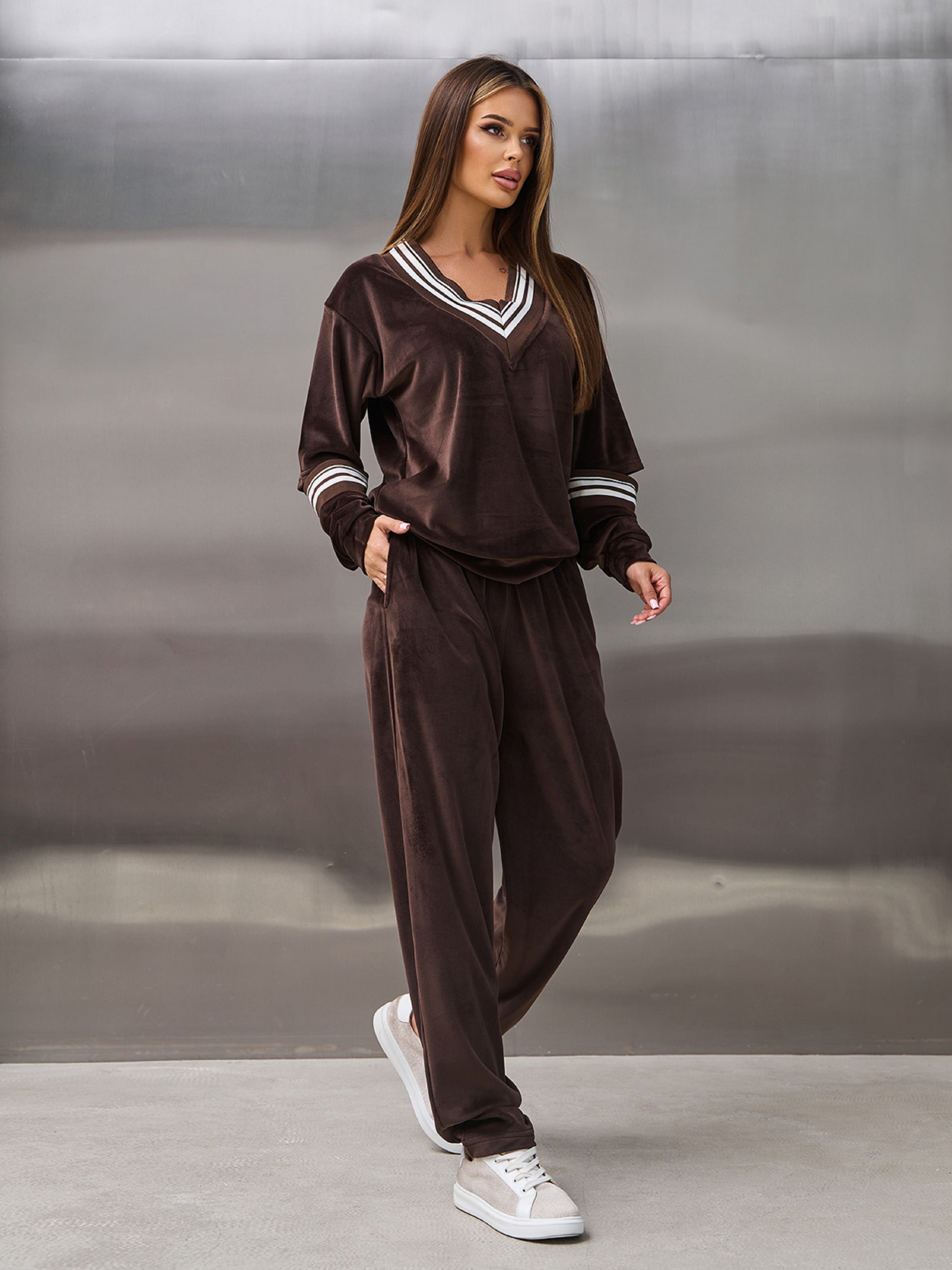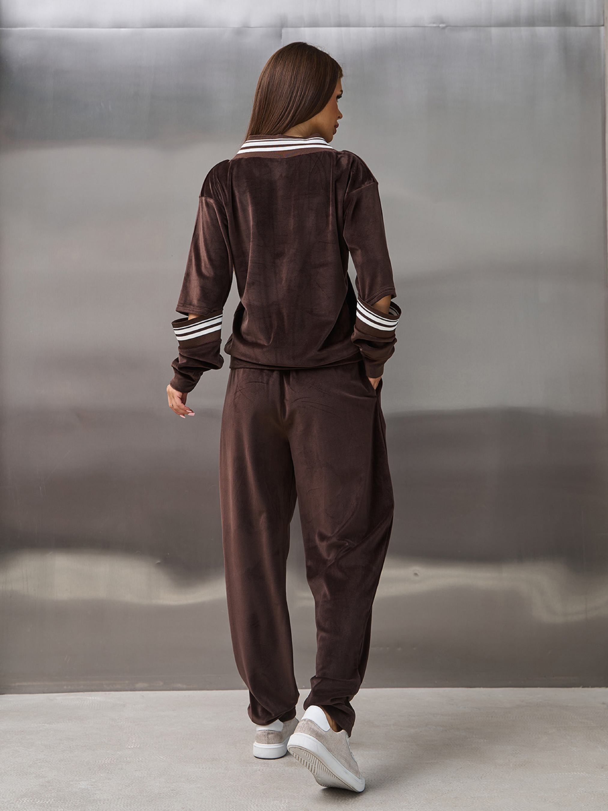 Молодежный велюровый костюм темно-коричневого цвета с полосатыми манжетами и вырезами на рукавах. Пуловер свободного кроя с длинными рукавами и V-образной горловиной. Брюки бананы на резинке с карманами и высокой посадкой. Полуобхват: Кофта: Грудь: S (51), M (53), L (55), XL (57), Длина изделия - 60, Рукав - 56, Брюки: Талия: S (30-38), M (32-40), L (34-42), XL (36-44), Бедра: S (56), M (58), L (60), XL (62), Длина изделия - 103, Длина по внутреннему шву - 74, Ткань: Высокой эластичности