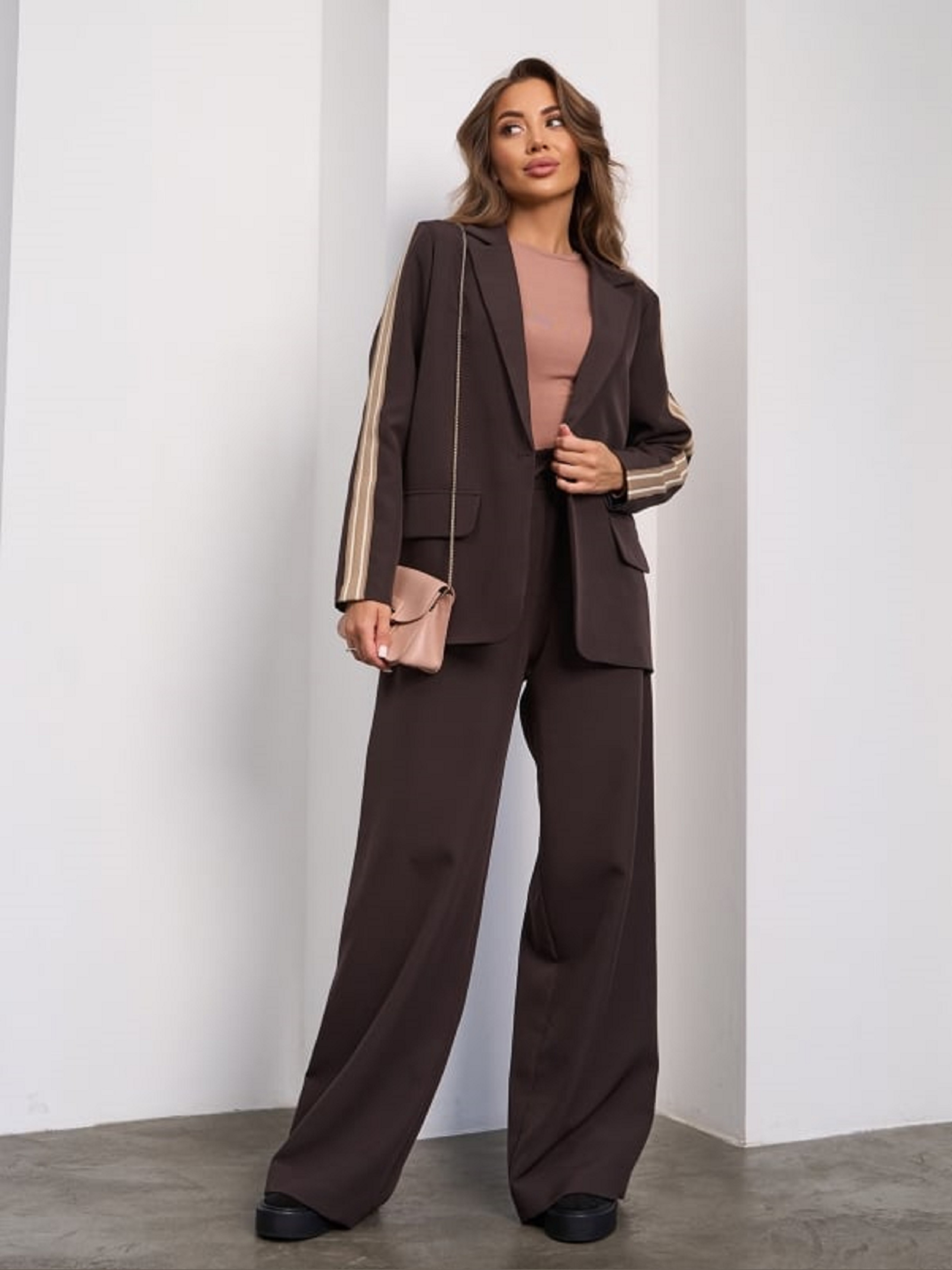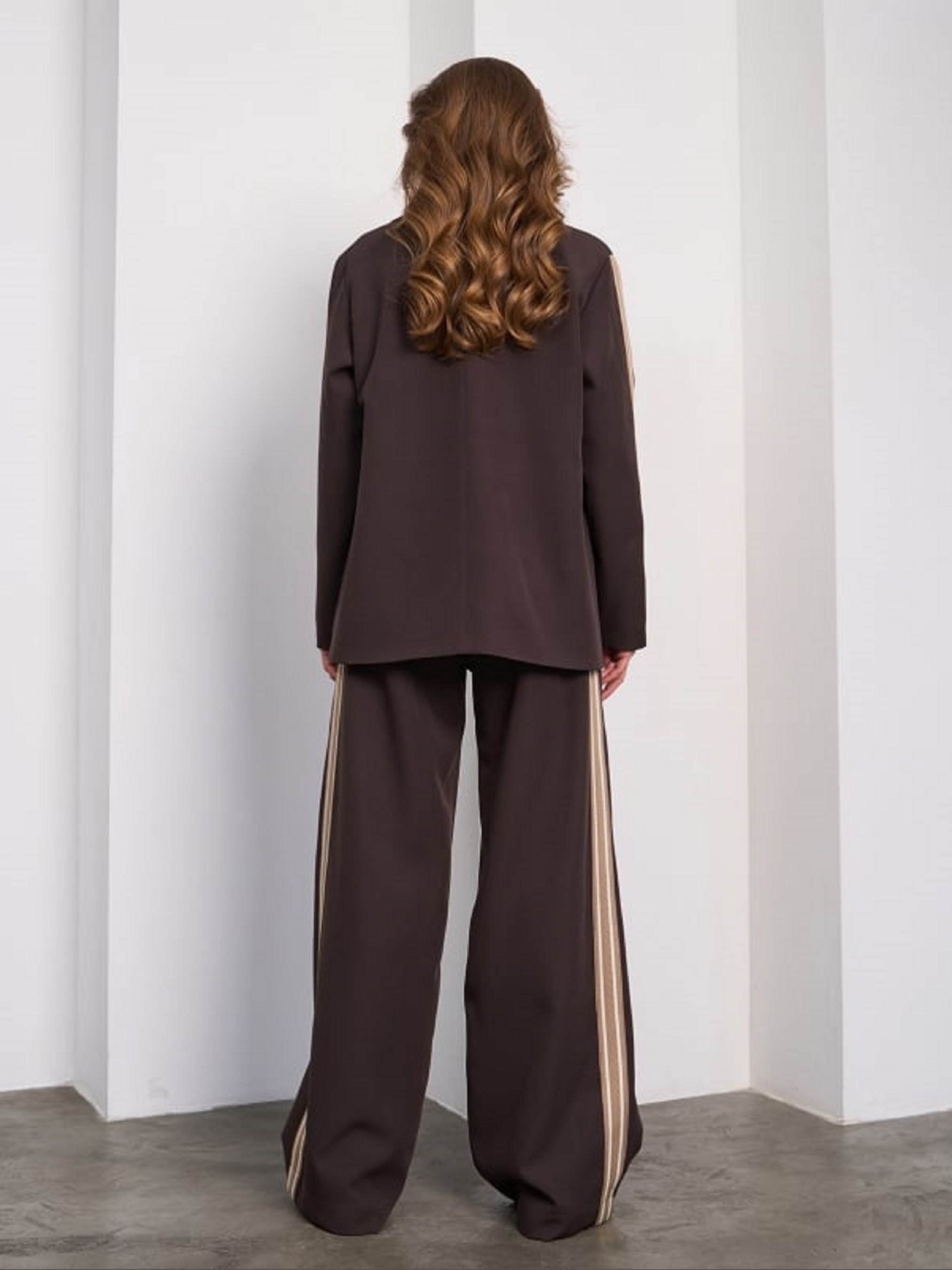 Коричневый костюм из плотной костюмки с декоративными лампасами. Пиджак с нижним подкладом и декоративными клапанами. Модель на пуговице с традиционным кроем. Брюки на эластичной поясной резинке с широким прямым кроем и карманами. На поясе шнуровка. Полуобхват: Пиджак: Грудь: S (54), M (56), L (58), XL (60), Длина изделия - 70, Рукав - 60, Брюки: Талия: S (31-38), M (33-40), L (35-42), XL (37-44), Бедра: S (55), M (57), L (59), XL (61), Длина изделия - 112, Длина по внутреннему шву - 80, Ткань: Низкой эластичности.