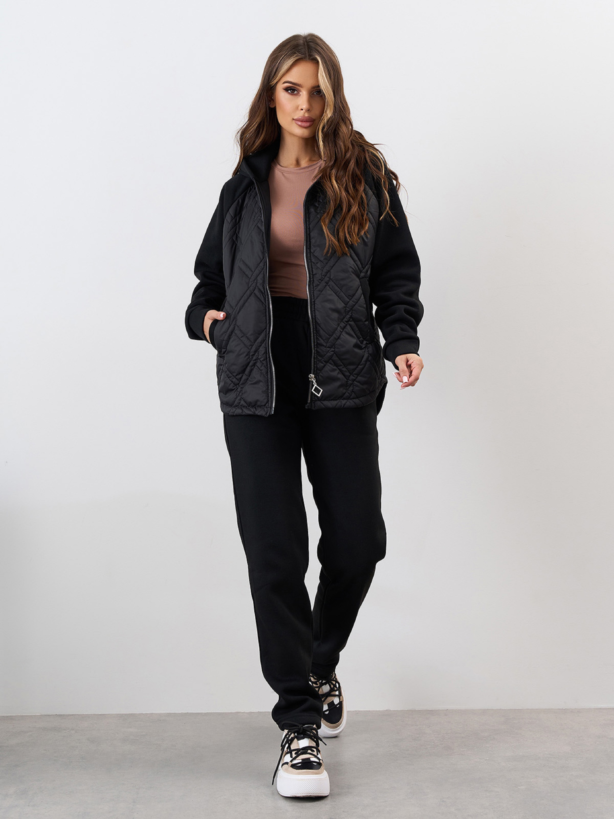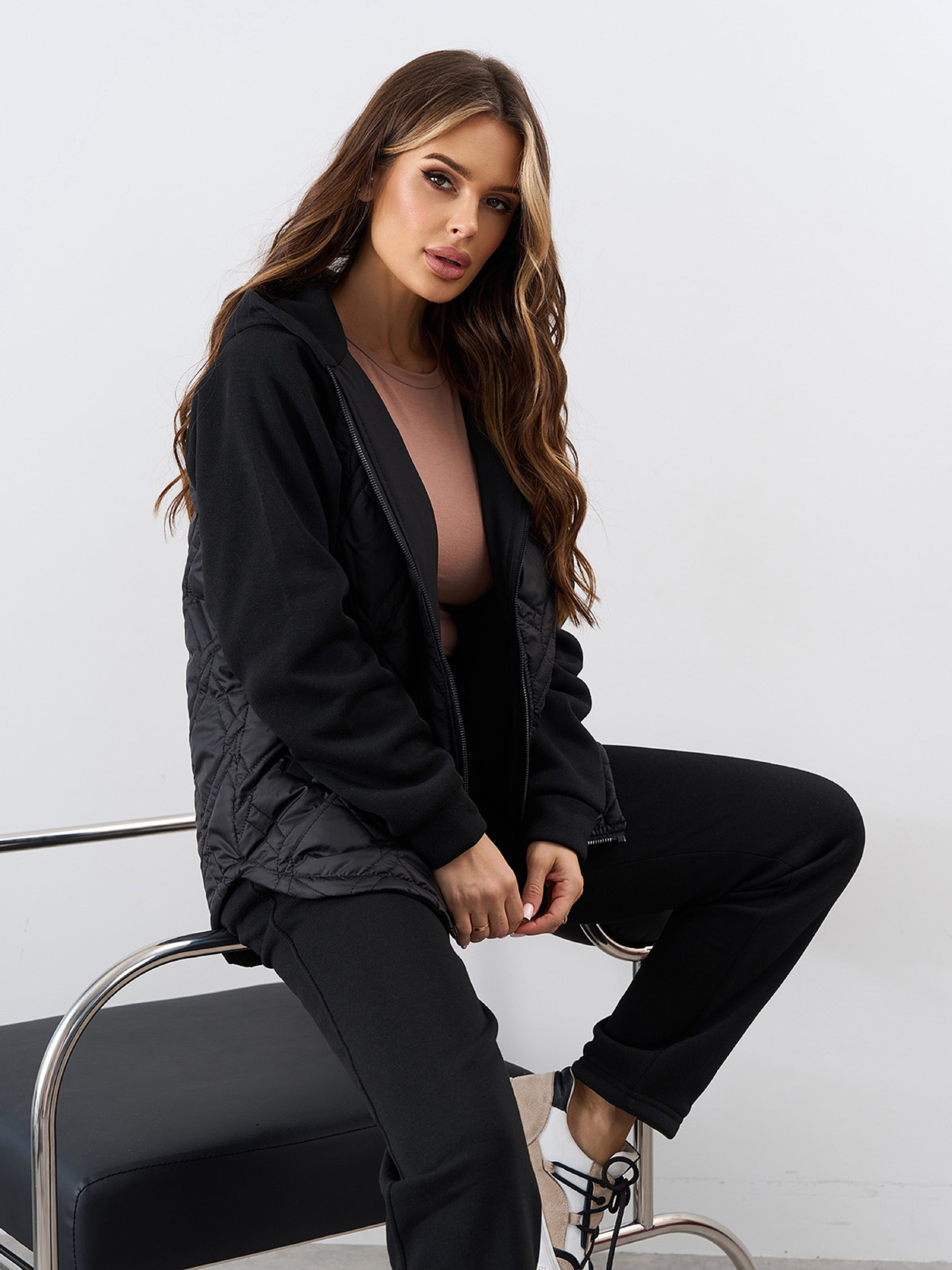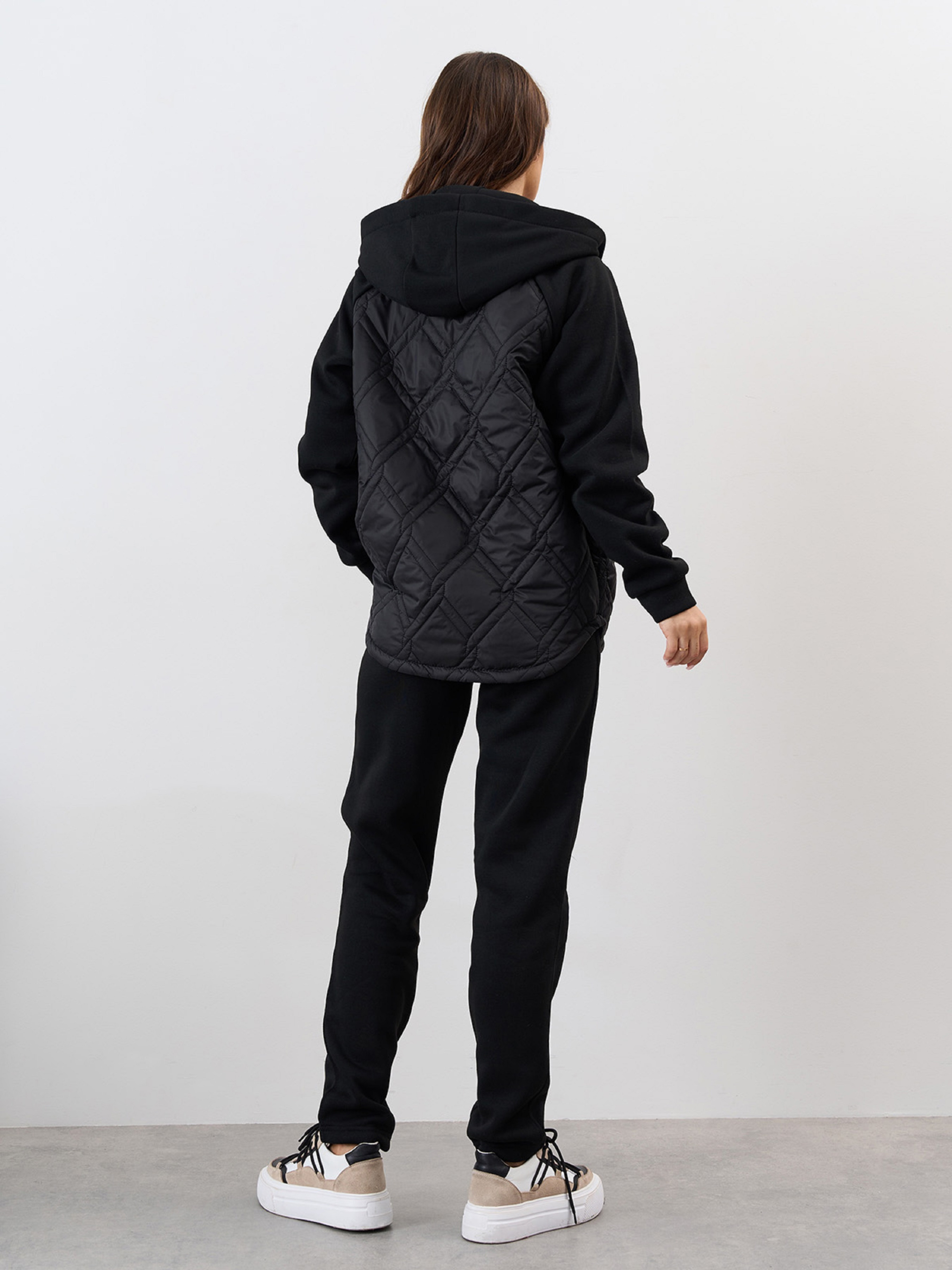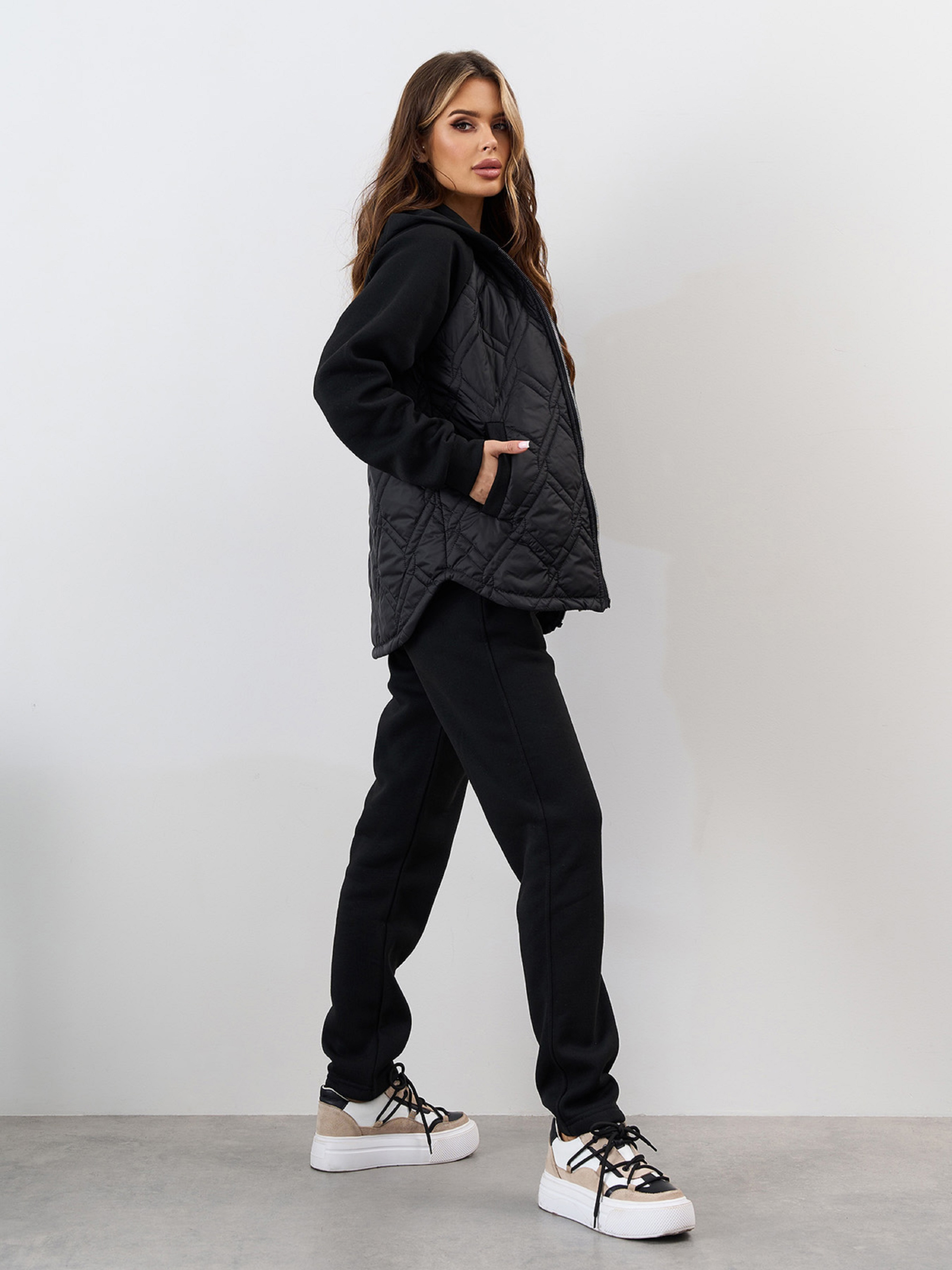 Комбинированный костюм из черного теплого трикотажа на флисе и стеганой плащевки на тонком синтепоне. Верх костюма прямого кроя с капюшоном и длинными рукавами. Изделие со скругленным кроем низа и боковыми карманами. Брюки прямого кроя с поясной резинкой и карманами. Полуобхват: Кофта: Грудь: S (50), M (52), L (54), XL (56), XXL (58), 3XL (60), Длина изделия - 66, Рукав - 58, Брюки: Талия: S (30-38), M (32-40), L (34-42), XL (36-44), XXL (38-46), 3XL (40-48), Бедра: S (50), M (52), L (54), XL (56), XXL (58), 3XL (60), Длина изделия - 100, Длина по внутреннему шву - 77, Ткань: Низкой эластичности.