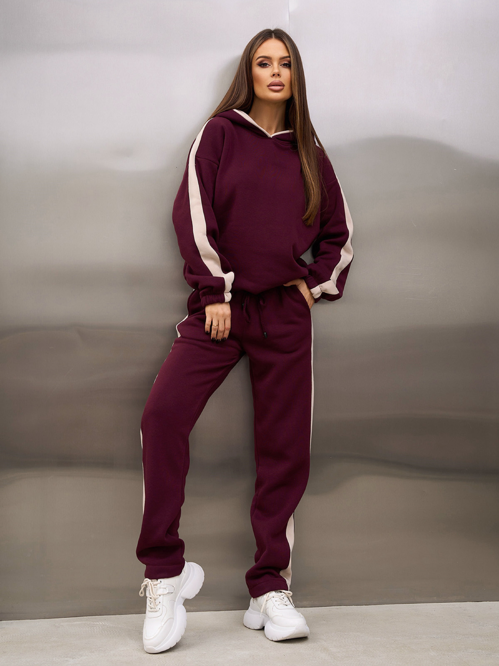 Утепленный костюм в спортивном стиле, выполненный из трикотажа на флисе темно-коричневого цвета с бежевыми вставками. Толстовка с капюшоном, длинными рукавами на эластичных манжетах и нижней кулиской. Брюки зауженного к низу кроя с поясной резинкой и карманами. Полуобхват: Кофта: Грудь: S (53), M (55), L (57), XL (59), Длина изделия - 59, Рукав - 50, Брюки: Талия: S (30-36), M (32-38), L (34-40), XL (36-42), Бедра: S (50), M (52), L (54), XL (56), Длина изделия - 103, Длина по внутреннему шву - 75, Ткань: Средней эластичности.