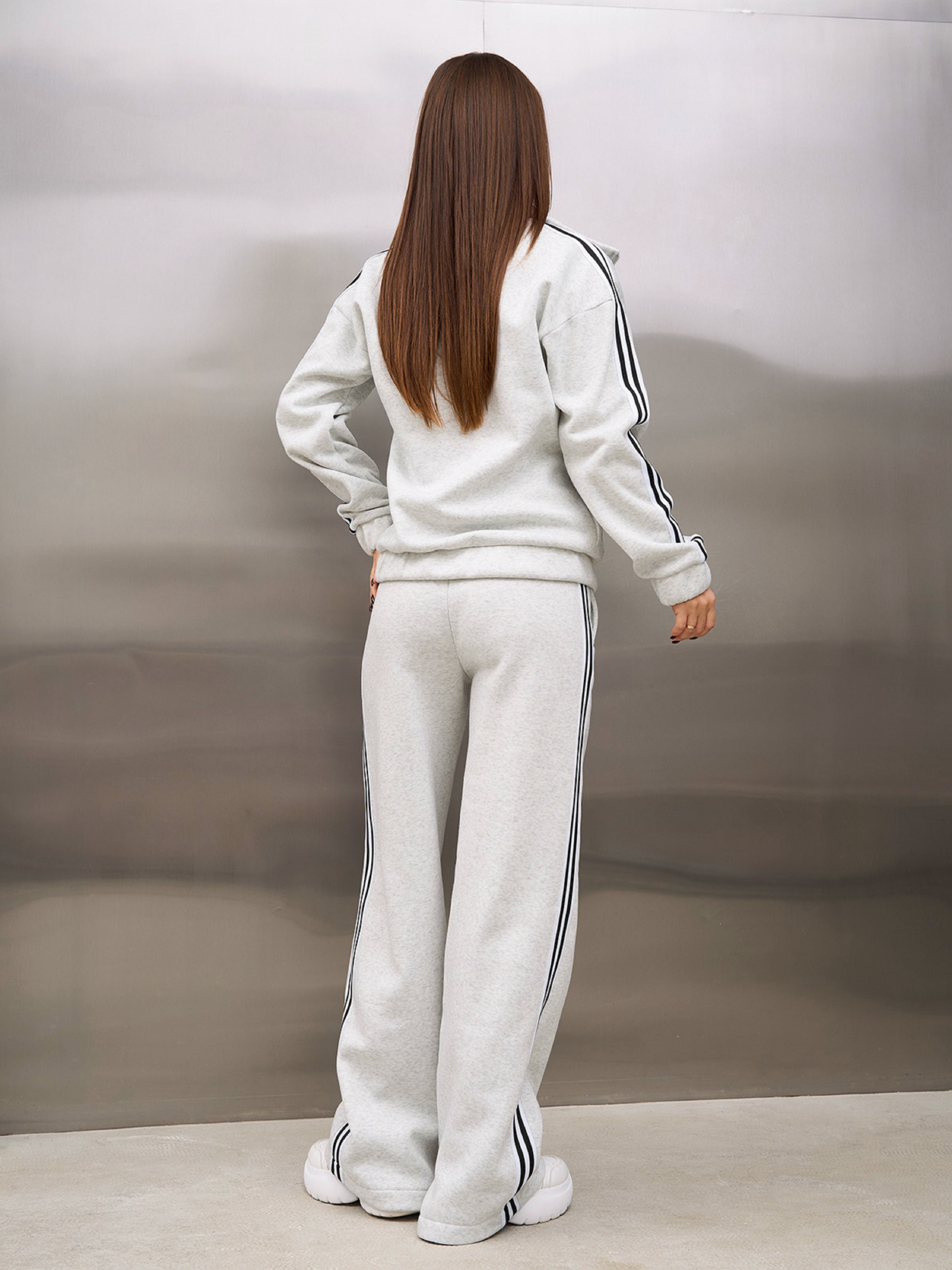 Утепленный светло-серый костюм из трикотажа на флисе с боковыми полосатыми лампасами. Толстовка на молнии с воротником-стойкой и передними карманами. Брюки прямого кроя с высокой посадкой, боковыми карманами и резинкой на поясе. Полуобхват: Кофта: Грудь: S (52), M (54), L (56), XL (58), XXL (60), 3XL (62), Длина изделия - 62, Рукав - 54, Брюки: Талия: S (32-37), M (34-39), L (36-41), XL (38-43), XXL (40-45), 3XL (42-47), Бедра: S (48), M (50), L (52), XL (54), XXL (56), 3XL (58), Длина изделия - 111, Длина по внутреннему шву - 79, Ткань: Высокой эластичности