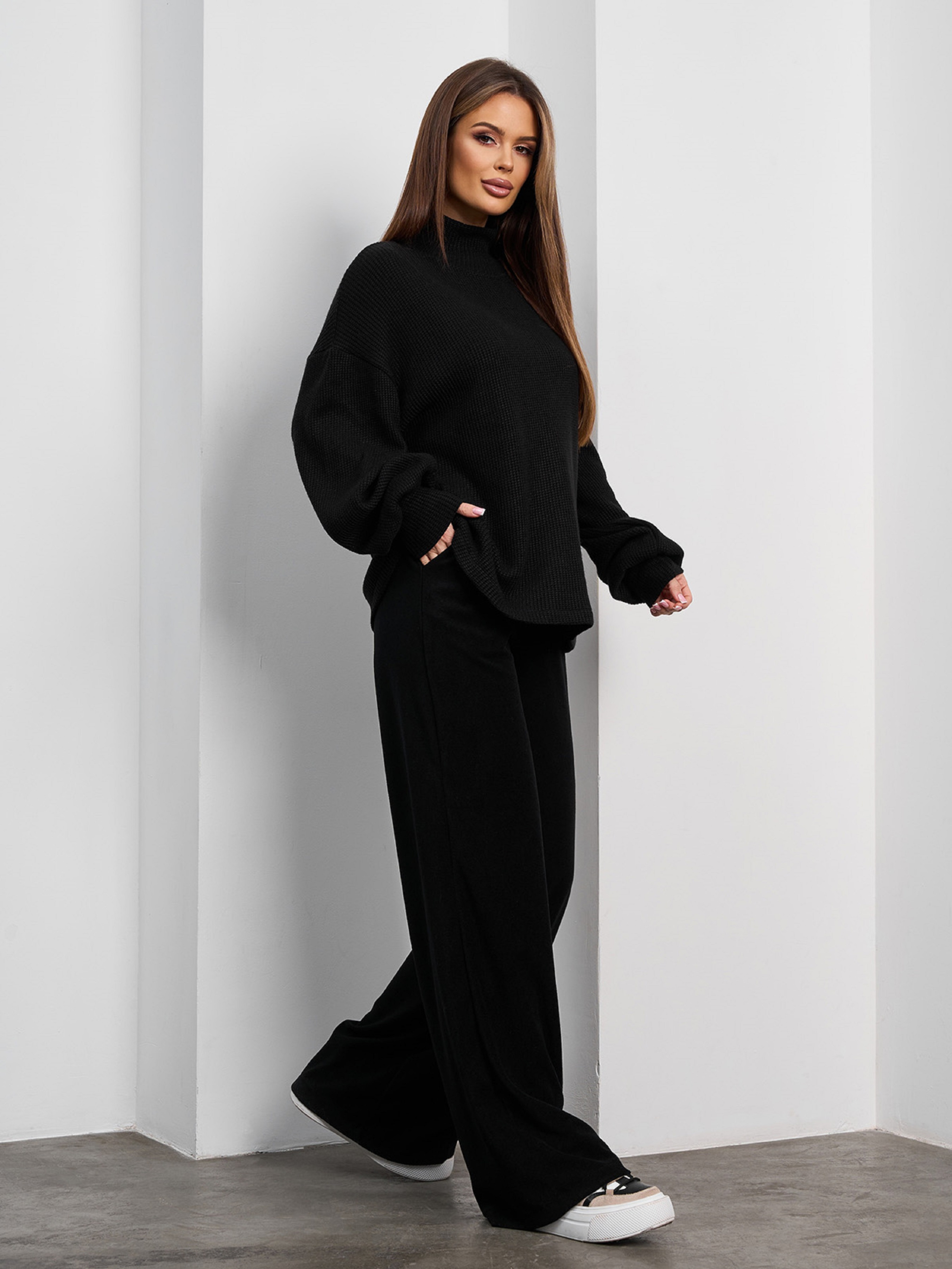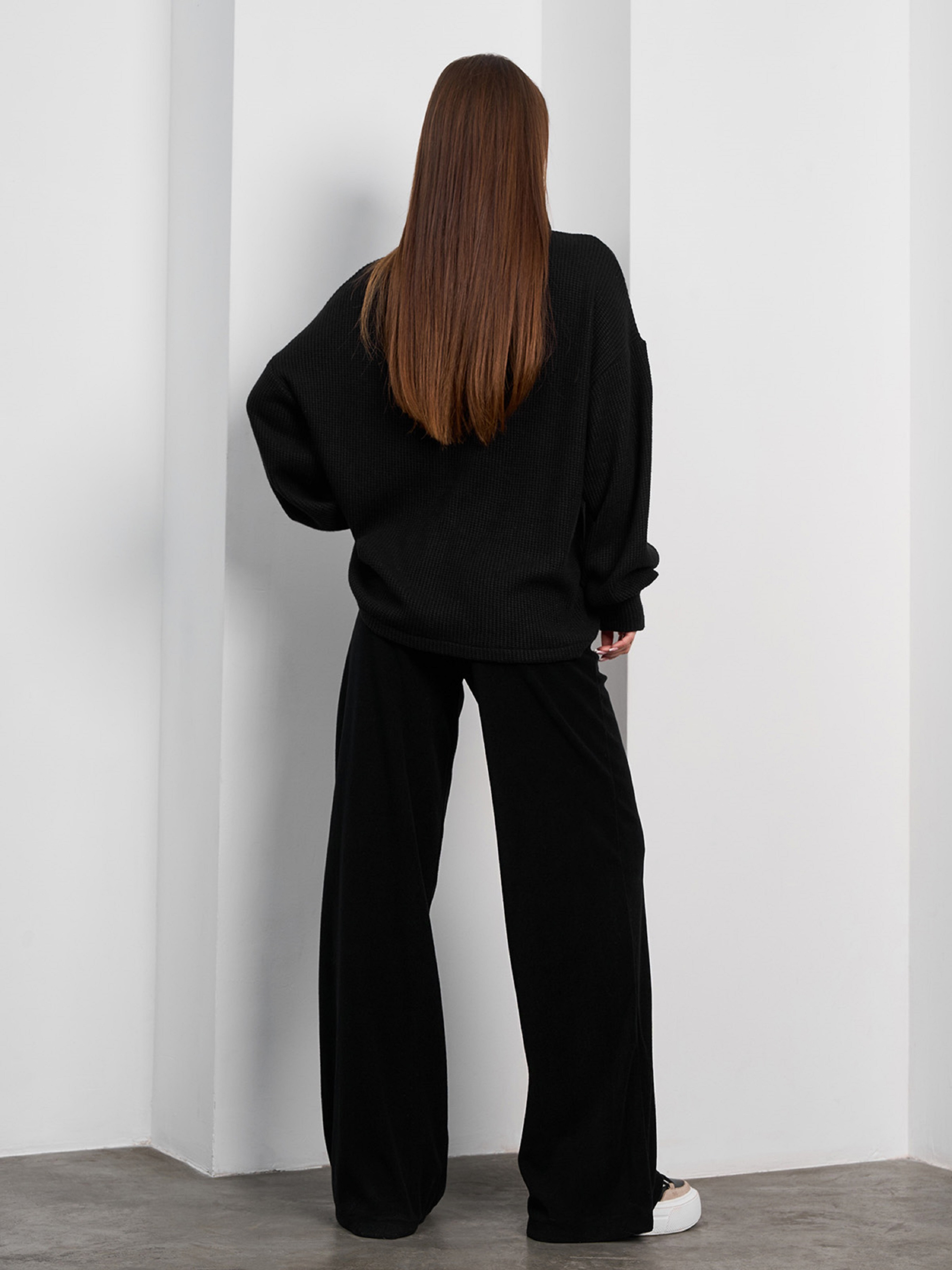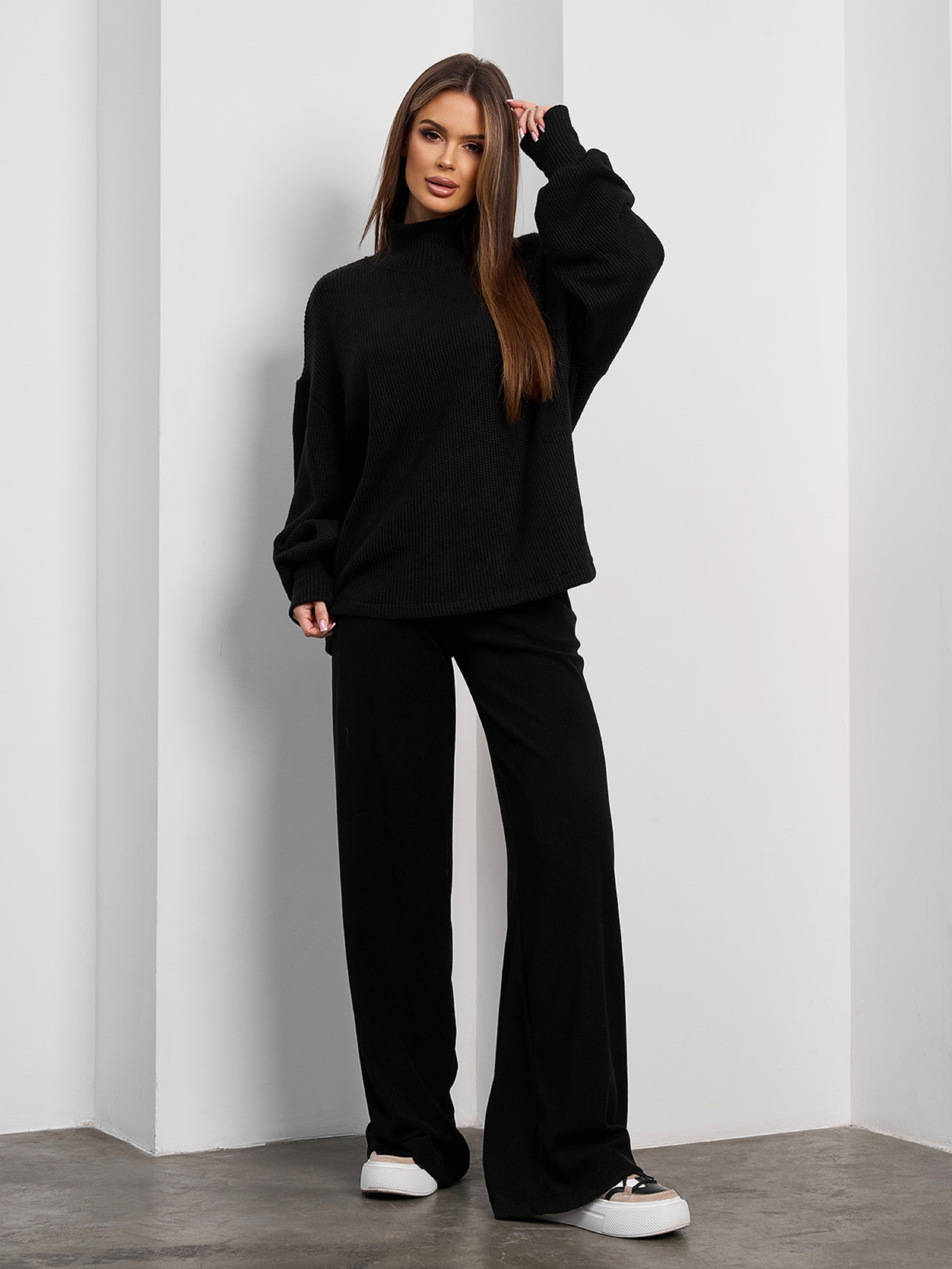 Черный комбинированный костюм с вязаным свитером и широкими брюками из плотной вискозы. Свитер свободного кроя с воротником-стойкой и длинными рукавами на манжетах. Брюки высокой посадки с поясной резинкой и карманами. Полуобхват: Кофта: Грудь: S (60), M (62), L (64), XL (66), Длина изделия - 63, Рукав - 56, Брюки: Талия: S (32-40) , M (34-42), L (36-44), XL (38-46), Бедра: S (50), M (52), L (54), XL (56), Длина изделия - 106, Длина по внутреннему шву - 80, Ткань: Высокой эластичности.
