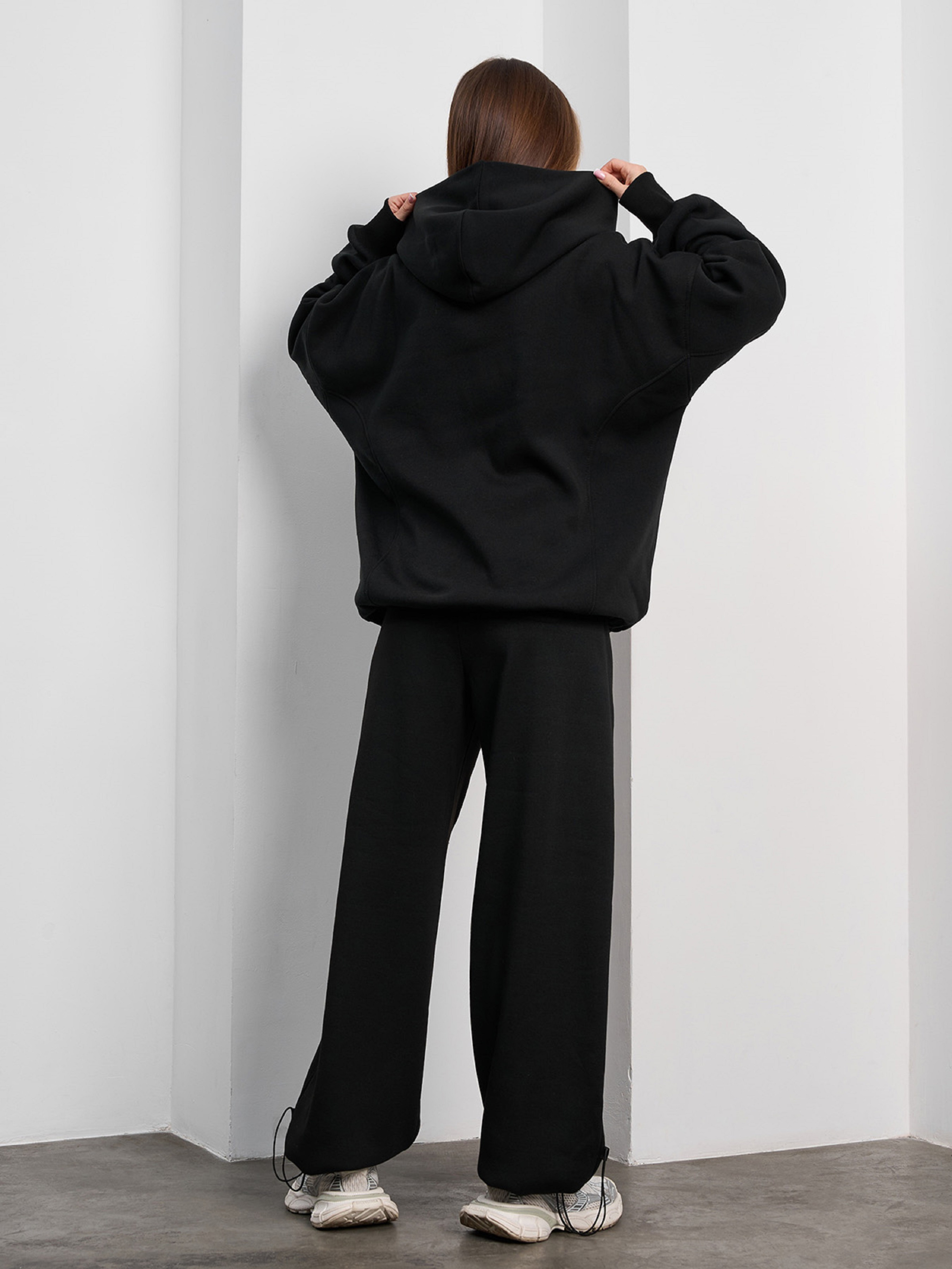 Черный костюм из трикотажа на флисе со свободным кроем. Толстовка-худи с капюшоном, карманами и длинными рукавами на манжетах. Брюки на поясной резинке с широким кроем, боковыми и задним карманами. Толстовка и брюки оснащены кулисками с фиксаторами. Полуобхват: Кофта: Грудь: S (64), M (66), L (68), XL (70), XXL (72), 3XL (74), Длина изделия - 66-69*, Рукав - 65, Брюки: Талия: S (32-40), M (34-42), L (36-44), XL (38-46), XXL (40-48), 3XL (42-50), Бедра: S (51), M (53), L (55), XL (57), XXL (59), 3XL (61), Длина изделия - 105-108*, Длина по внутреннему шву - 72-75*, Ткань: Средней эластичности.