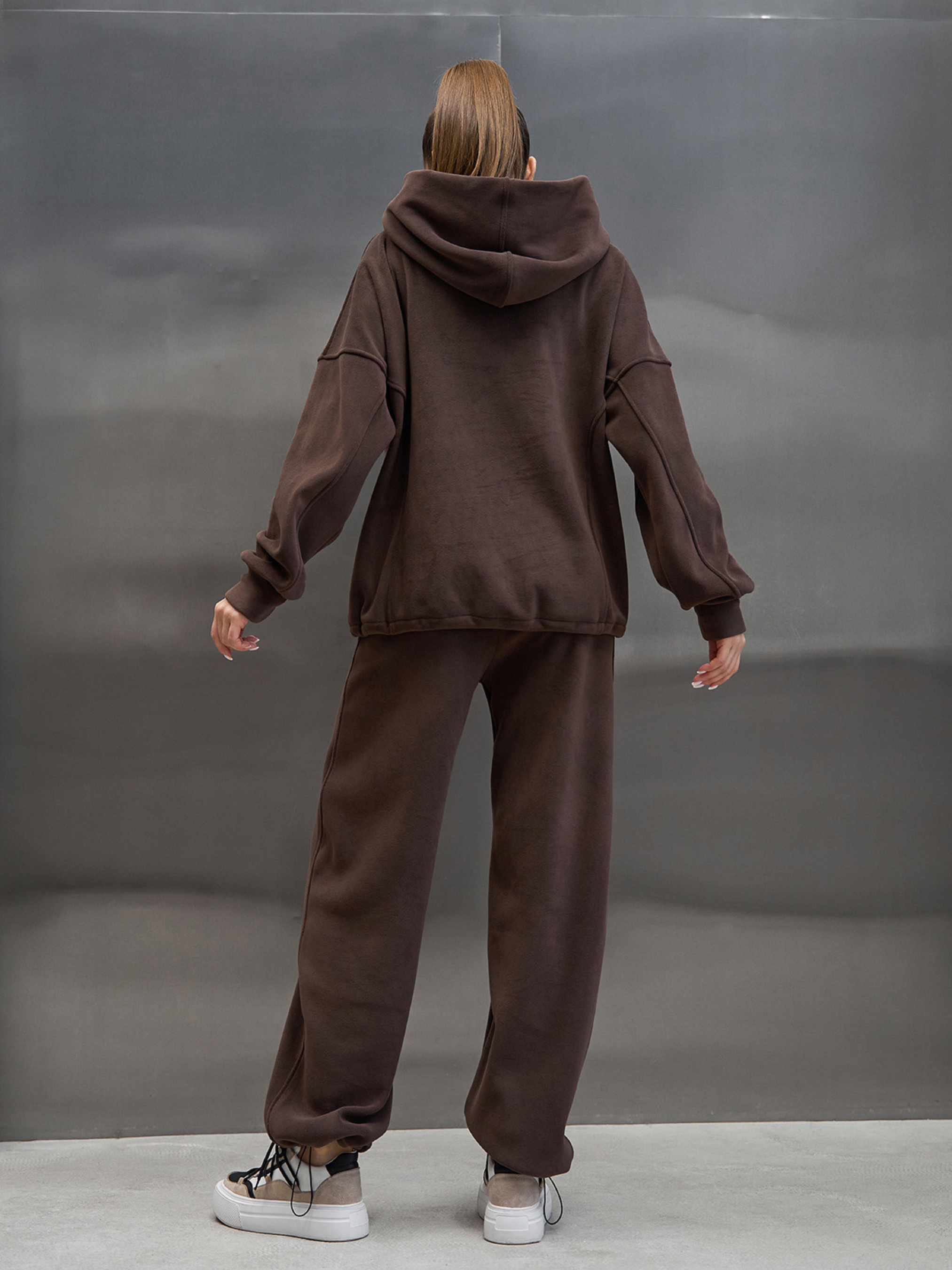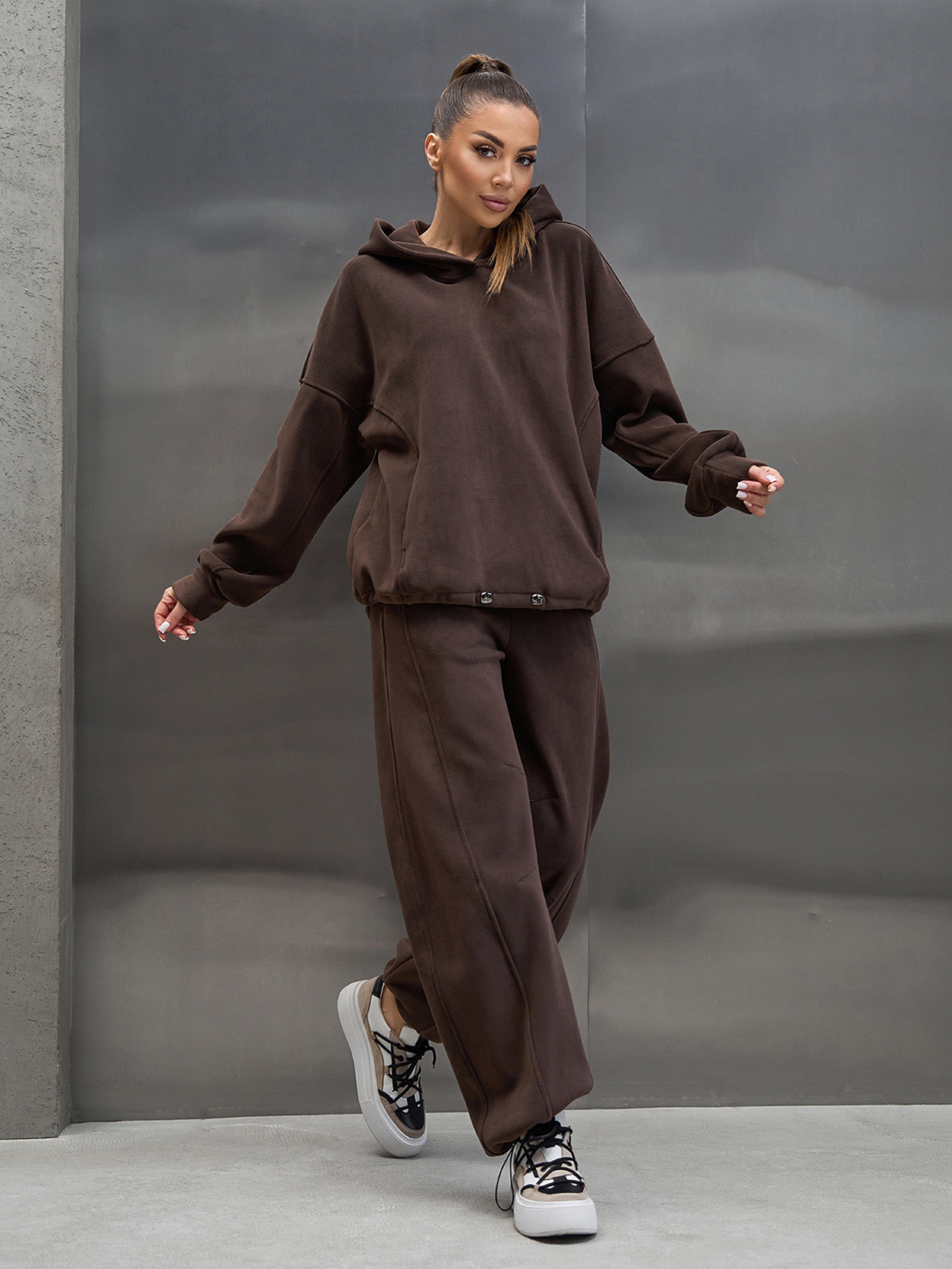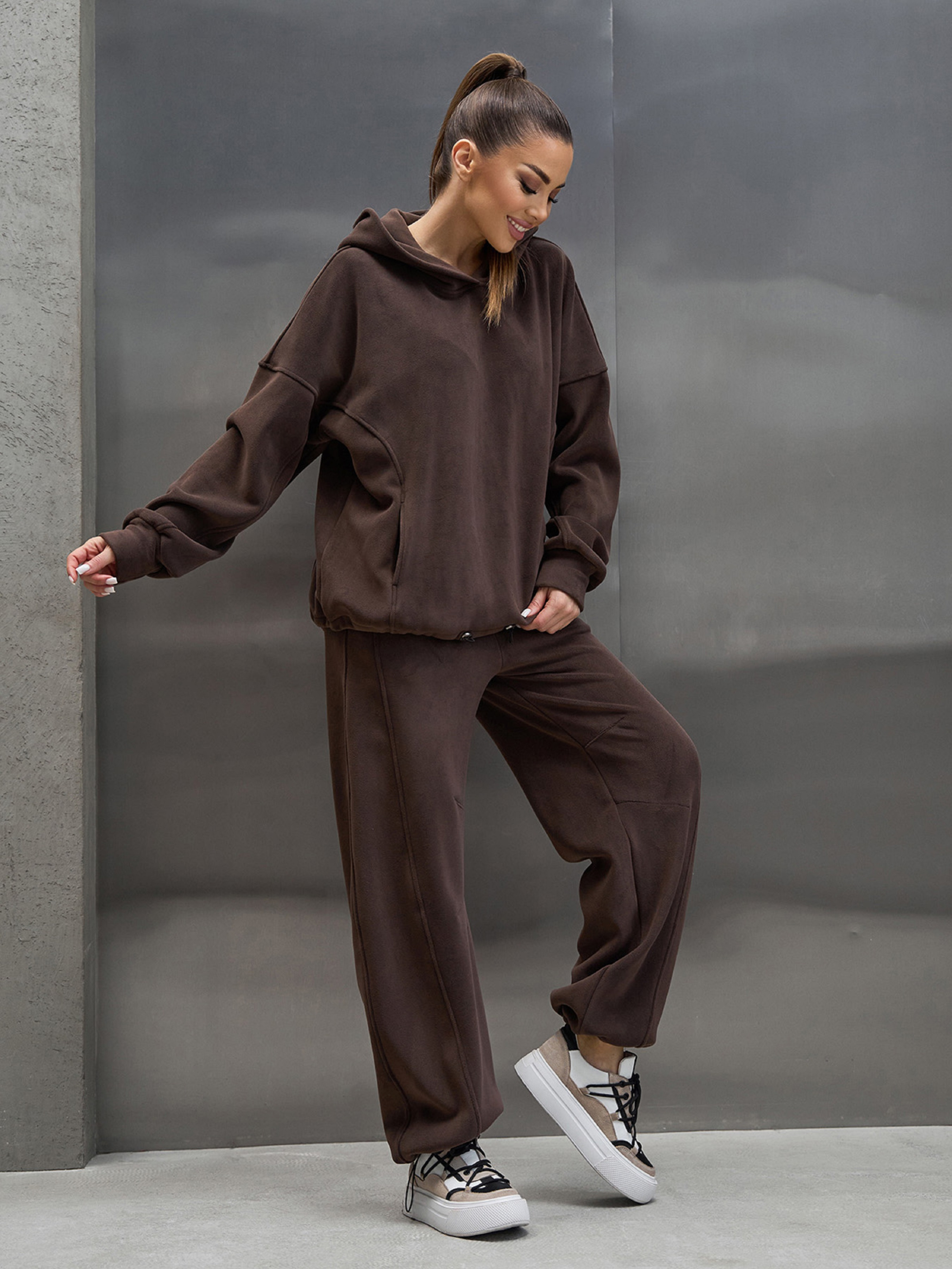 Молодежный оверсайз костюм, выполненный из теплого полар флиса темно-коричневого цвета. Худи с капюшоном, длинными рукавами на манжетах, карманами и нижней кулиской. Брюки широкого кроя с тремя карманами, поясной резинкой и нижними кулисками. Полуобхват: Кофта: Грудь: S (64), M (66), L (68), XL (70), XXL (72), 3XL (74), Длина изделия - 66-69*, Рукав - 65, Брюки: Талия: S (32-40), M (34-42), L (36-44), XL (38-46), XXL (40-48), 3XL (42-50), Бедра: S (51), M (53), L (55), XL (57), XXL (59), 3XL (61), Длина изделия - 105-108*, Длина по внутреннему шву - 72-75*, Ткань: Высокой эластичности.