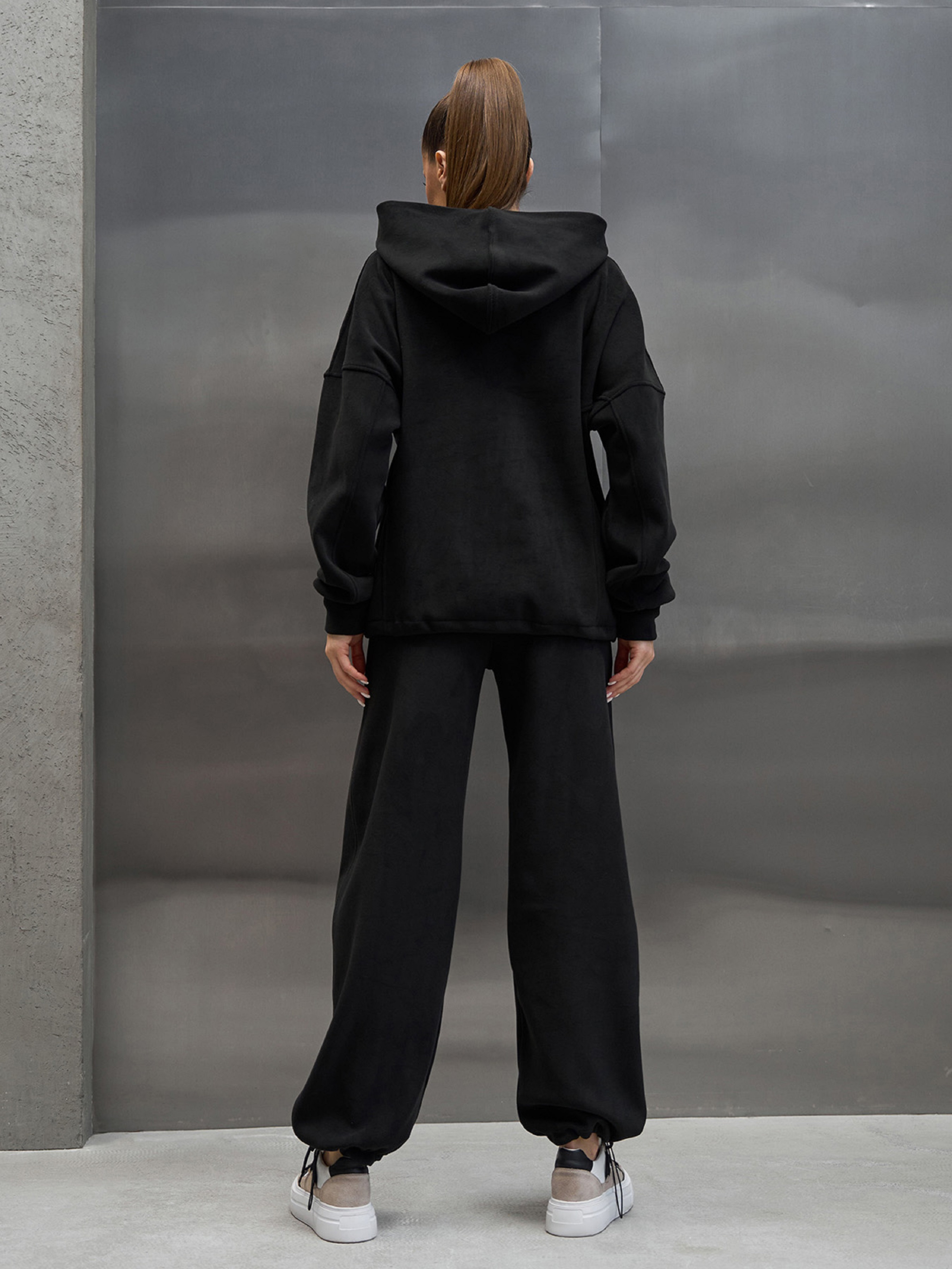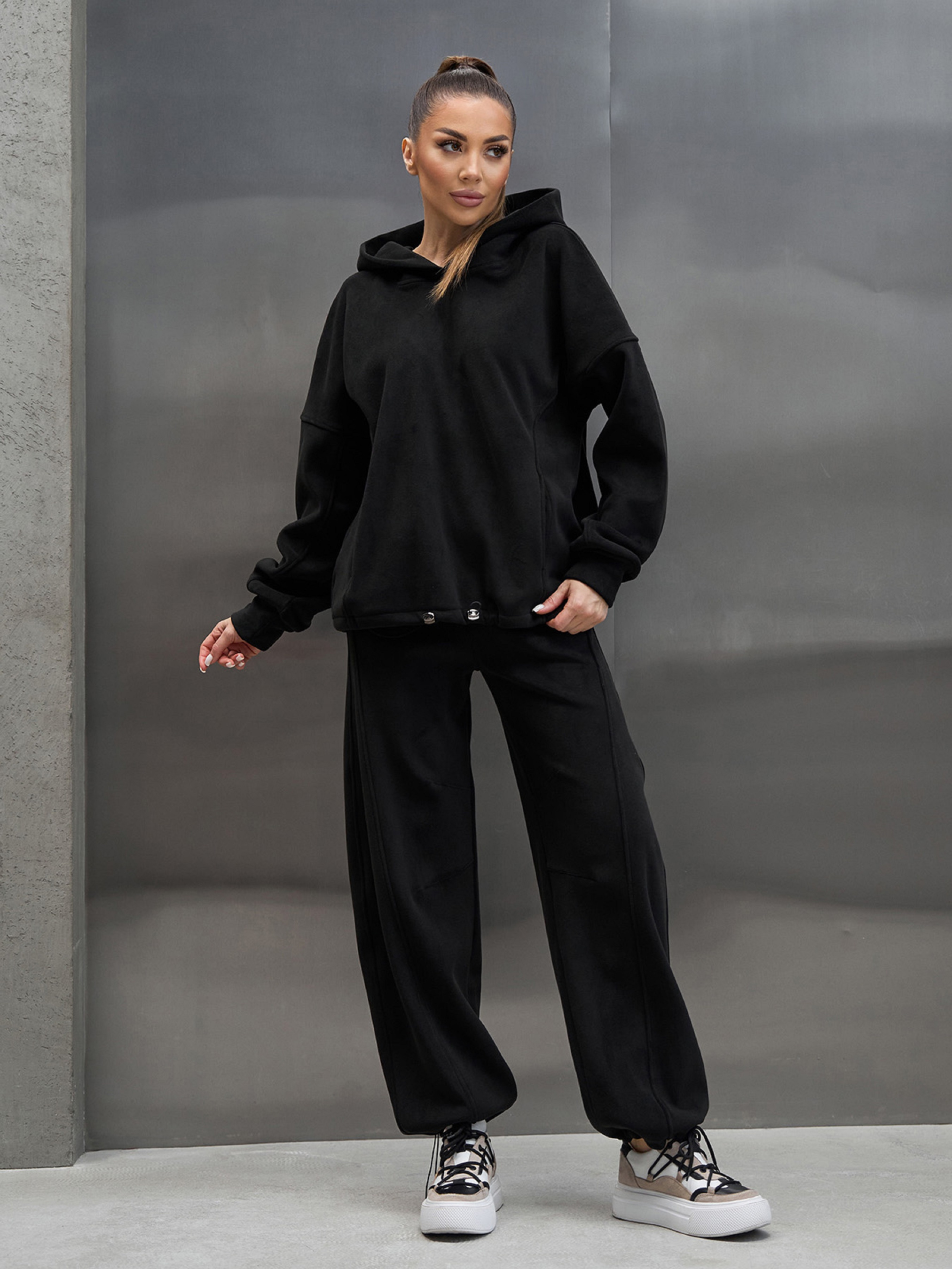 Черный оверсайз костюм, выполненный из теплого полар флиса. Худи с капюшоном, длинными рукавами на манжетах, карманами и нижней кулиской. Брюки широкого кроя с тремя карманами, поясной резинкой и нижними кулисками. Полуобхват: Кофта: Грудь: S (64), M (66), L (68), XL (70), XXL (72), 3XL (74), Длина изделия - 66-69*, Рукав - 65, Брюки: Талия: S (32-40), M (34-42), L (36-44), XL (38-46), XXL (40-48), 3XL (42-50), Бедра: S (51), M (53), L (55), XL (57), XXL (59), 3XL (61), Длина изделия - 105-108*, Длина по внутреннему шву - 72-75*, Ткань: Высокой эластичности.