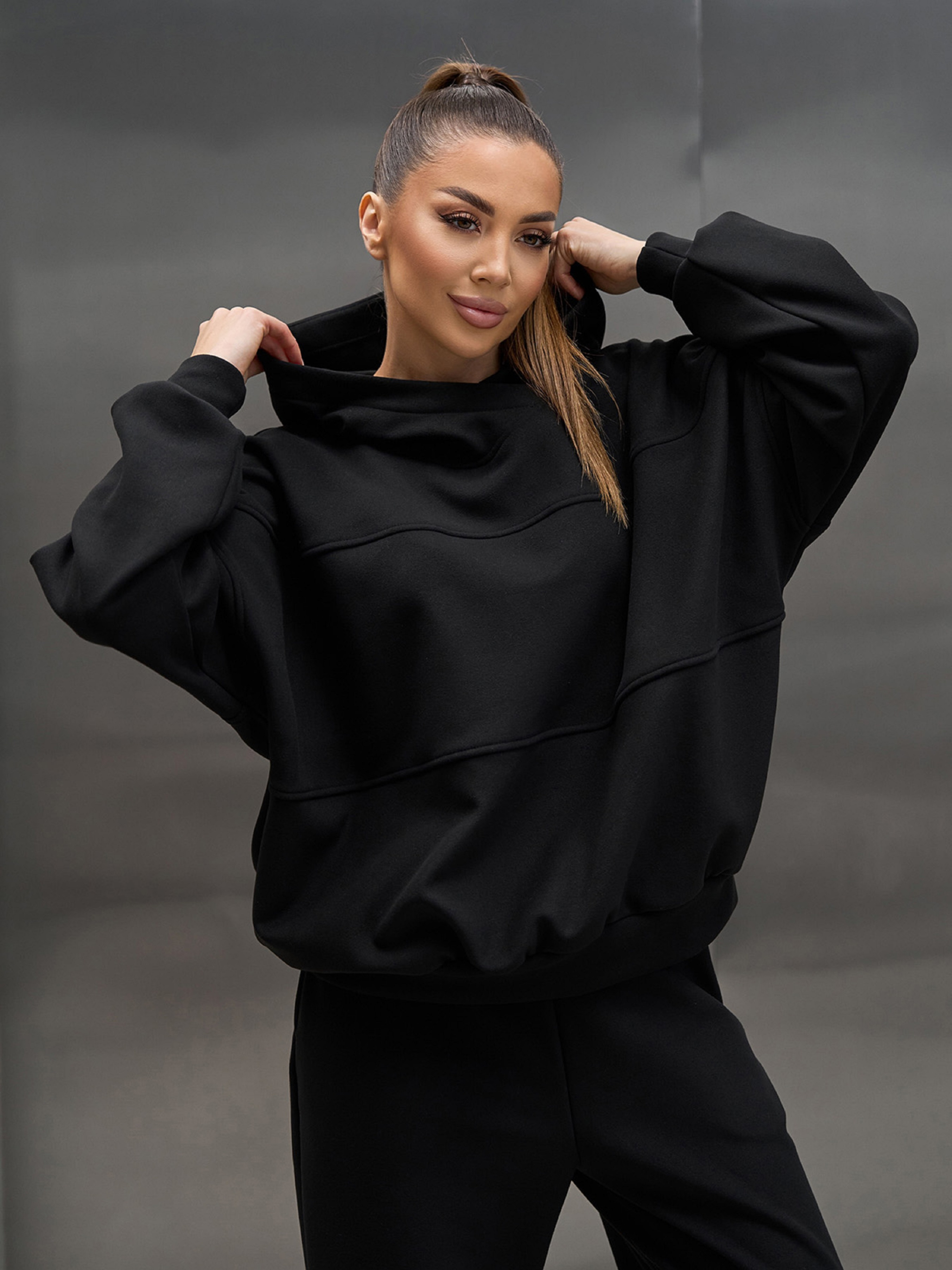 Теплый спортивный костюм на манжетах, выполненный из черной эко-замши на велюре. Толстовка свободного кроя с длинными рукавами и декоративными швами. Свободные спортивные штаны с поясной резинкой, карманами и эластичными нижними манжетами. Полуобхват: Кофта: Грудь: S (69), M (71), L (73), XL (75), Длина изделия - 63, Рукав - 56, Брюки: Талия: S (32-40), M (34-42), L (36-44), XL (38-46), Бедра: S (52), M (54), L (56), XL (58), Длина изделия -97, Длина по внутреннему шву - 69, Ткань: Средней эластичности.