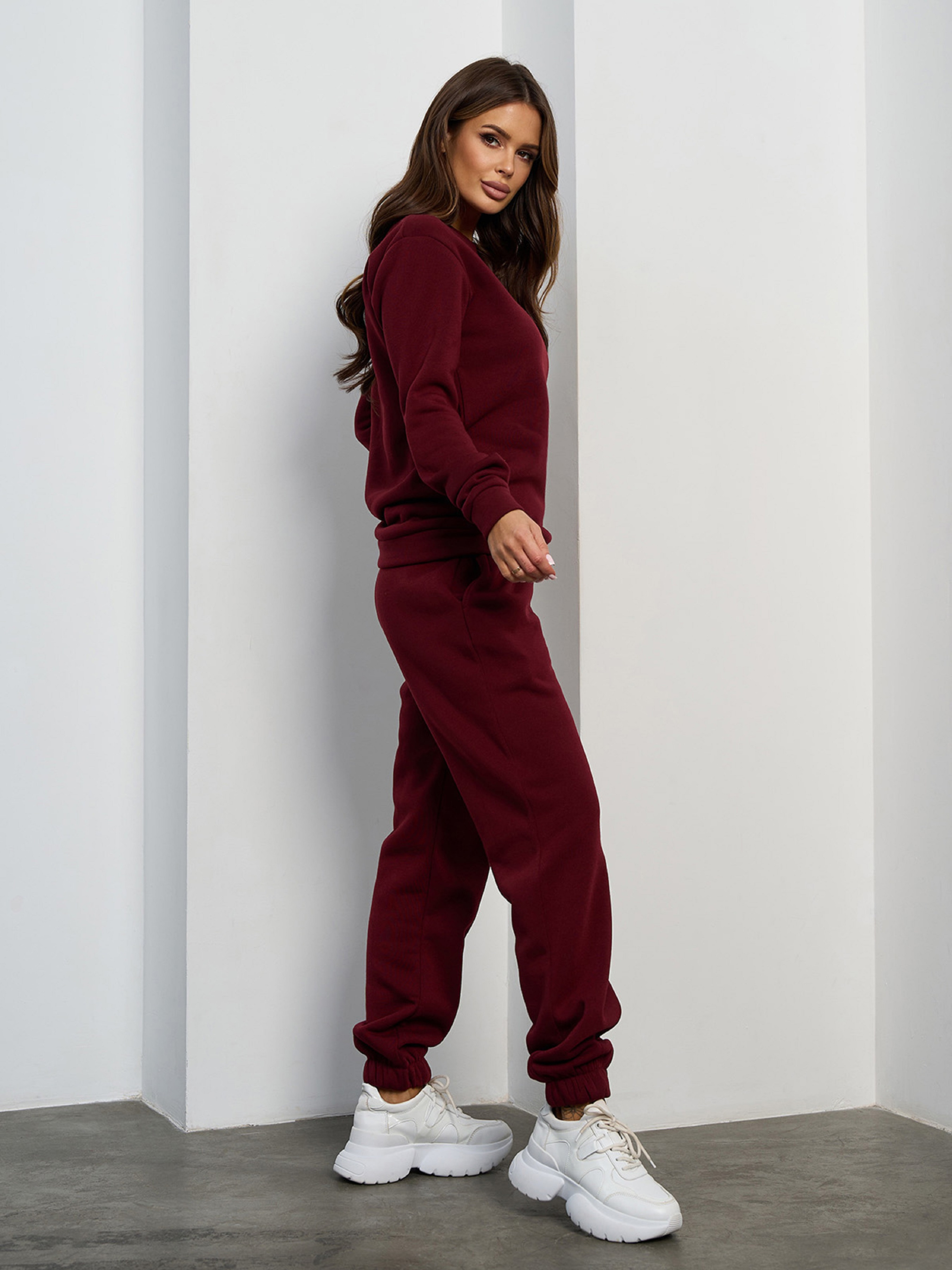 Теплый повседневный костюм из бордового трикотажа на флисе. Модель со свитшотом на манжетах и длинными рукавами. Брюки с карманами, поясной и нижними резинками. Полуобхват: Кофта: Грудь: S (47), M (49), L (51), XL (53), XXL (55), 3XL (57), Длина изделия - 66-70*, Рукав - 61, Брюки: Талия: S (31-38), M (33-40), L (35-42), XL (37-44), XXL (39-46), 3XL (41-48), Бедра: S (51), M (53), L (55), XL (57), XXL (59), 3XL (61), Длина изделия - 101, Длина по внутреннему шву - 74, Ткань: Средней эластичности.