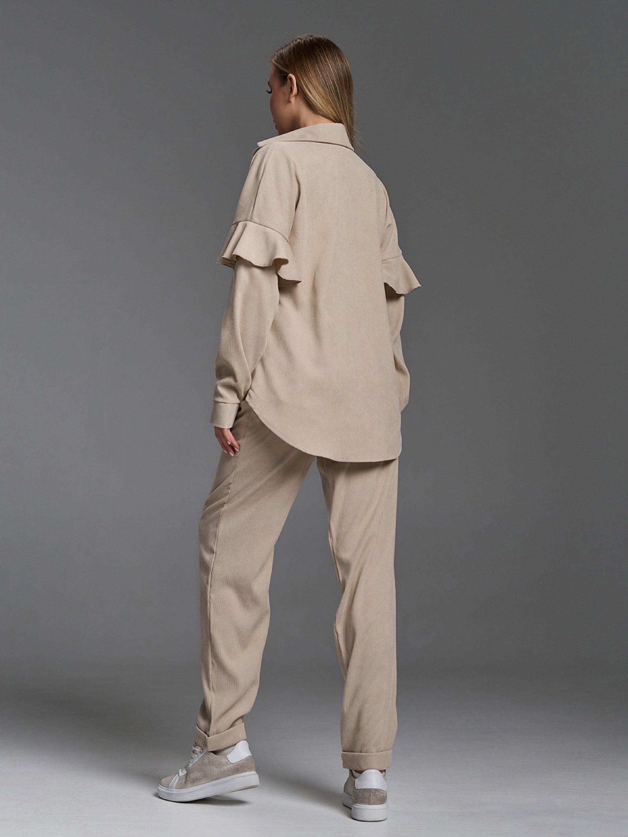 Брючный костюм с воланами на рукавах, выполненный из вельвета светло-бежевого цвета. Рубашка на пуговицах с накладными карманами и длинными рукавами на манжетах. Брюки-бананы с зауженным к низу свободным кроем оснащены застежками на молнию и пуговицу. Брюки с резинкой сзади на поясе и карманами оснащены защипами и подворотами. Полуобхват: Рубашка: Грудь: S (49), M (51), L (53), XL (55), Длина изделия - 70, Рукав - 60, Брюки: Талия: S (34), M (36), L (38), XL (40), Бедра: S (48), M (50), L (52), XL (54), Длина изделия - 101, Длина по внутреннему шву - 76, Ткань: Низкой эластичности.