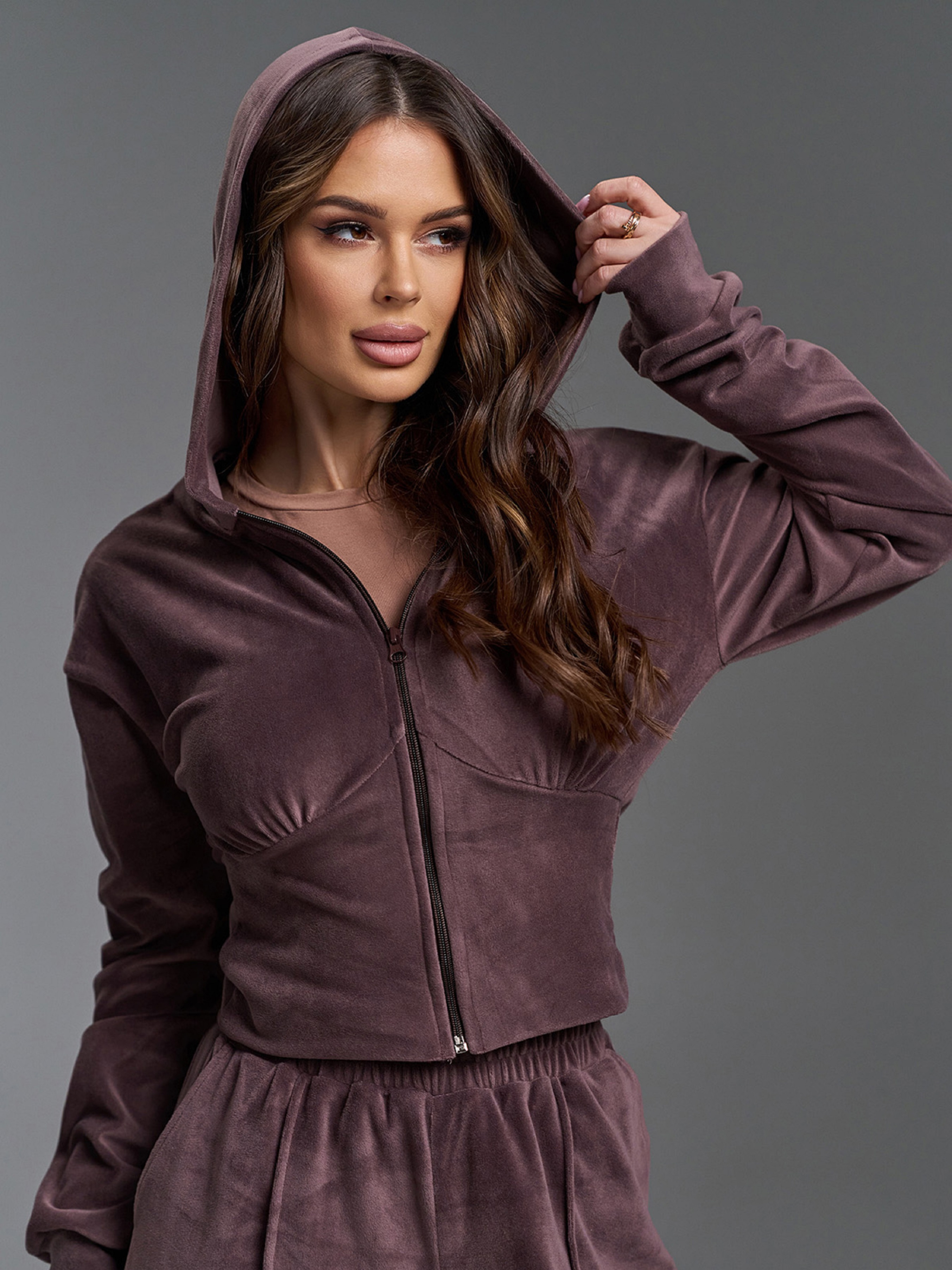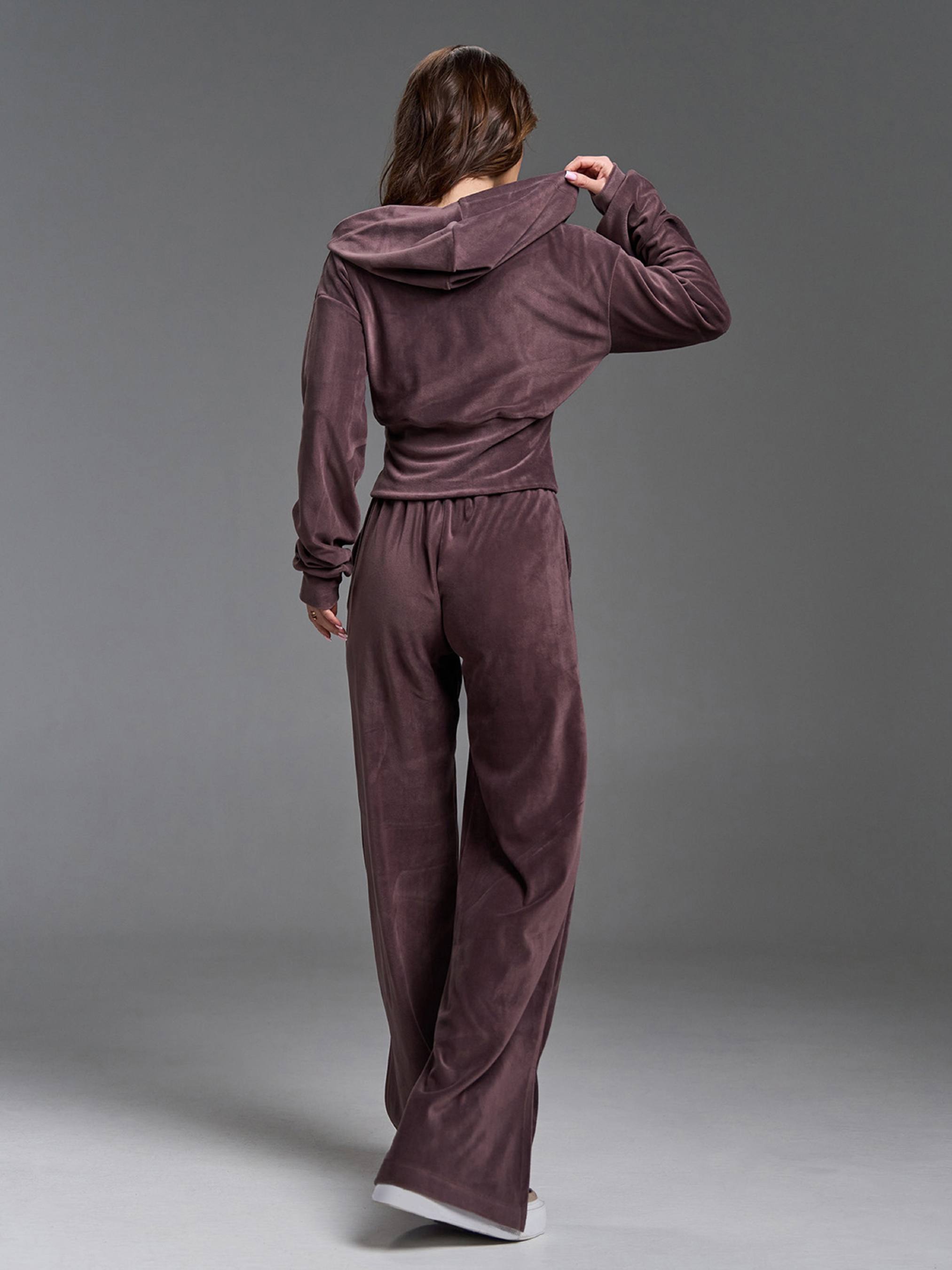 Велюровый коричневый костюм на молнии с укороченной облегающей толстовкой. Худи с капюшоном, длинными рукавами на манжетах и вставкой на талии. Брюки на резинке с широким прямым кроем, карманами и стрелками. Полуобхват: Кофта: Грудь: S (47), M (49), L (51), XL (53), Длина изделия - 49, Рукав - 58, Брюки: Талия: S (30-38), M (32-40), L (34-42), XL (36-44), Бедра: S (52), M (54), L (56), XL (58), Длина изделия - 107, Длина по внутреннему шву - 81, Ткань: Высокой эластичности.