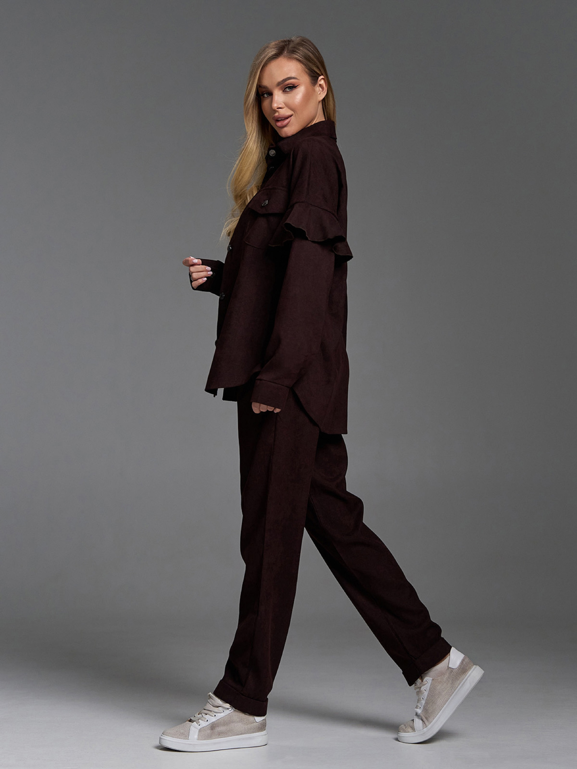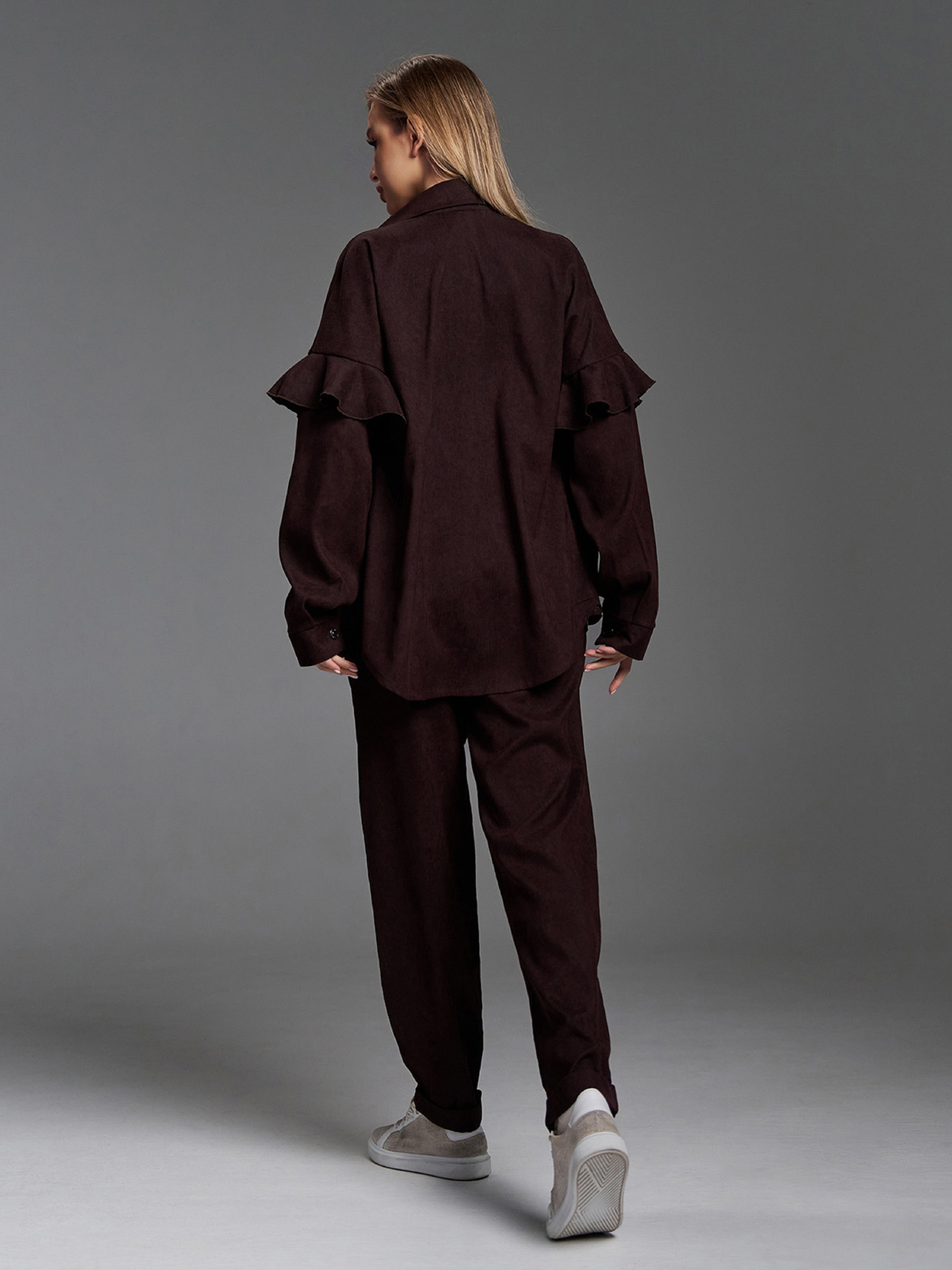 Вельветовый темно-коричневый костюм с брюками-бананами и воланами на рукавах рубашки. Рубашка на пуговицах с накладными карманами и длинными рукавами на манжетах. Брюки с зауженным к низу свободным кроем оснащены застежками на молнию и пуговицу. Брюки с резинкой сзади на поясе и карманами оснащены защипами и подворотами. Полуобхват: Рубашка: Грудь: S (49), M (51), L (53), XL (55), Длина изделия - 70, Рукав - 60, Брюки: Талия: S (34), M (36), L (38), XL (40), Бедра: S (48), M (50), L (52), XL (54), Длина изделия - 101, Длина по внутреннему шву - 76, Ткань: Низкой эластичности.