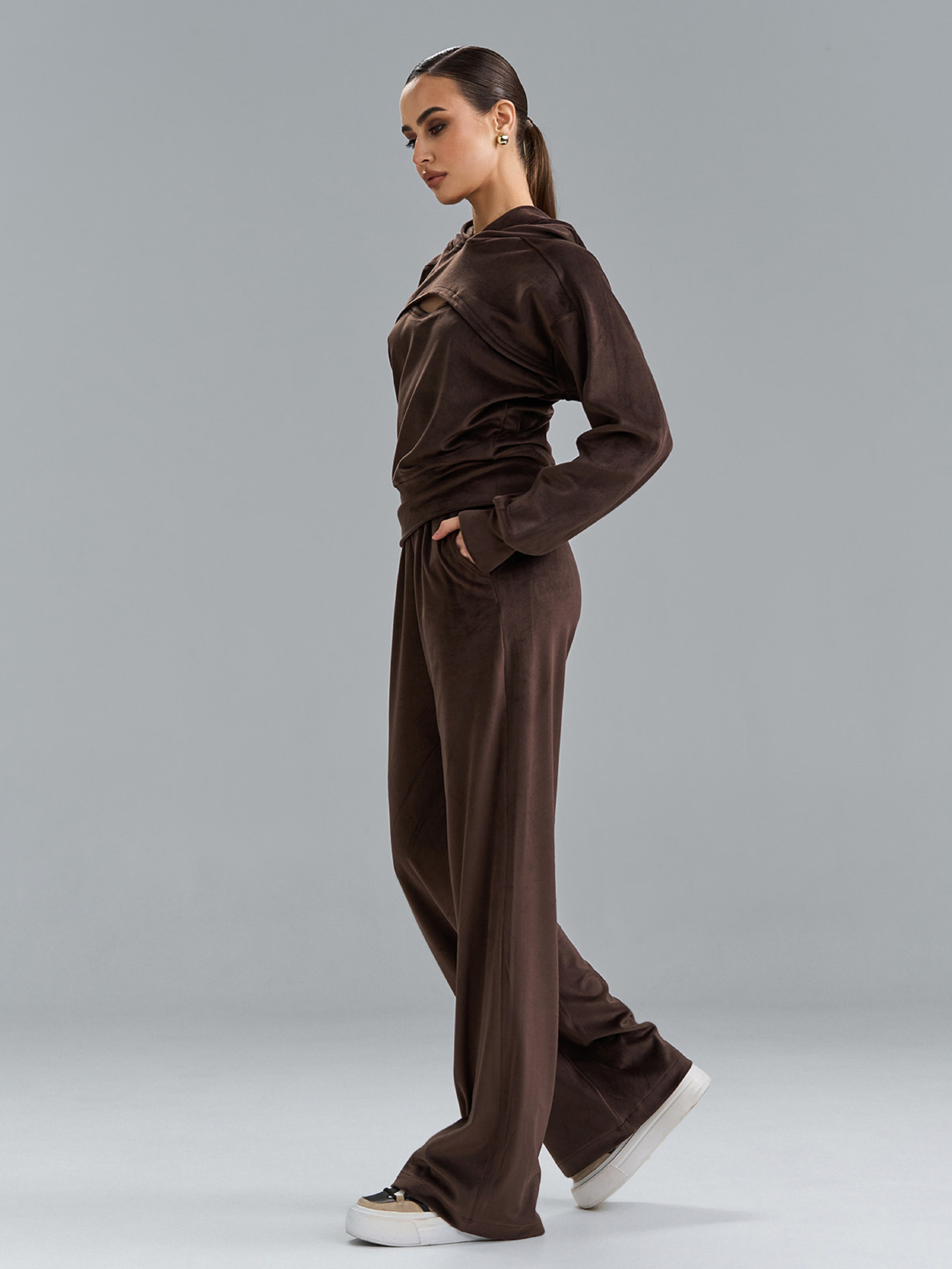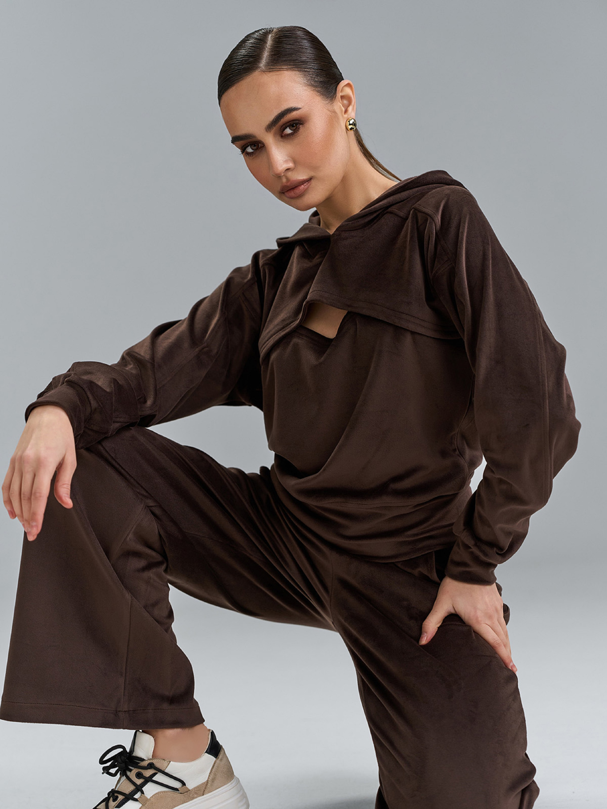 Велюровий темно-коричневий костюм з вирізом на толстовці. Укорочений верх з проймою кажан, довгими рукавами та капюшоном. Широкі штани з кишенями, поясною гумкою та високою посадкою. Напівобхват: Кофта: Грудь: S (49), M (51), L (53), XL (55), XXL (57), 3XL (59), Довжина виробу - 54, Рукав - 56, Штани: Талія: S (30-40), M (32-42), L (36-44), XL (38-46), XXL (40-48), 3XL (42-50), Стегна: S (52), M (54), L (56), XL (58), XXL (60), 3XL (62), Довжина виробу - 104, Довжина по внутрішньому шву - 75, Ткань: Высокой эластичности