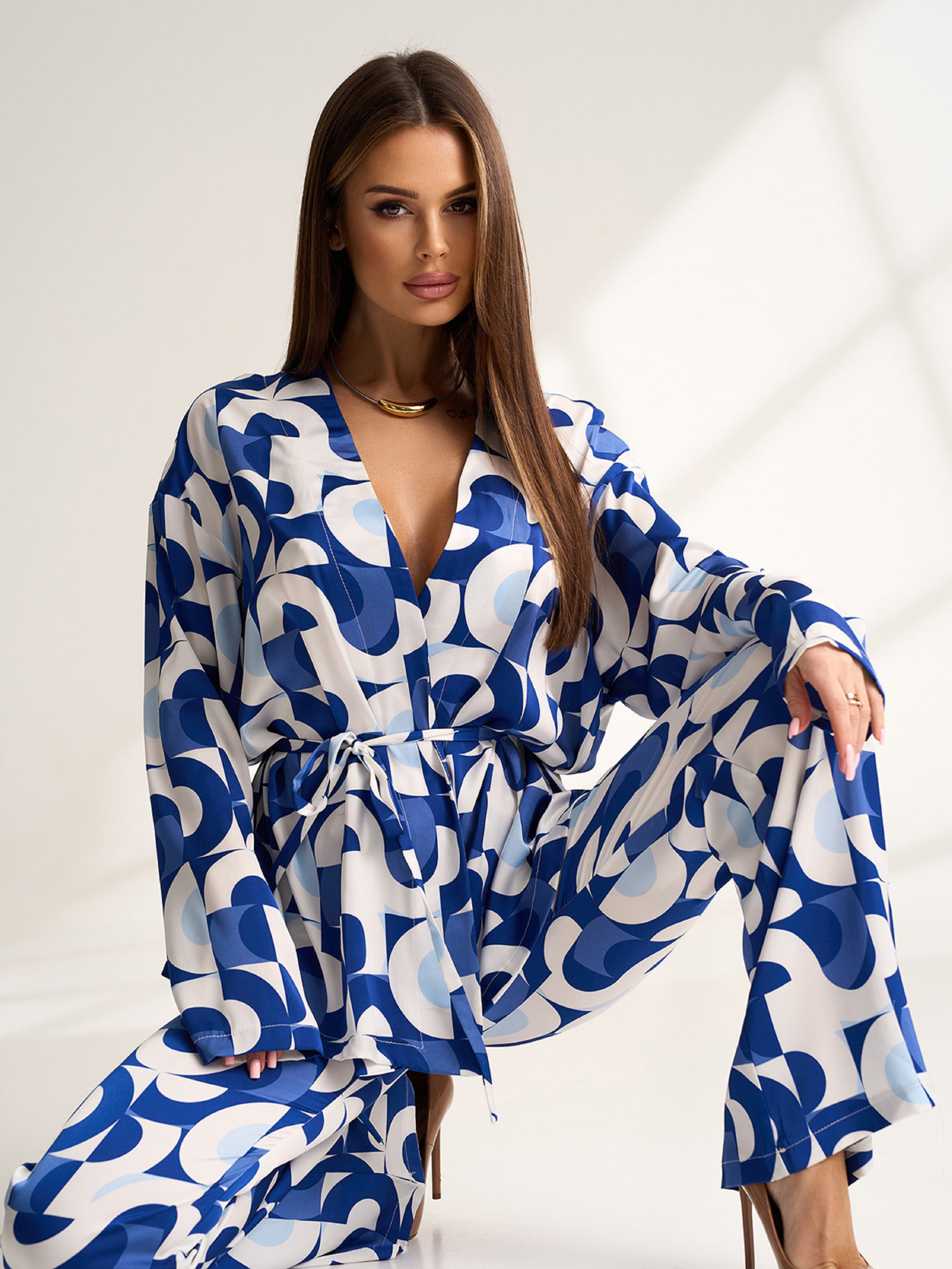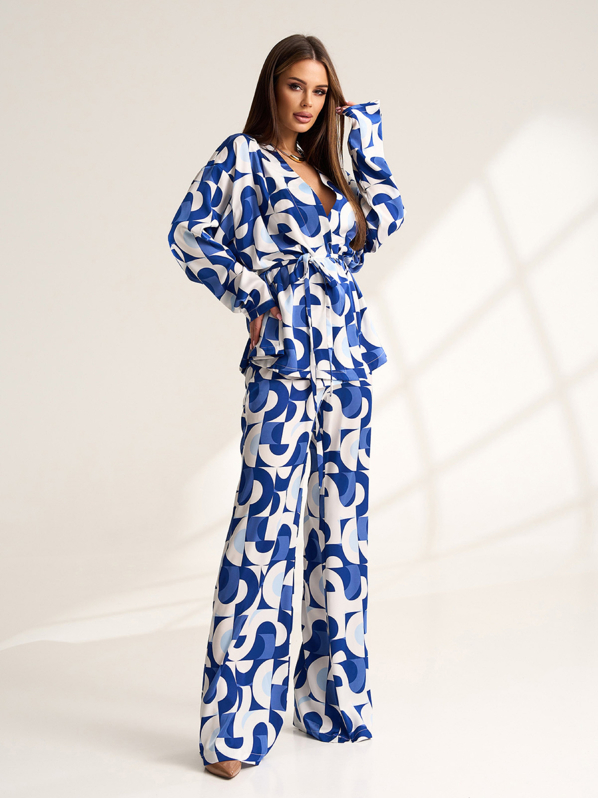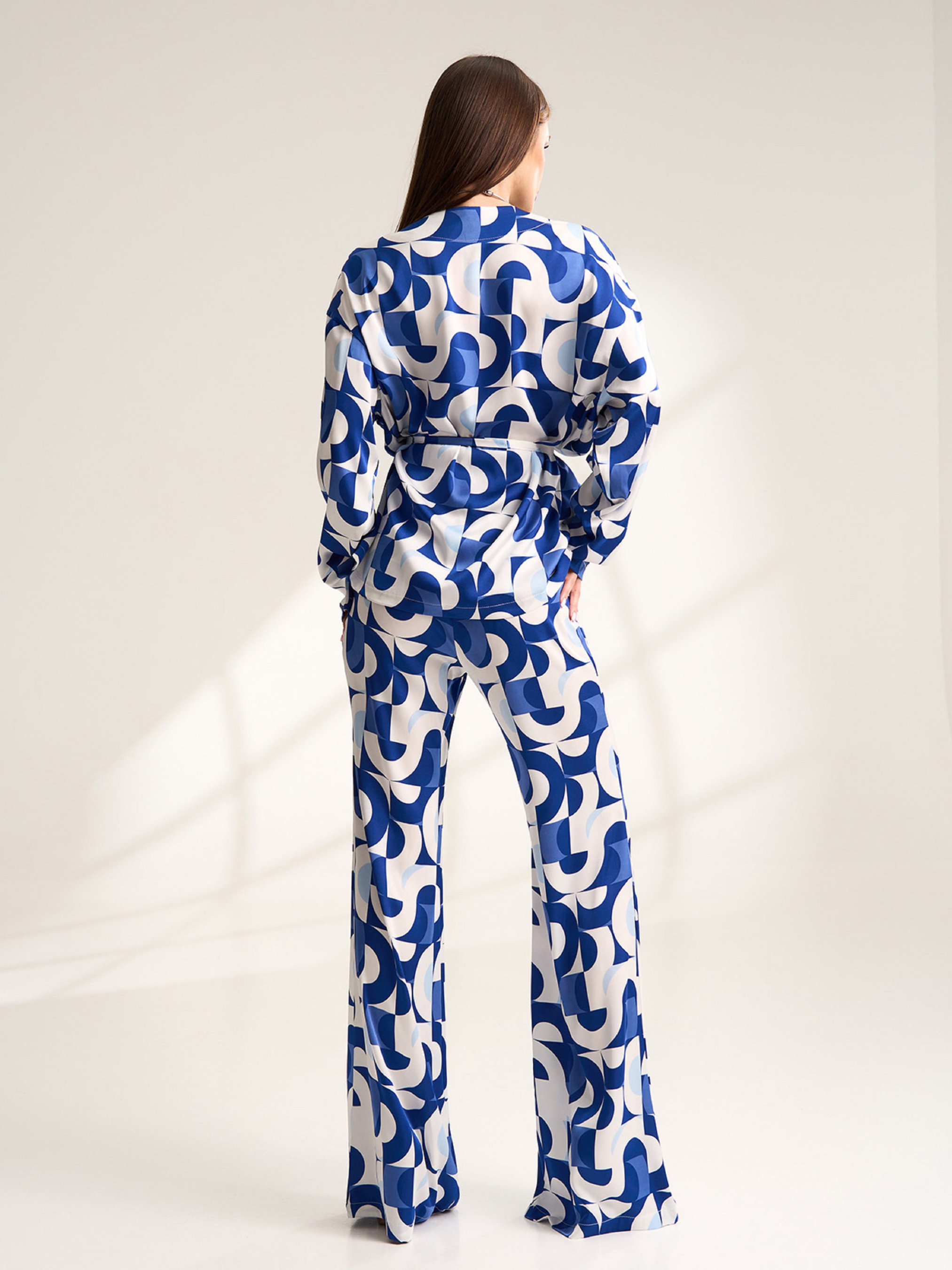 Біло-блакитний костюм-кімоно з брюками кльош від коліна, виконаний з шовкового матеріалу з принтом. Блузка крою на запах з V-подібною горловиною, довгими рукавами та поясом. Штани з поясною гумкою та бічною таємною блискавкою. Напівобхват: Кофта: Грудь: S (61), M (63), L (65), XL (67), Довжина виробу - 66, Рукав - 53, Штани: Талія: S (31-36), M (33-38), L (35-40), XL (37-42), Стегна: S (48), M (50), L (52), XL (54), Довжина виробу - 112, Довжина по внутрішньому шву - 81, Тканина: Низької еластичності.