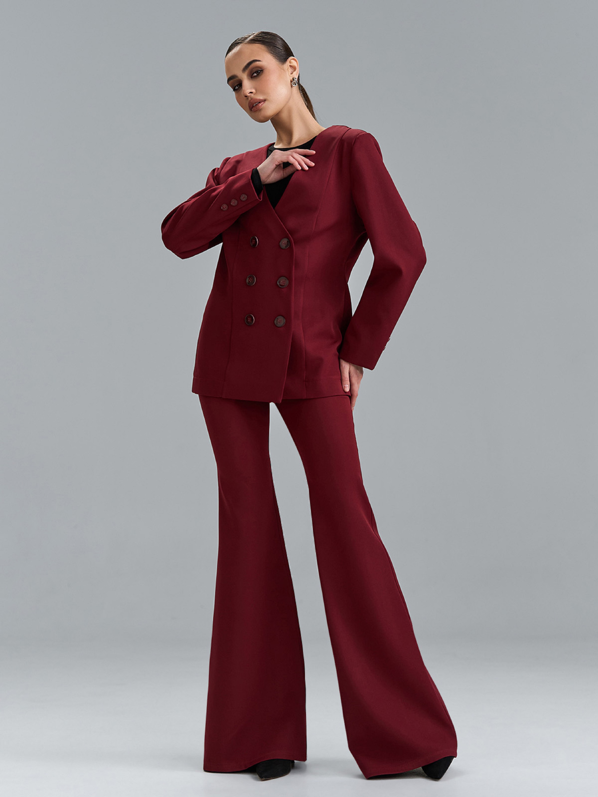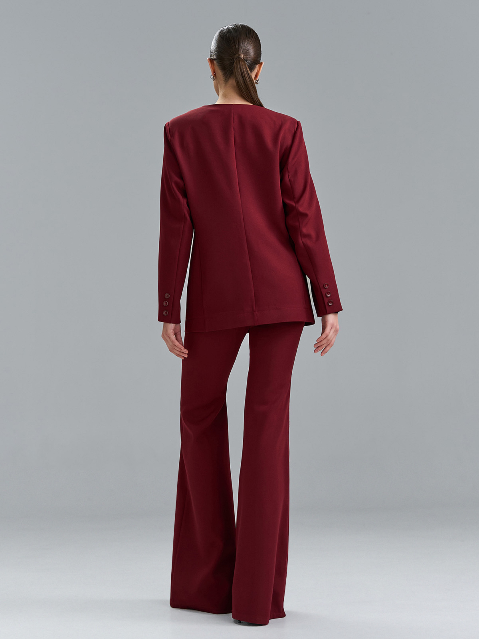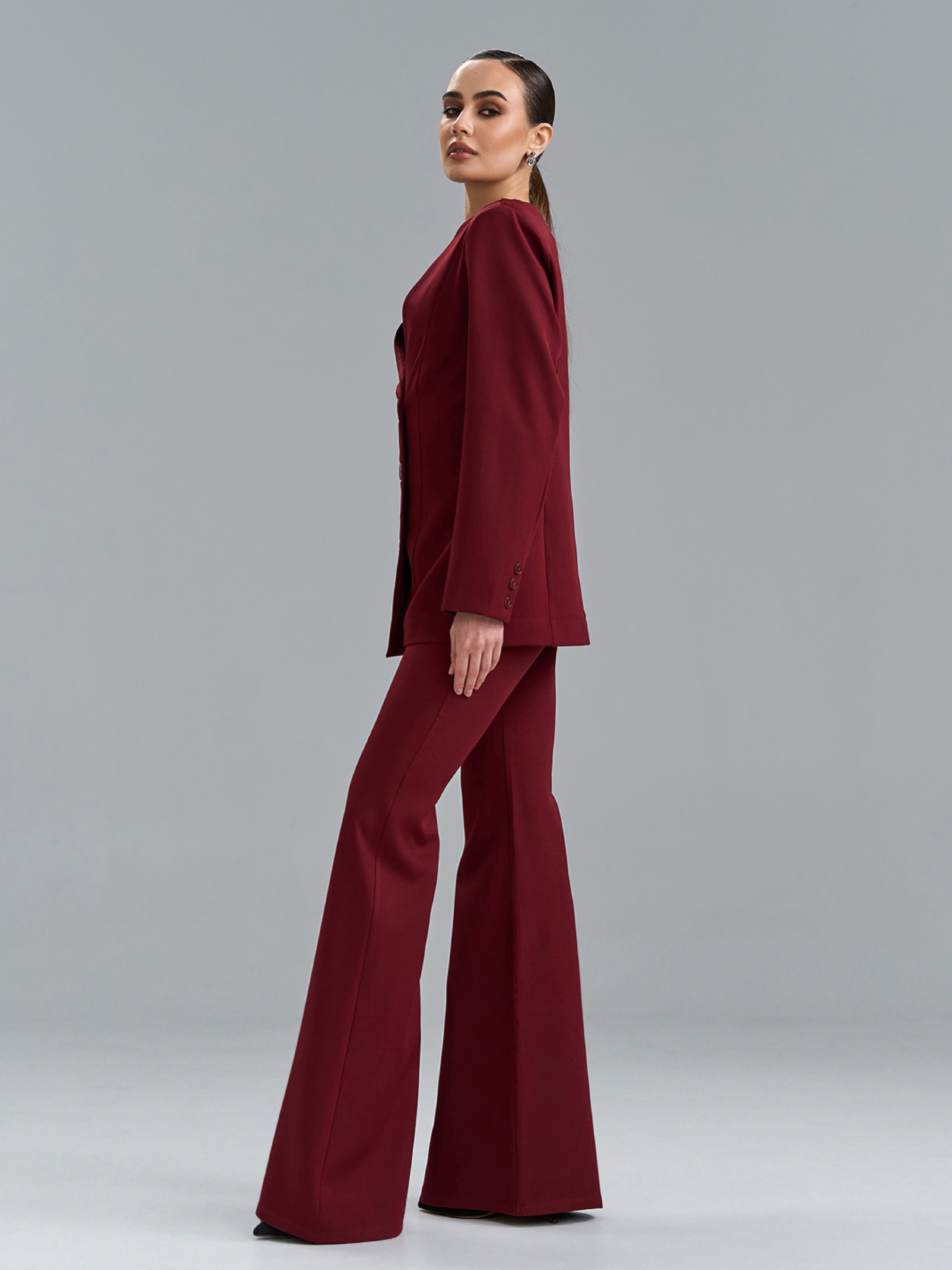 Бордовий костюм із костюмної тканини з приталеним жакетом на двох рядах гудзиків. Жакет з V-подібною горловиною та довгими рукавами з декоративними гудзиками. Штани фасону кльош від коліна з застібками на гудзик та блискавку, ззаду на поясі гумка. Напівобхват: Кофта: Грудь: S (46), M (48), L (50), XL (52), Довжина виробу - 72, Рукав - 60, Штани: Талія: S (33), M (35), L (37), XL (39), Стегна: S (46), M (48), L (50), XL (52), Довжина виробу - 112, Довжина по внутрішньому шву - 86, Ткань: Низкой эластичности