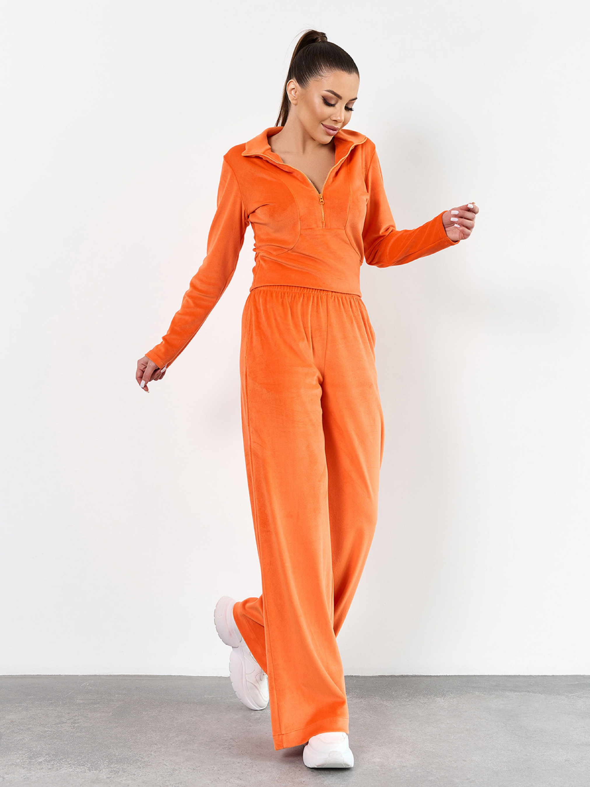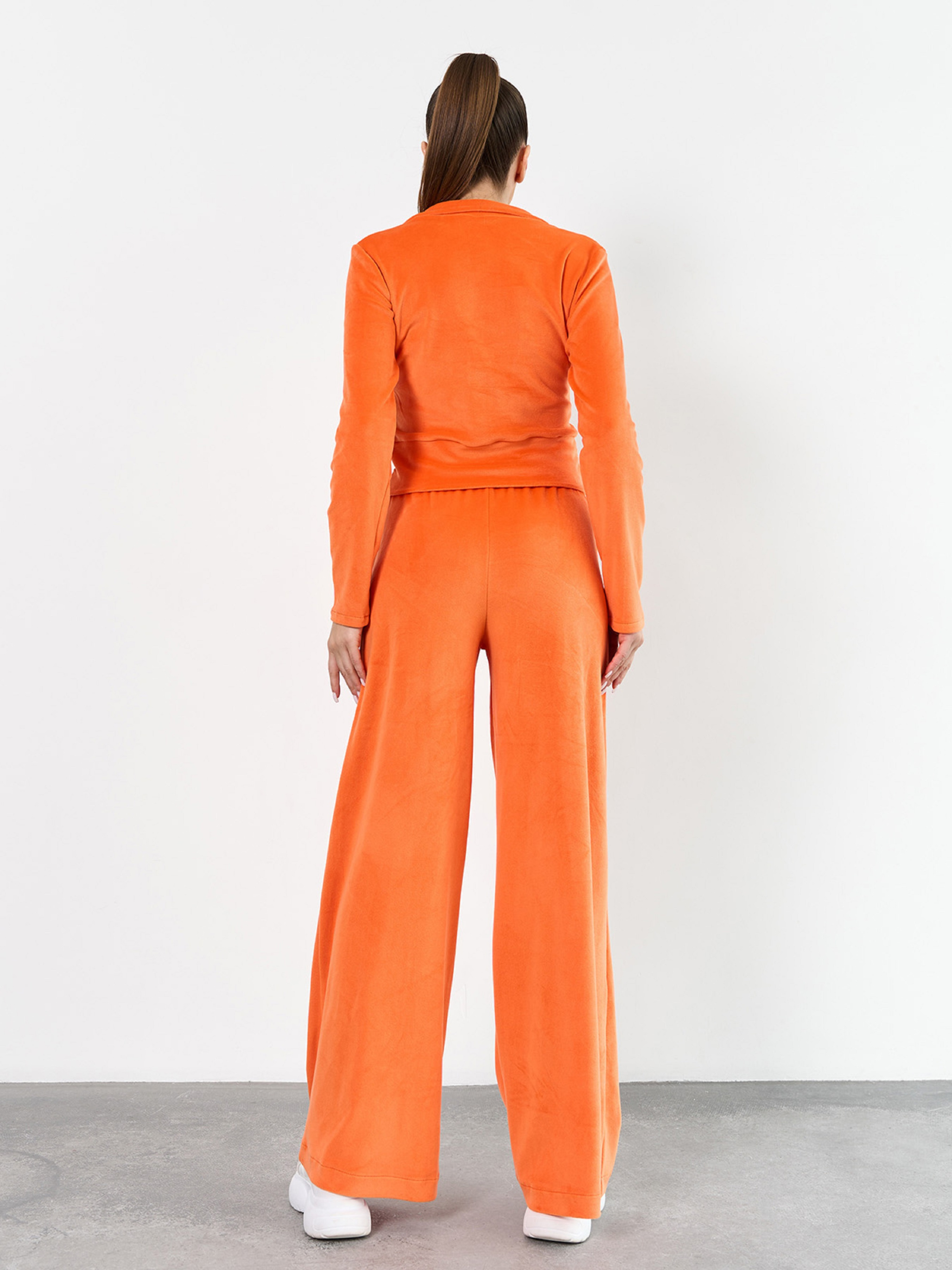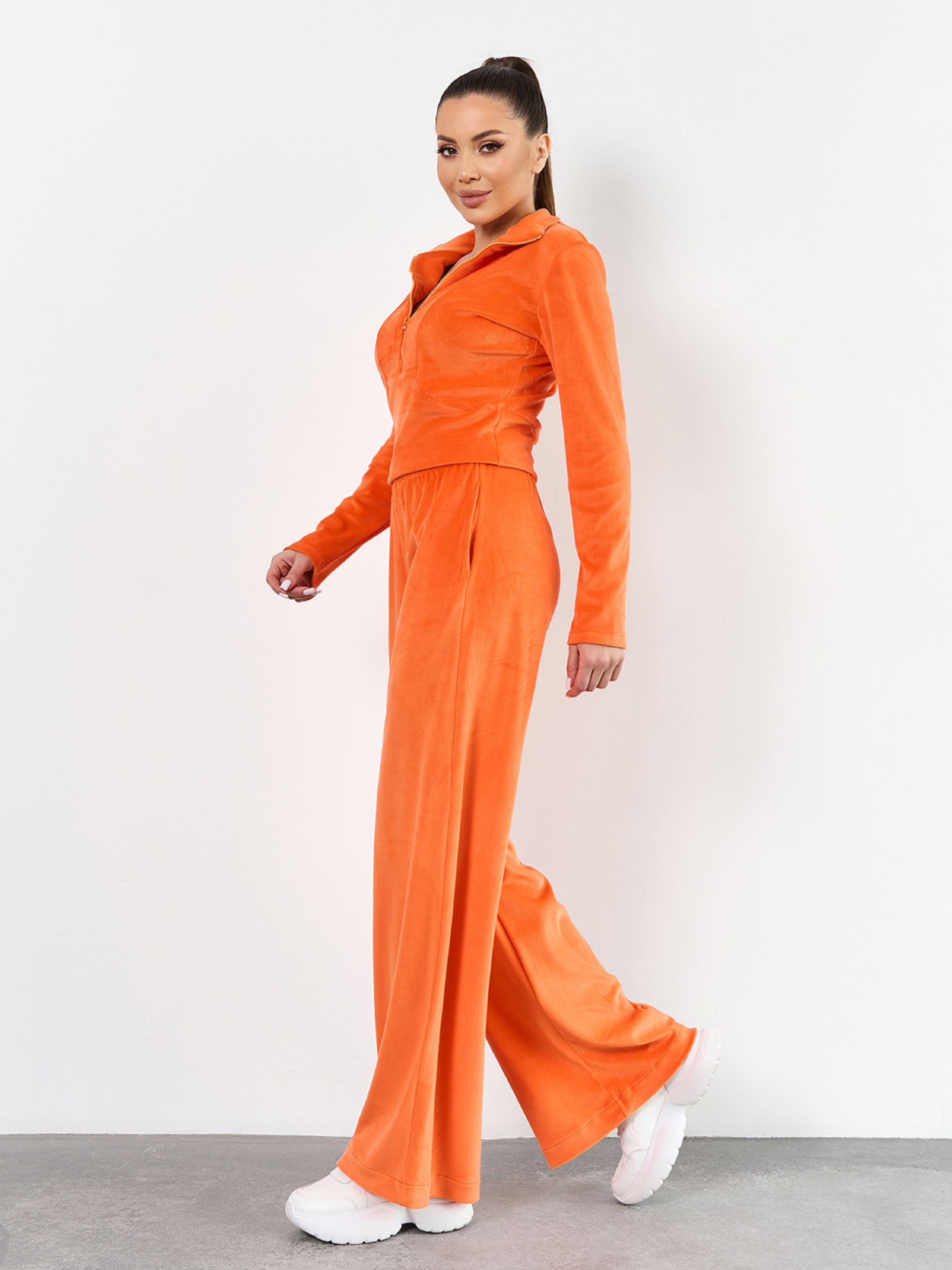 Молодежный костюм из плюшевого велюра оранжевого яркого цвета с широкими брюками и облегающей толстовкой. Толстовка с длинными рукавами, молнией и воротником-стойкой. Брюки высокой посадки с карманами и эластичной резинкой на талии. Полуобхват: Кофта: Грудь: S (40), M (42), L (44), XL (46), Длина изделия - 48, Рукав - 61, Брюки: Талия: S (30-38), M (32-40), L (34-42), XL (36-44), Бедра: S (49), M (51), L (53), XL (55), Длина изделия - 106, Длина по внутреннему шву - 75, Ткань: Высокой эластичности.