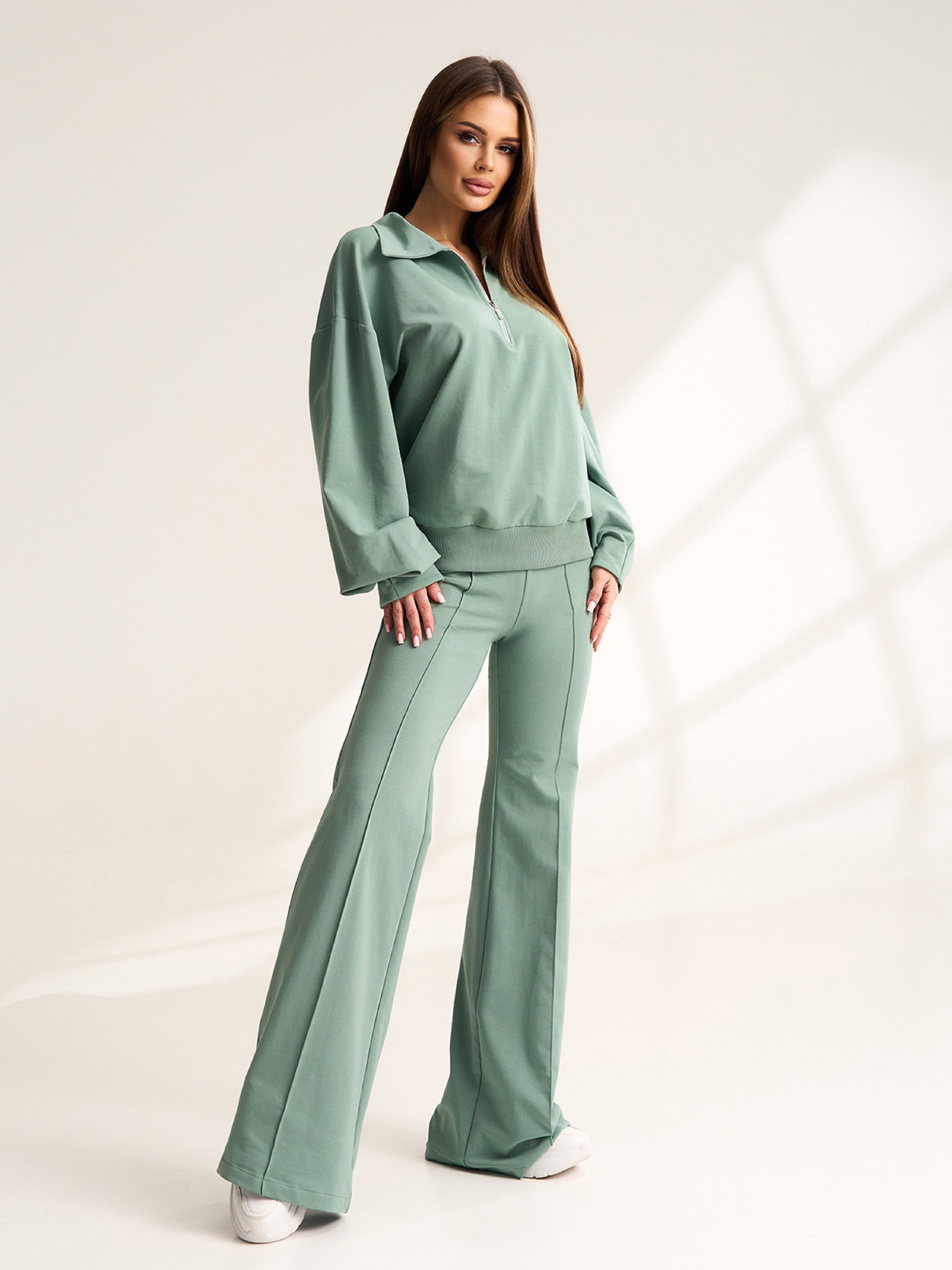 Оливковый молодежный костюм двойка из двухнитного трикотажа пенье. Толстовка с укороченной молнией и воротником оснащена длинными рукавами и манжетами. Брюки буткаты с поясной резинкой и стрелками. Полуобхват: Кофта: Грудь: S (57), M (59), L (61), XL (63), Длина изделия -58-62*, Рукав - 58, Брюки: Талия: S (32), M (34), L (36), XL (38), Бедра: S (45), M (47), L (49), XL (51), Длина изделия - 116, Длина по внутреннему шву - 88, Ткань: Низкой эластичности.