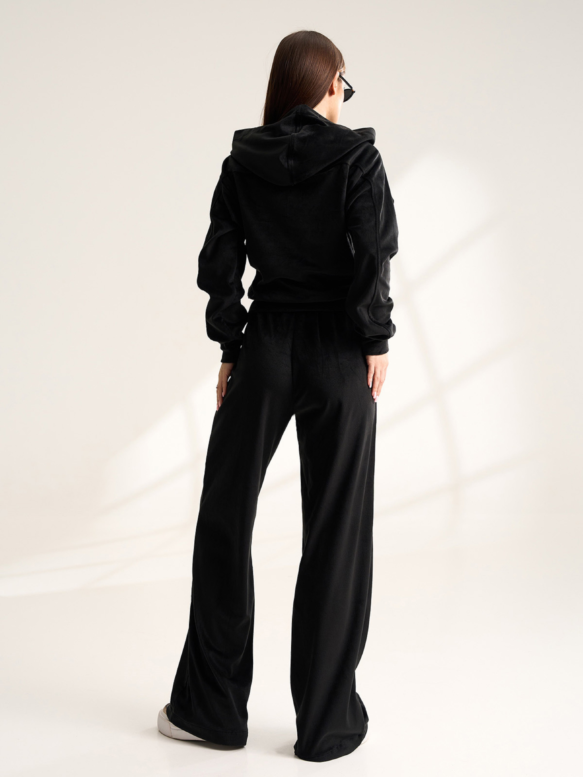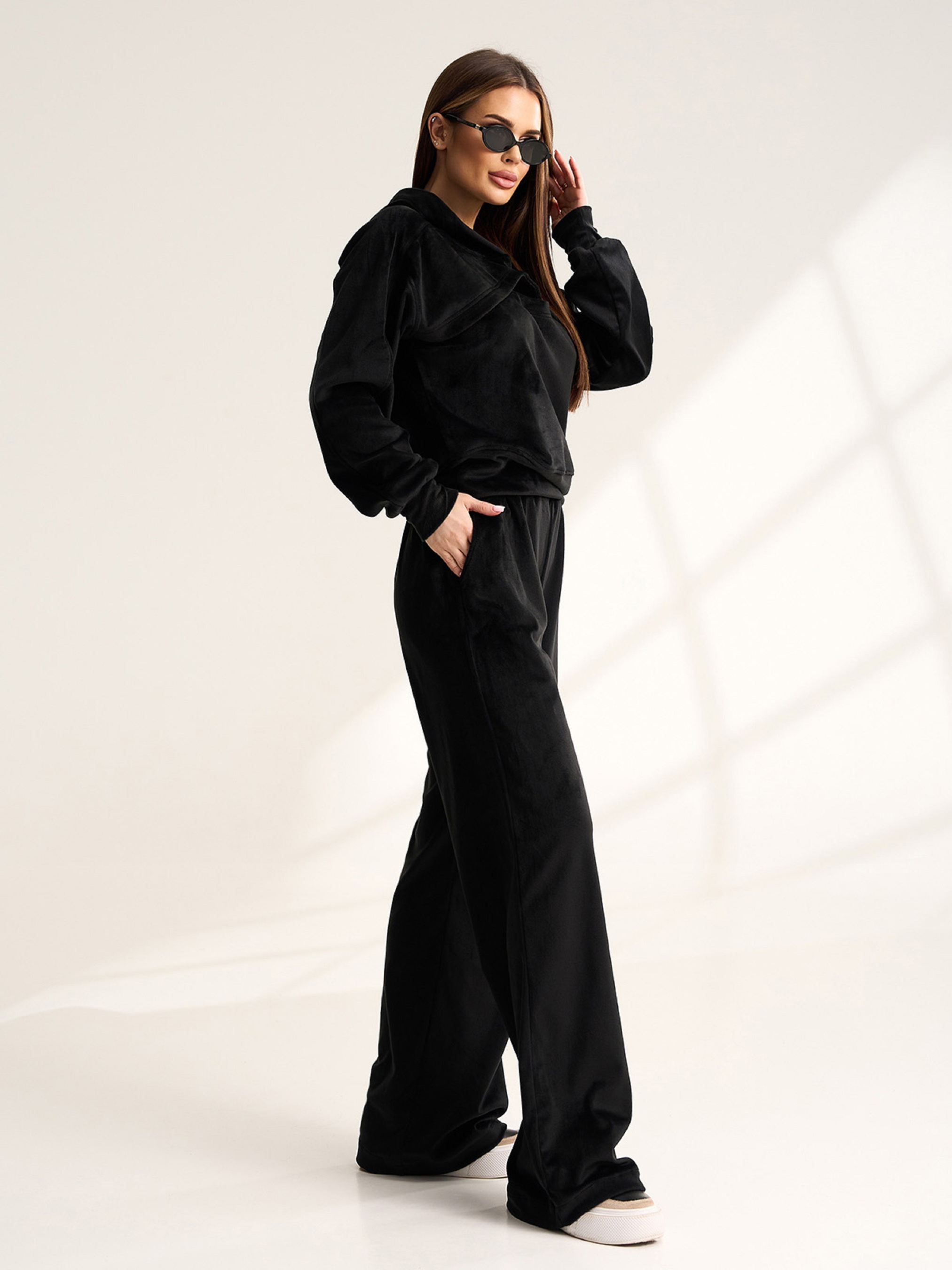 Черный плюшевый костюм с вырезом на толстовке. Полуобхват: Кофта: Грудь: S (49), M (51), L (53), XL (55), XXL (57), 3XL (59), Длина изделия - 54, Рукав - 56, Брюки: Талия: S (30-40), M (32-42), L (36-44), XL (38-46), XXL (40-48), 3XL (42-50), Бедра: S (52), M (54), L (56), XL (58), XXL (60), 3XL (62), Длина изделия - 104, Длина по внутреннему шву - 75, Ткань: Высокой эластичности