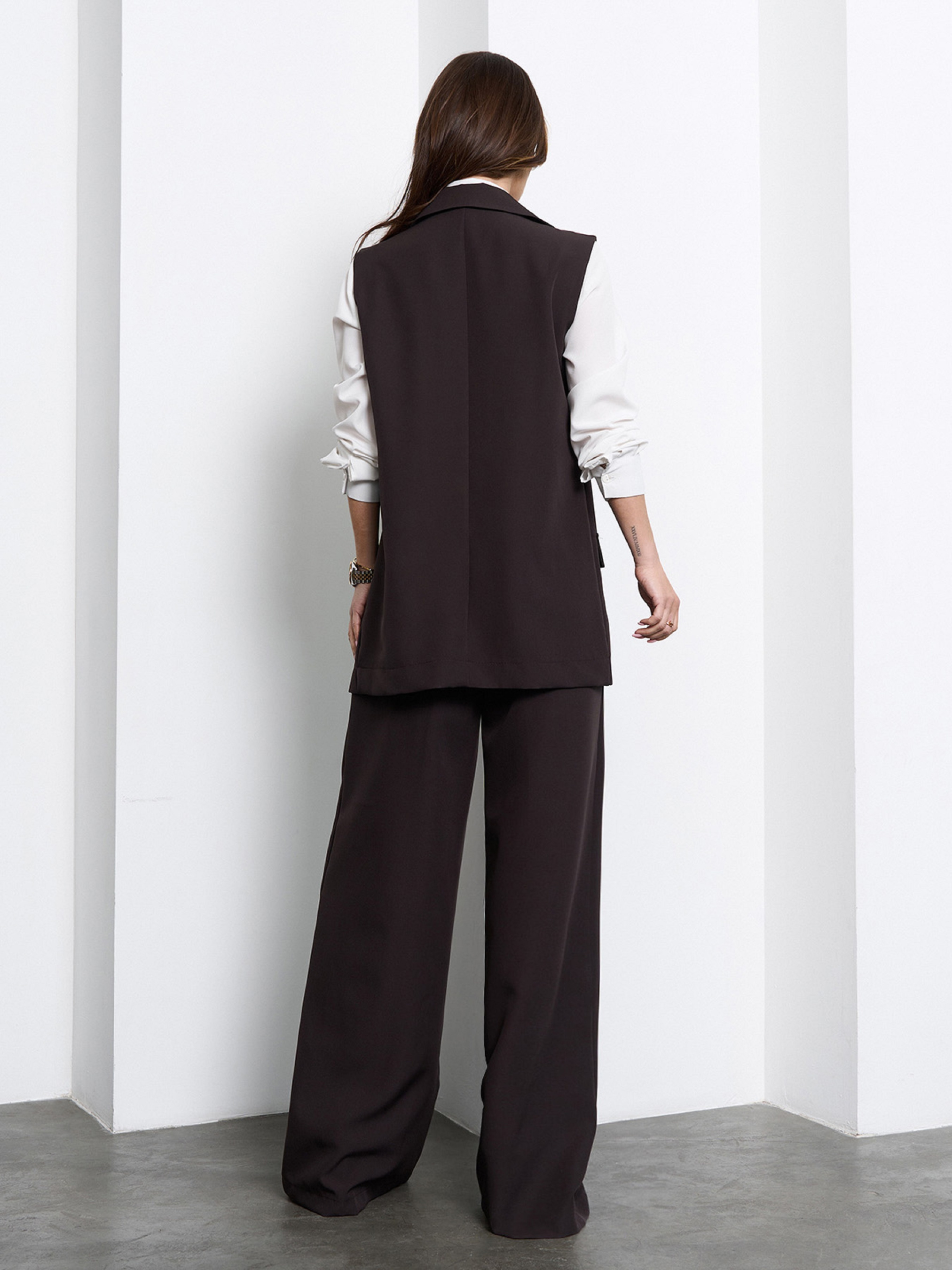 Темно-коричневый деловой костюм с удлиненным жилетом, выполненный из костюмки. Жилет на пуговицах с V-образной горловиной, декоративными клапанами и нагрудной листочкой. Брюки высокой посадки с широким прямым кроем, карманами и стрелками. Модель на молнии и пуговице. Полуобхват: Жилет: Грудь: S (49), M (51), L (53), XL (55), Длина изделия - 72, Брюки: Талия: S (32), M (34), L (36), XL (38), Бедра: S (52), M (54), L (56), XL (58), Длина изделия - 108, Длина по внутреннему шву - 79, Ткань: Низкой эластичности.