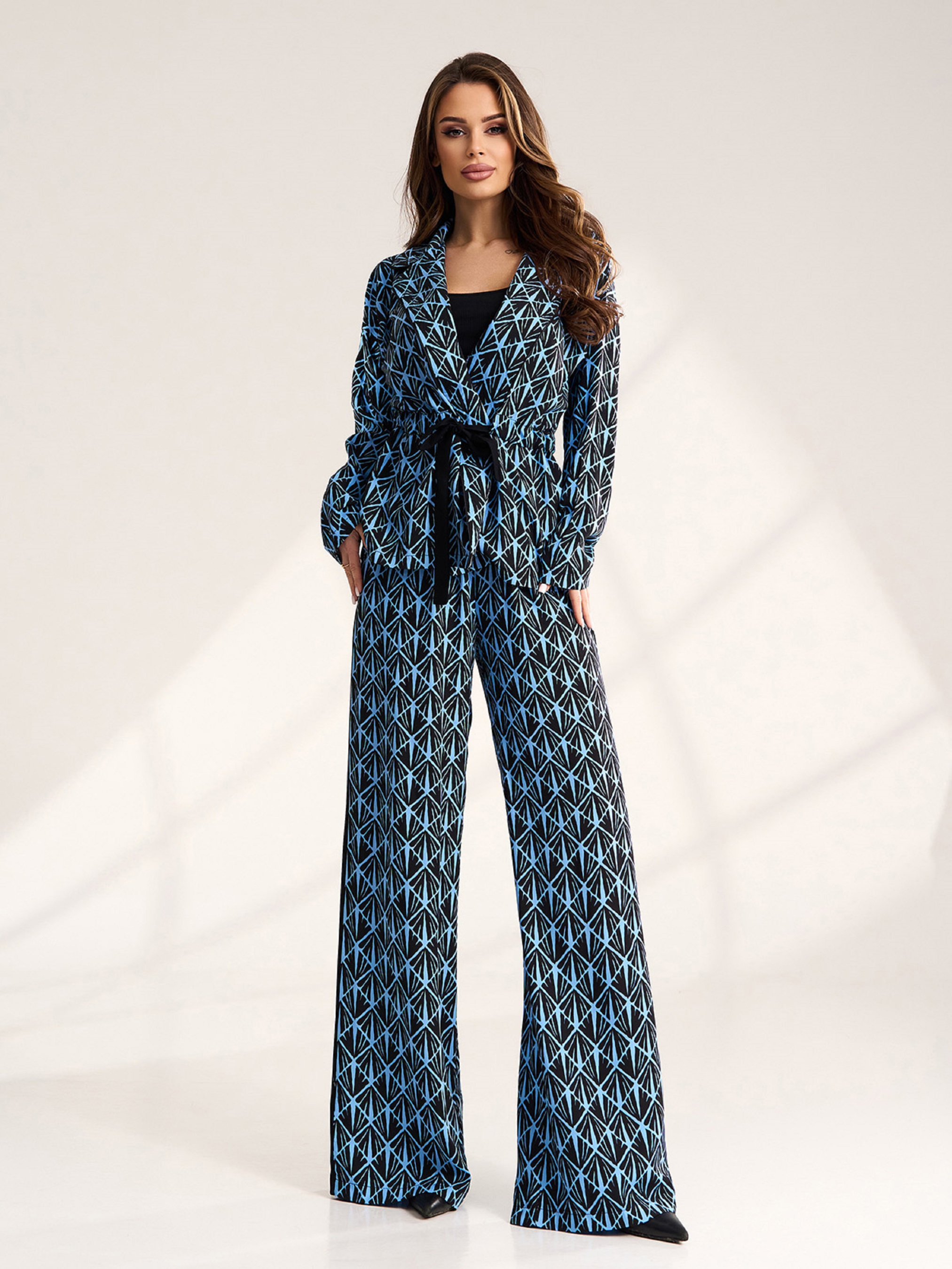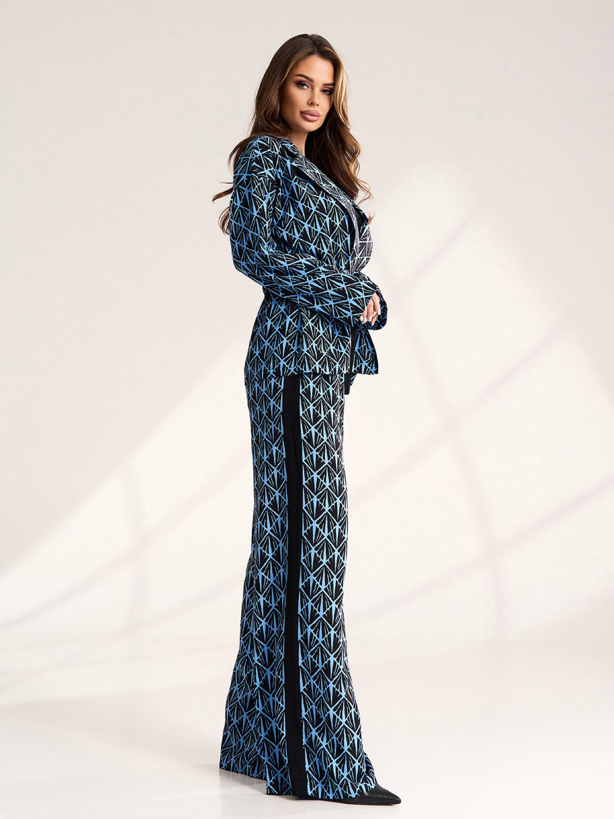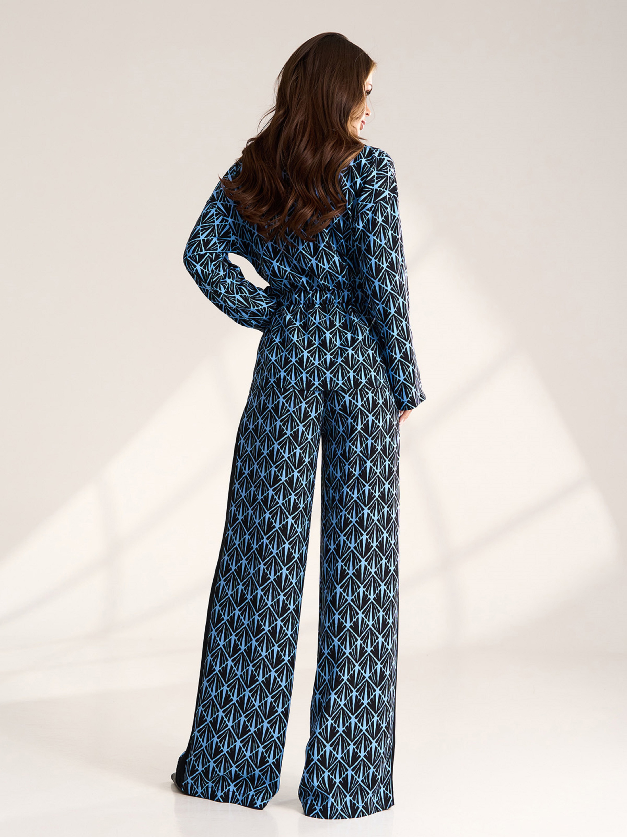 Черно-голубой костюм-кимоно, выполненный из штапеля с лампасами и геометрическим принтом. Блуза с длинными рукавами и воротником приталена кулиской. Брюки палаццо широкого кроя с поясной резинкой и высокой посадкой. Полуобхват: Кофта: Грудь: S (51), M (53), L (55), XL (57), Длина изделия - 67, Рукав - 53, Брюки: Талия: S (31-36), M (33-38), L (35-40), XL (37-42), Бедра: S (55), M (57), L (59), XL (60), Длина изделия - 109, Длина по внутреннему шву - 78, Ткань: Низкой эластичности.