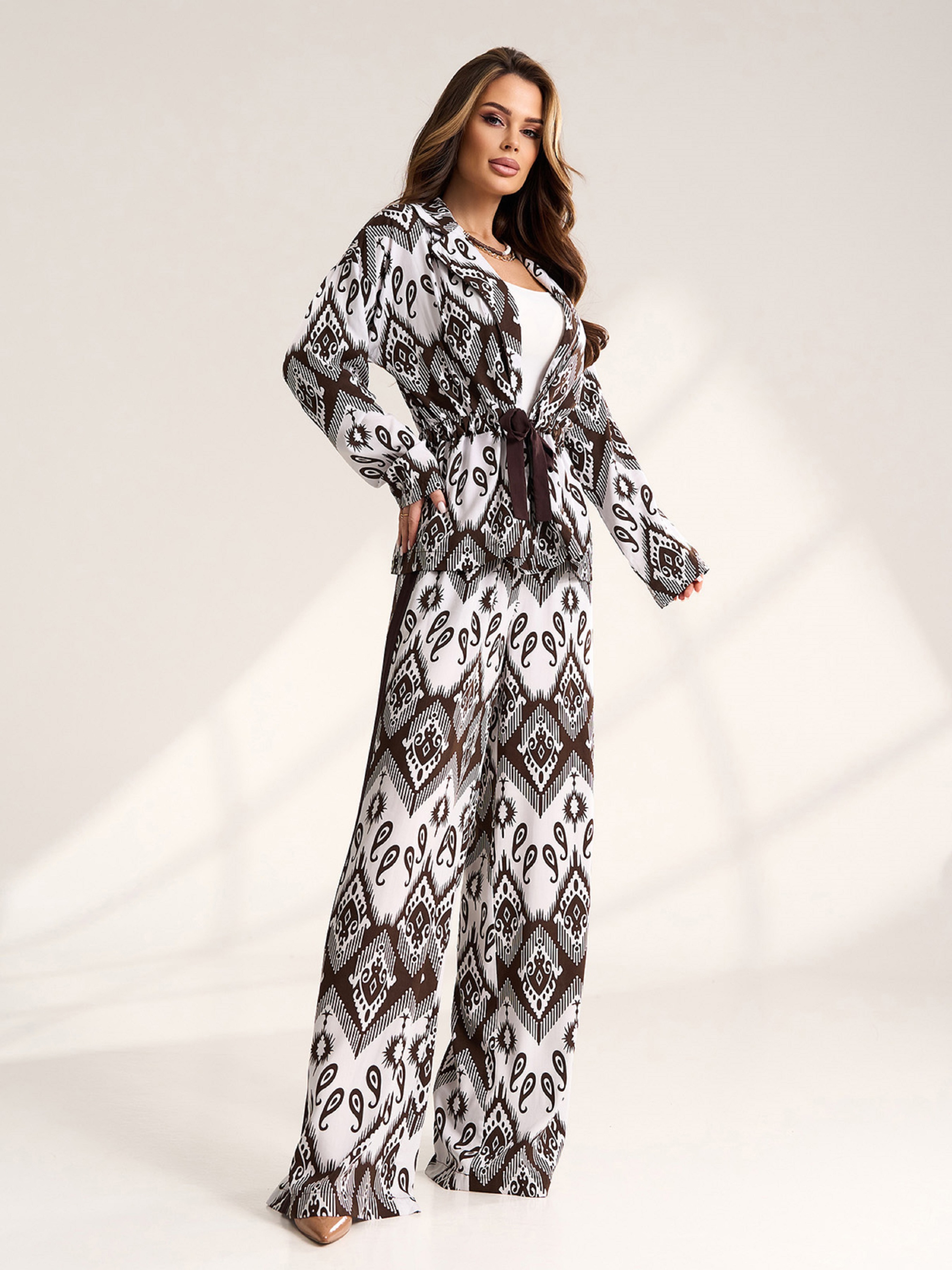 Коричнево-белый легкий штапельный костюм-кимоно с орнаментом. Приталенная блуза на кулиске с длинными рукавами и воротником. Брюки палаццо широкого кроя с поясной резинкой и лампасами. Полуобхват: Кофта: Грудь: S (51), M (53), L (55), XL (57), Длина изделия - 67, Рукав - 53, Брюки: Талия: S (31-36), M (33-38), L (35-40), XL (37-42), Бедра: S (55), M (57), L (59), XL (60), Длина изделия - 109, Длина по внутреннему шву - 78, Ткань: Низкой эластичности.