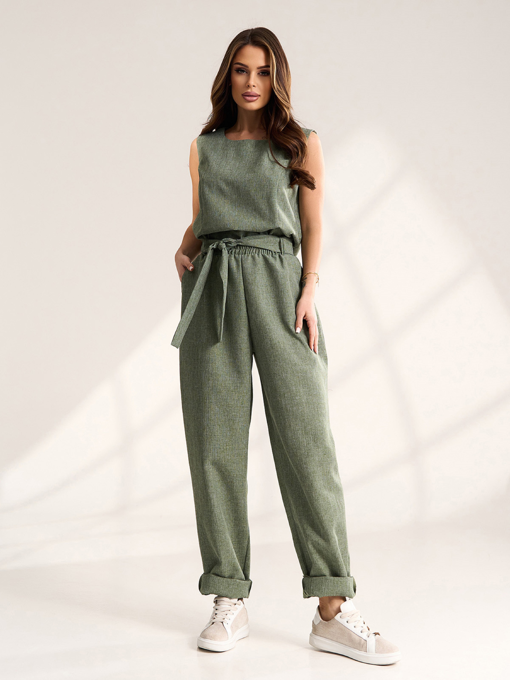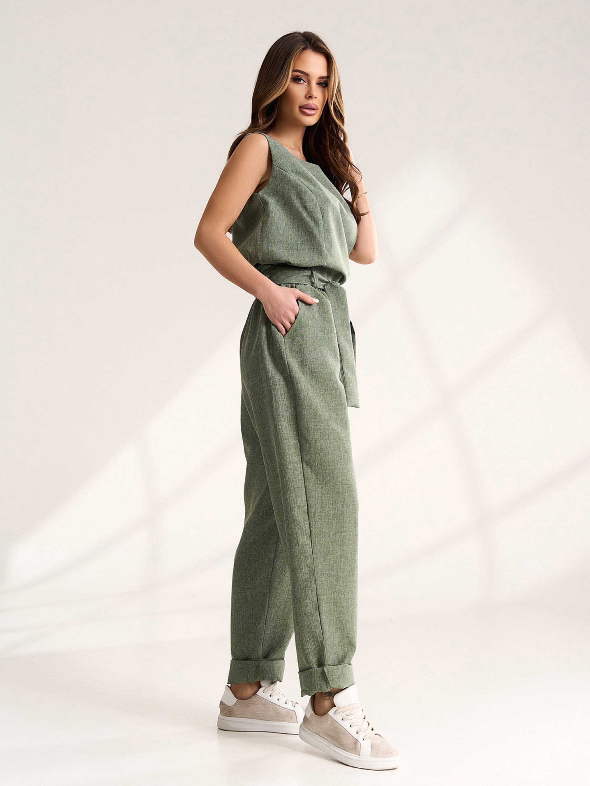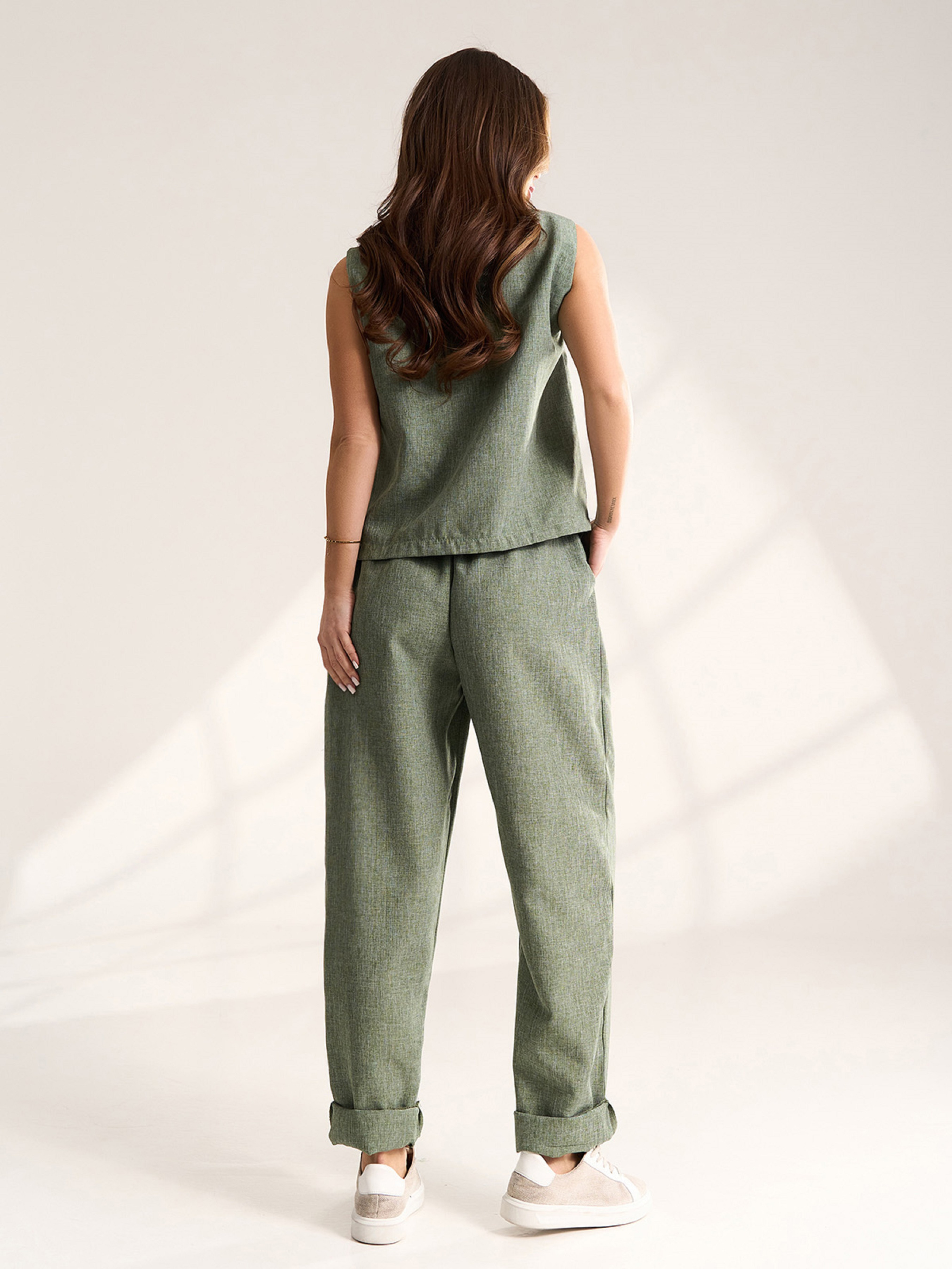 Легкий брючный костюм цвета хаки из льна с топом без рукавов. Брюки бананы с карманами, поясной резинкой и съемным поясом. Топ прямого кроя с полукруглой горловиной и прямым свободным кроем. Полуобхват: Топ: Грудь: S (50), M (52), L (54), XL (56), Длина изделия - 54, Брюки: Талия: S (32-42), M (34-44), L (36-46), XL (38-48), Бедра: S (57), M (59), L (61), XL (63), Длина изделия - 104, Длина по внутреннему шву - 73, Ткань: Низкой эластичности.