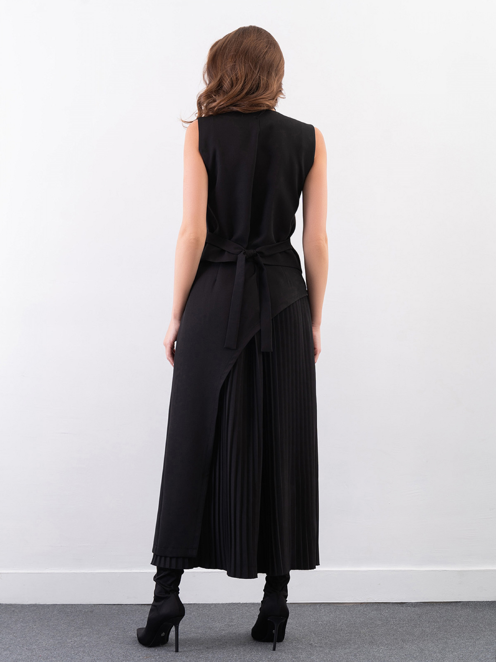 Черный костюм с классическим жилетом на пуговицах, выполненный из костюмки. Модель с углублённым декольте и асимметричным низом оснащена завязкой на спинке. Плиссированная макси юбка с застежкой-молнией и боковой асимметричной вставкой. Полуобхват: Жилет: Грудь: S (42), M (45), L (47), XL (50), Длина изделия - 53, Юбка: Талия: S (32), M (33), L (35), XL (37), Бедра: S (47), M (50), L (53), XL (57), Длина изделия - 90, Ткань: Низкой эластичности