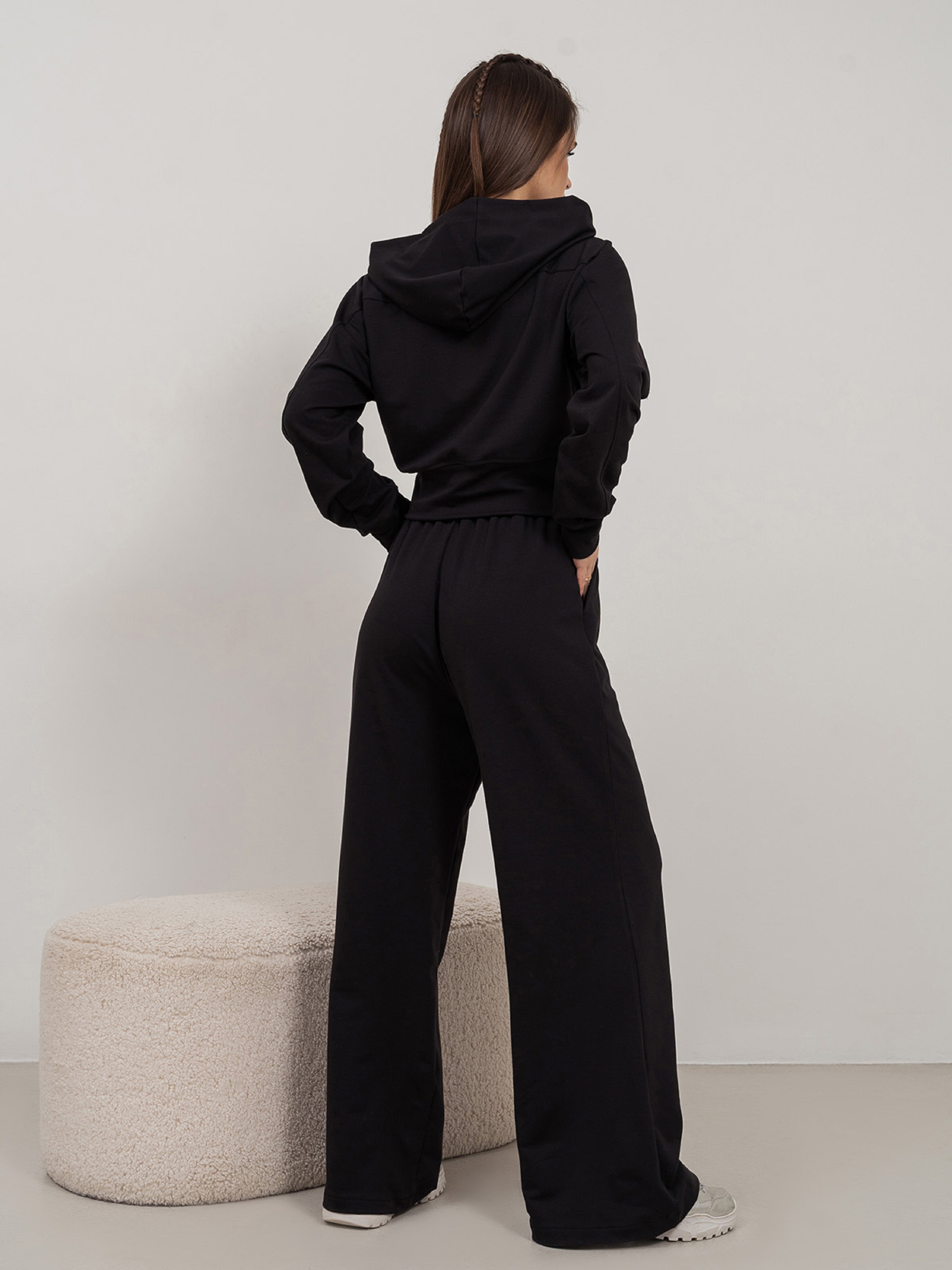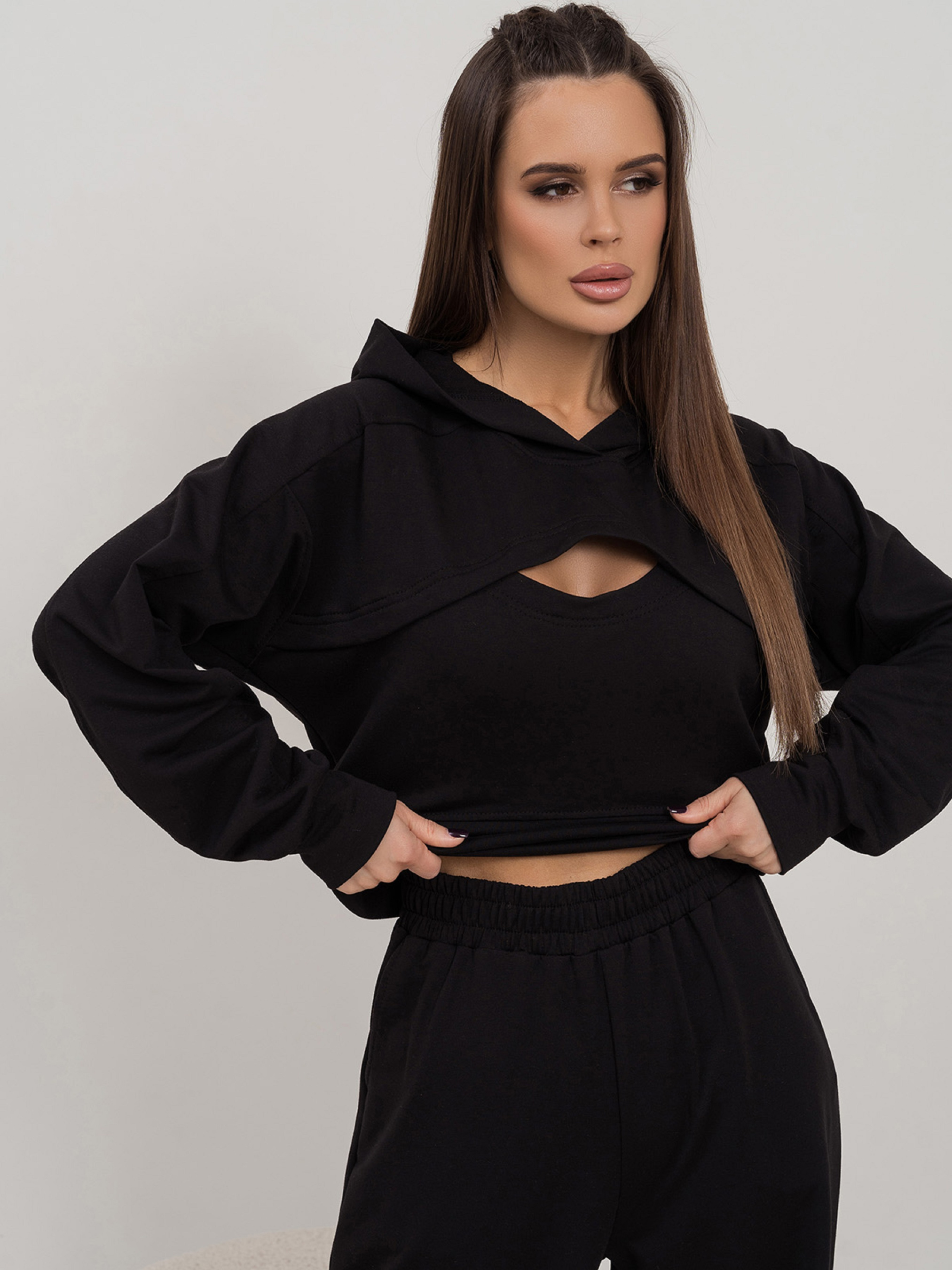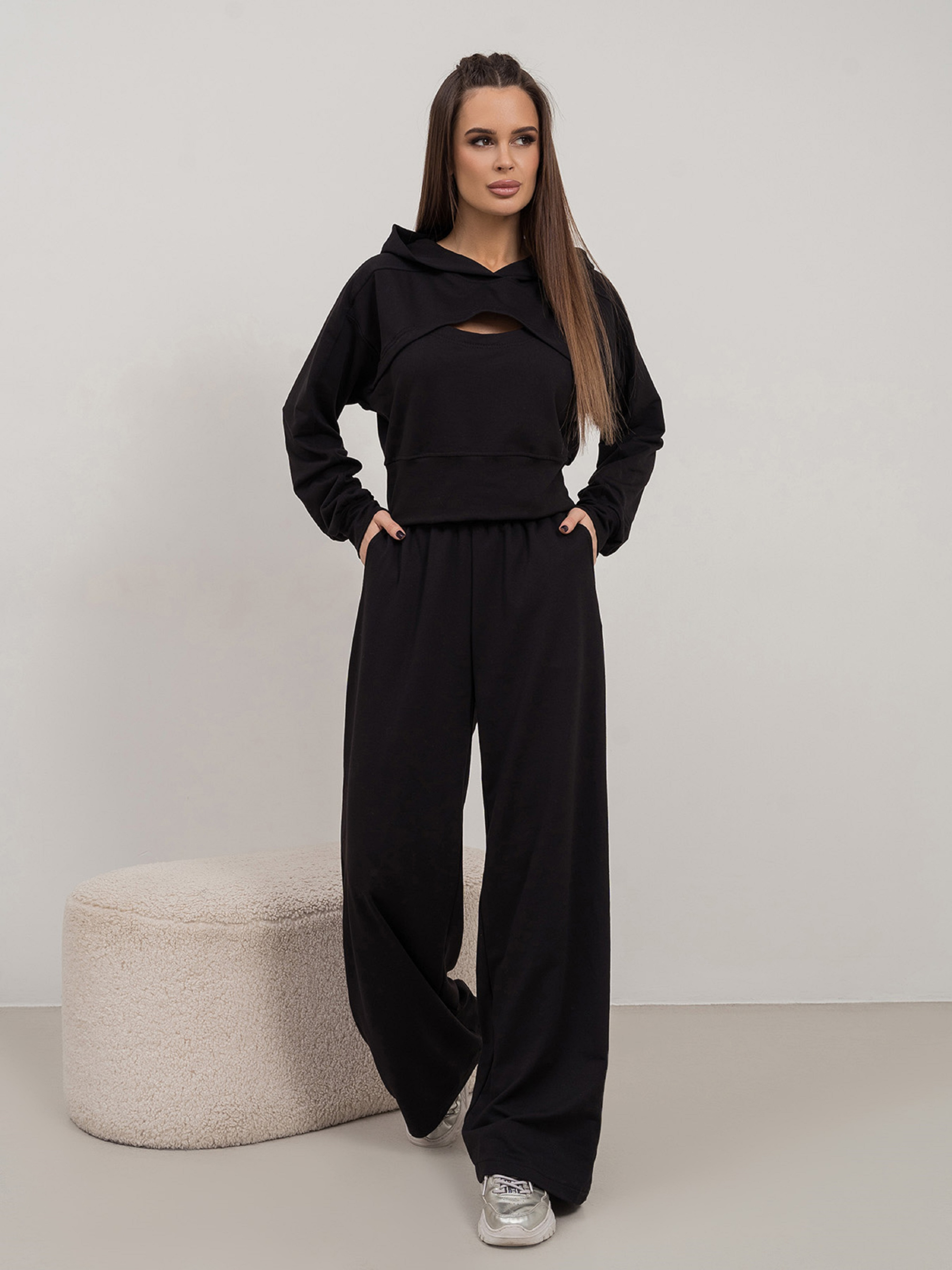 Черный костюм из двухнитного трикотажа с вырезом на груди. Укороченный верх с проймой летучая мышь, длинными рукавами и капюшоном. Широкие брюки с карманами, поясной резинкой и высокой посадкой.Полуобхват: Кофта: Грудь: S (53), M (55), L (57), XL (59), Длина изделия - 47, Рукав - 56, Брюки: Талия: S (32-38), M (34-40), L (36-42), XL (38-44), Бедра: S (54), M (56), L (58), XL (60), Длина изделия - 105, Длина по внутреннему шву - 76, Ткань: Средней эластичности